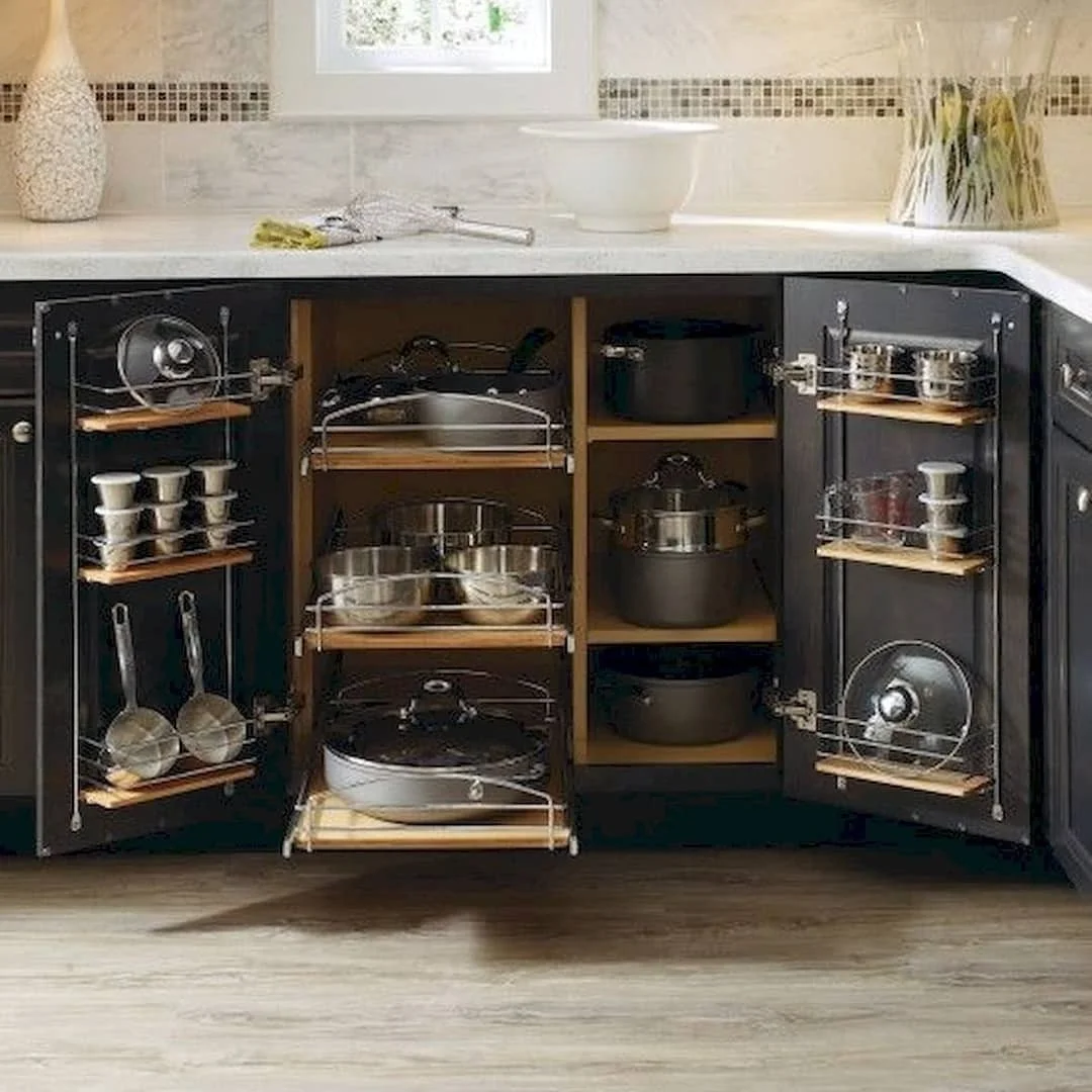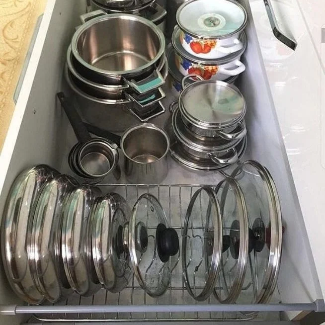 学习一下厨房收纳技巧,利用抽屉、拉篮、收纳架、挡板、收纳袋,把锅具和锅盖收纳得整整齐齐,既省空间,又好拿取!