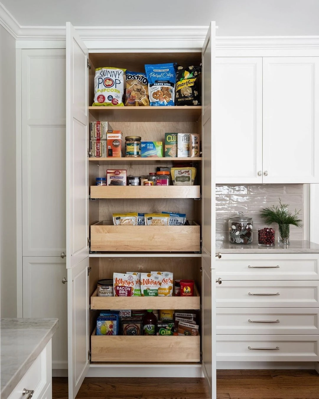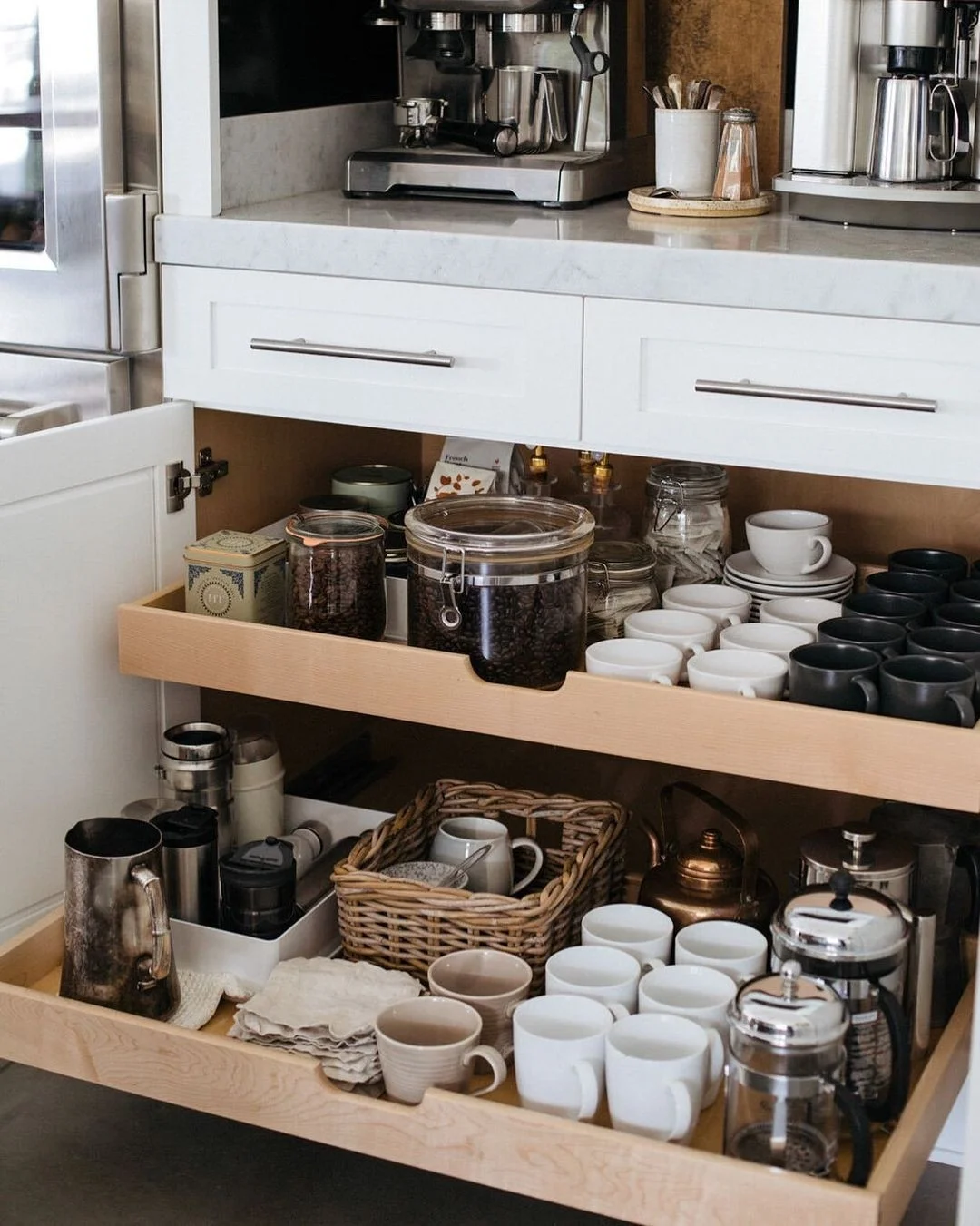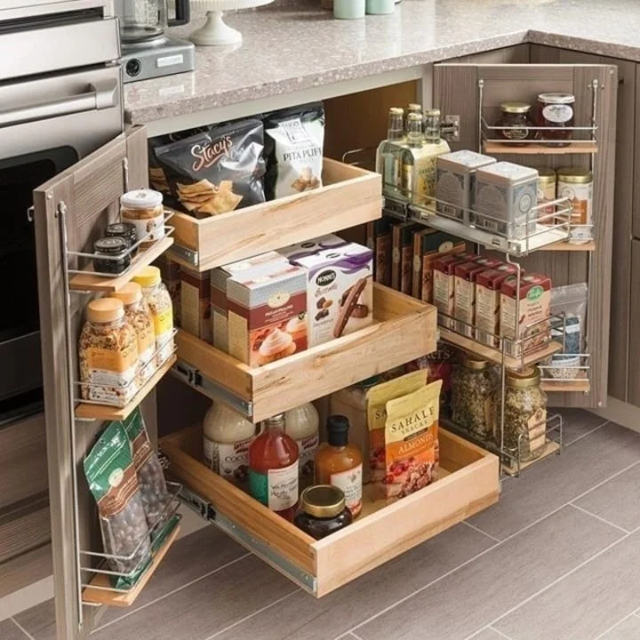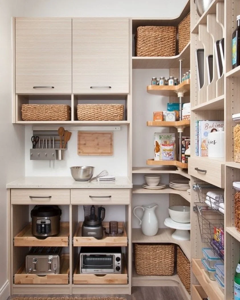 利用厨房1-2平米空间,定制储物柜,增加抽屉拉篮分类收纳,柜门也可以收纳,整齐好拿取。