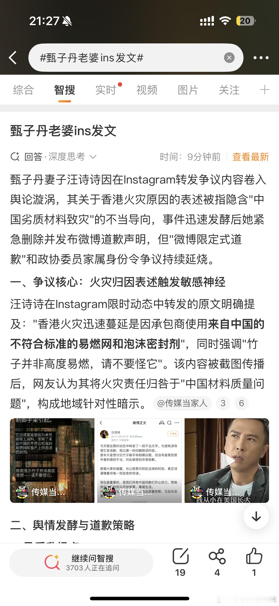 甄子丹老婆ins发文甄子丹老婆汪诗诗道歉,称原本只是想讨论竹子脚手架是否防火