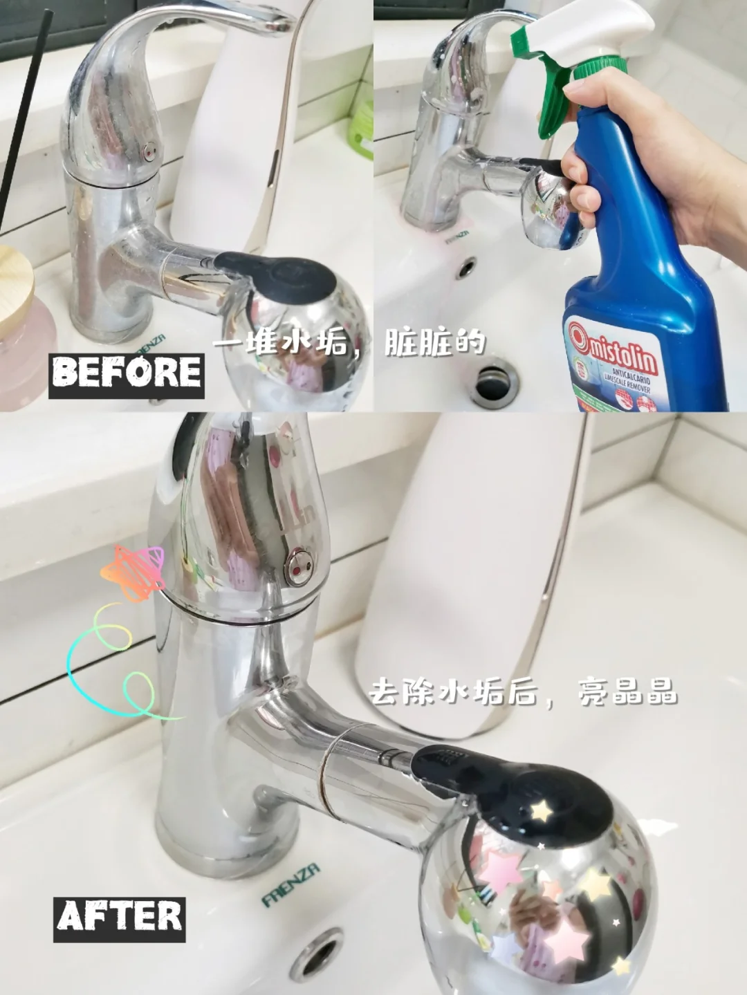 水龙头、花洒🚿这些容易有水垢的地方,时间长了显得特别脏,用这个清洁剂喷一喷,静止几分钟,用清水洗掉,东西就变得亮晶晶✨啦。喷头嘴同样是需要90度旋转才可以使用,比较安全。