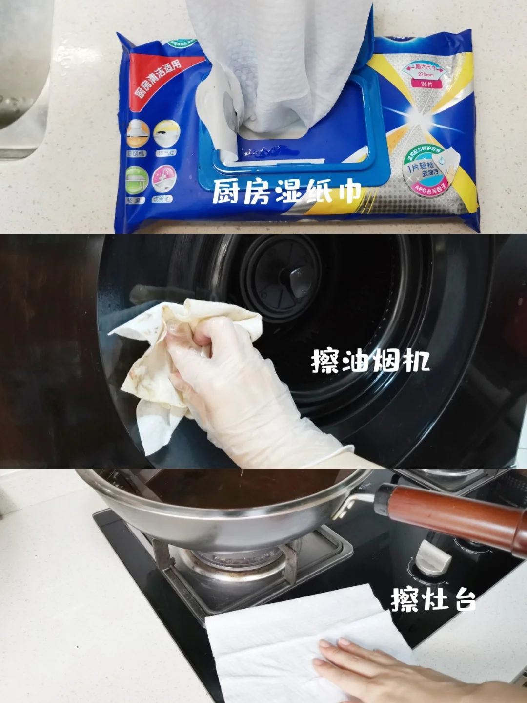 做完菜,灶台油油脏脏😠的,用一张厨房湿纸巾就可以擦干净,hin大一张湿巾,可以顺便把油烟机面板,旁边微波炉也清洁一下。
