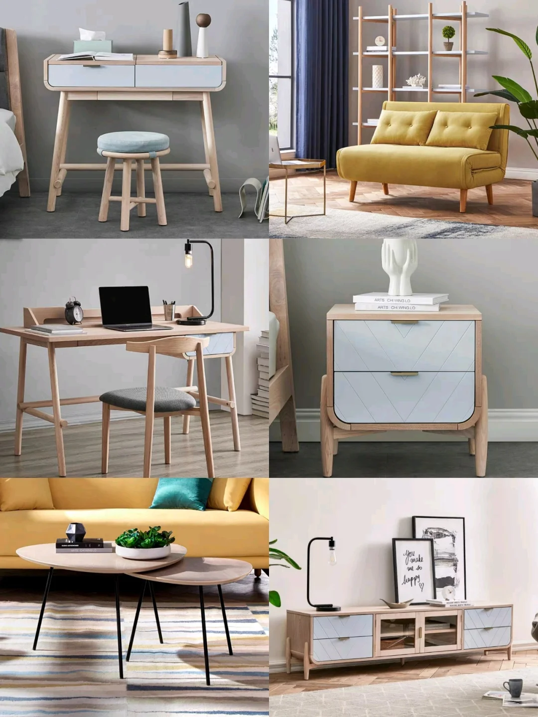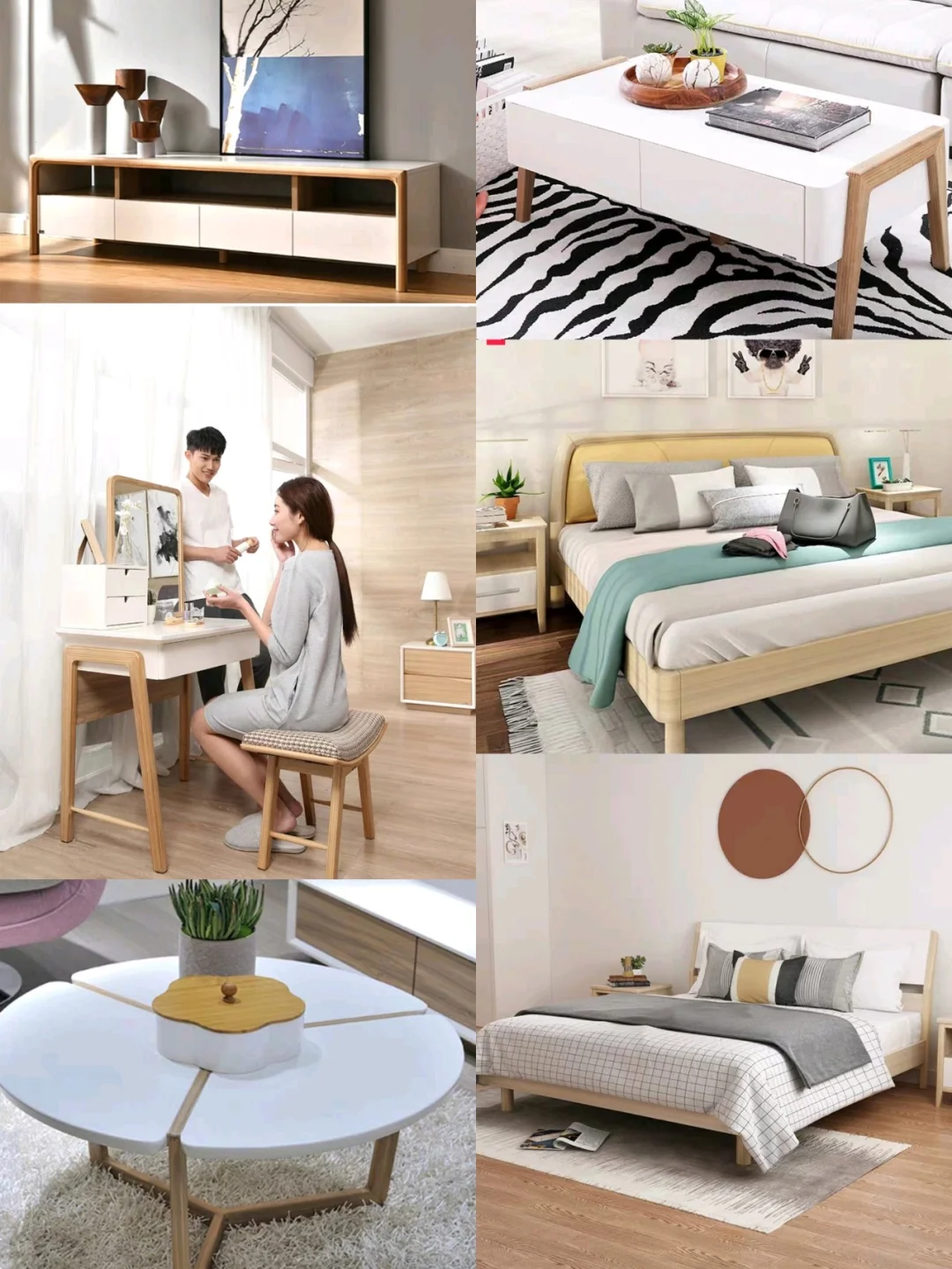 主要是板式家具较多,其中轻时尚系列比较偏向北欧风格,颜色是浅枫木色为主,有些会拼白色,尺寸较小,小户型也可以考虑,🔸电视柜、茶几、梳妆台、床都是我觉得不错的。