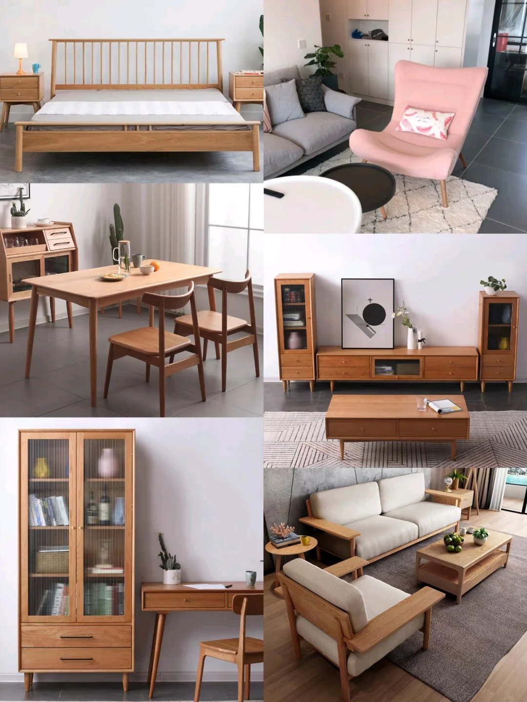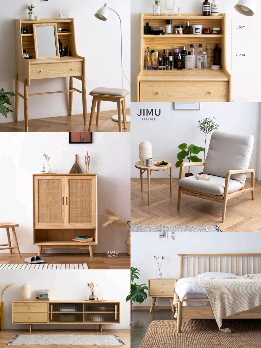 这家家具有点北欧风,偏向日式风,造型上都展现出一种贴近自然的美感,没有那些多余的装饰。🔸梳妆台、鞋柜、单人椅、电视柜、床,都是我喜欢的。