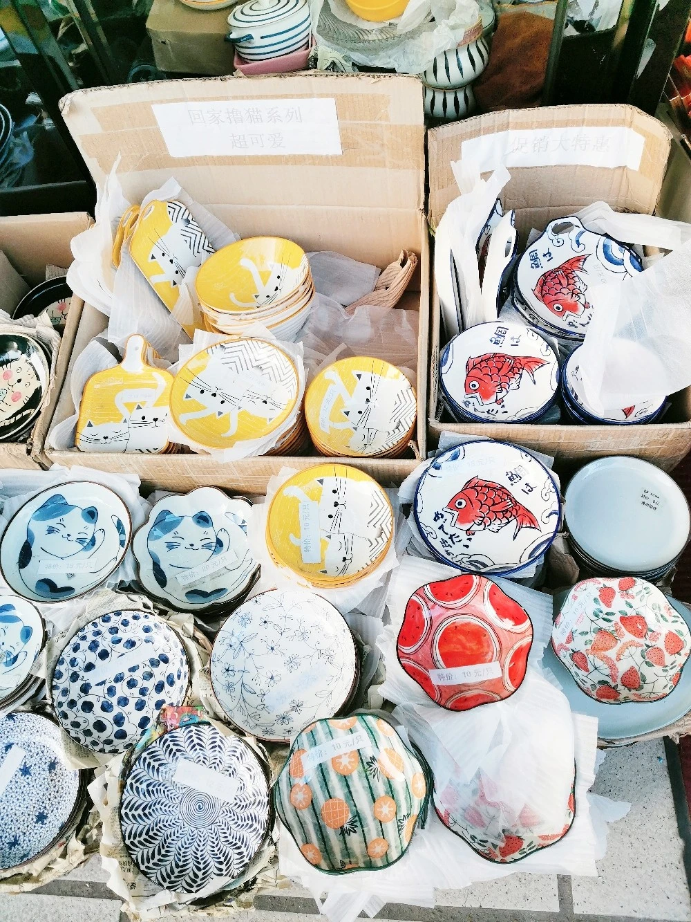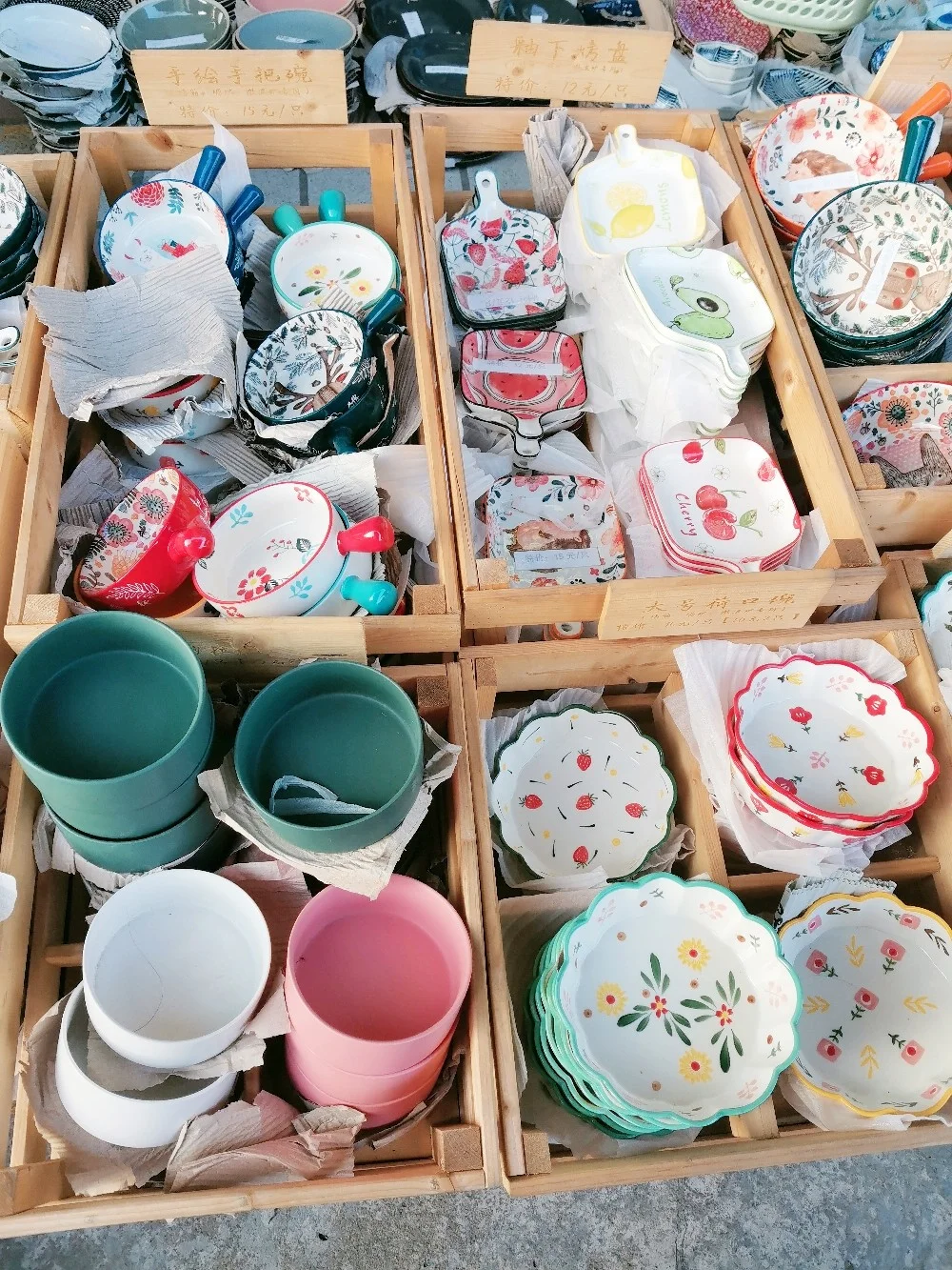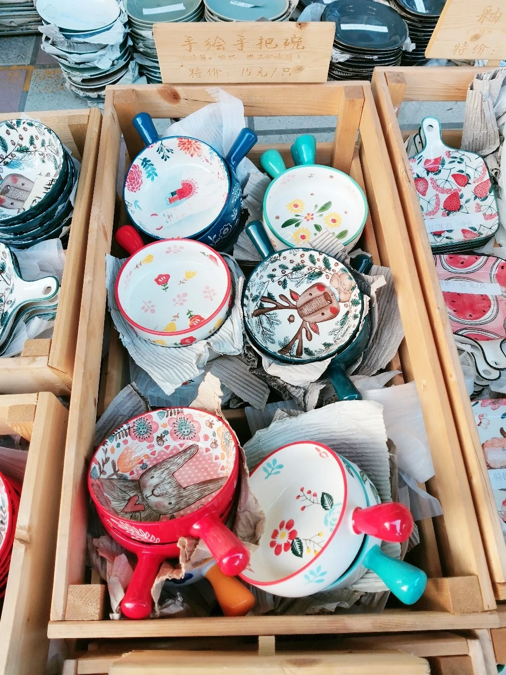 😉今天逛了一家🍵餐具批发店,门口摆满了平价餐具都是可以零售的哦,好多手绘碗、碟、杯子都灰常🌸漂亮,几块💰的东西,网上买起码20-30块吧,关键是现场看不怕有色差👌🏻,100元买到拎不动,太满足😍啦!