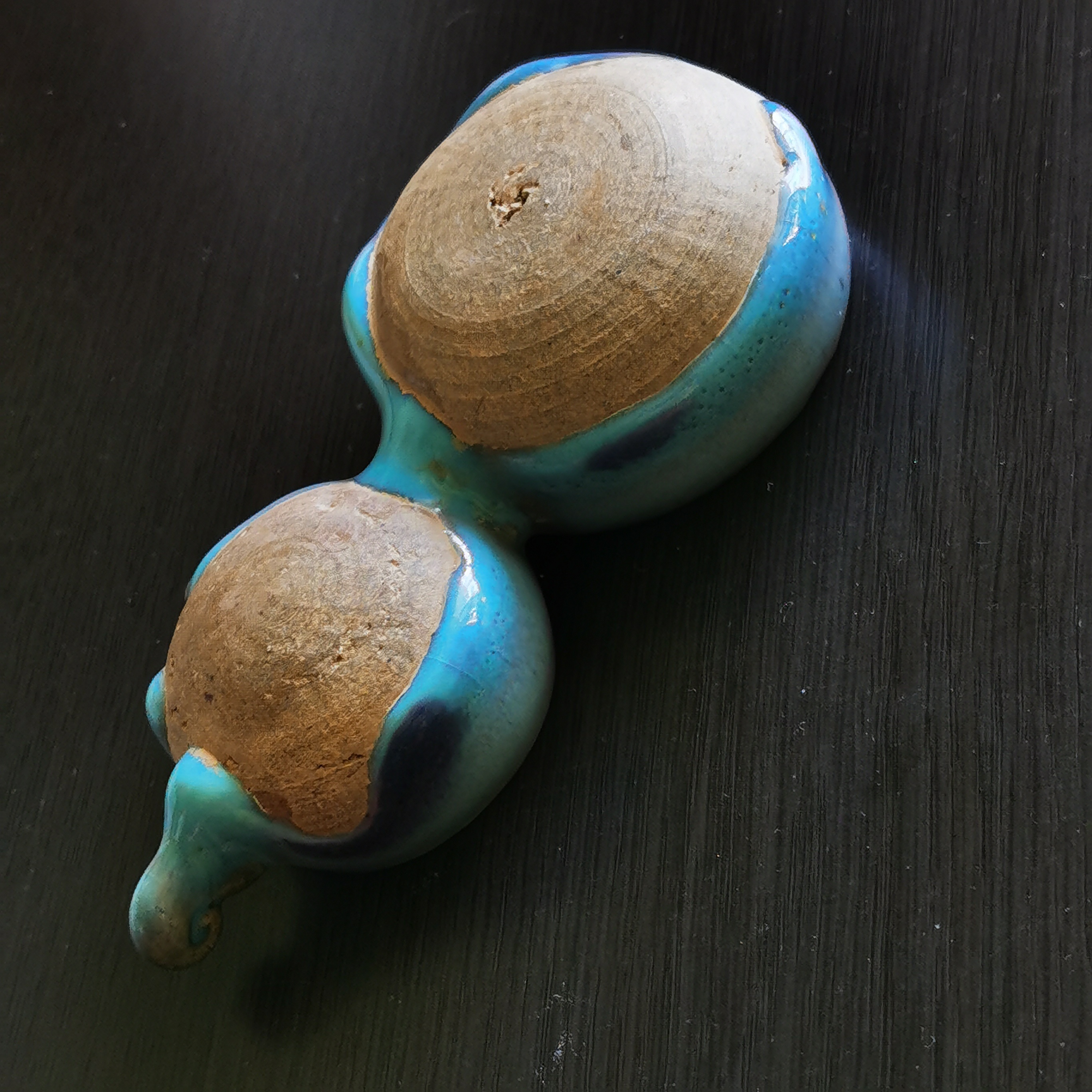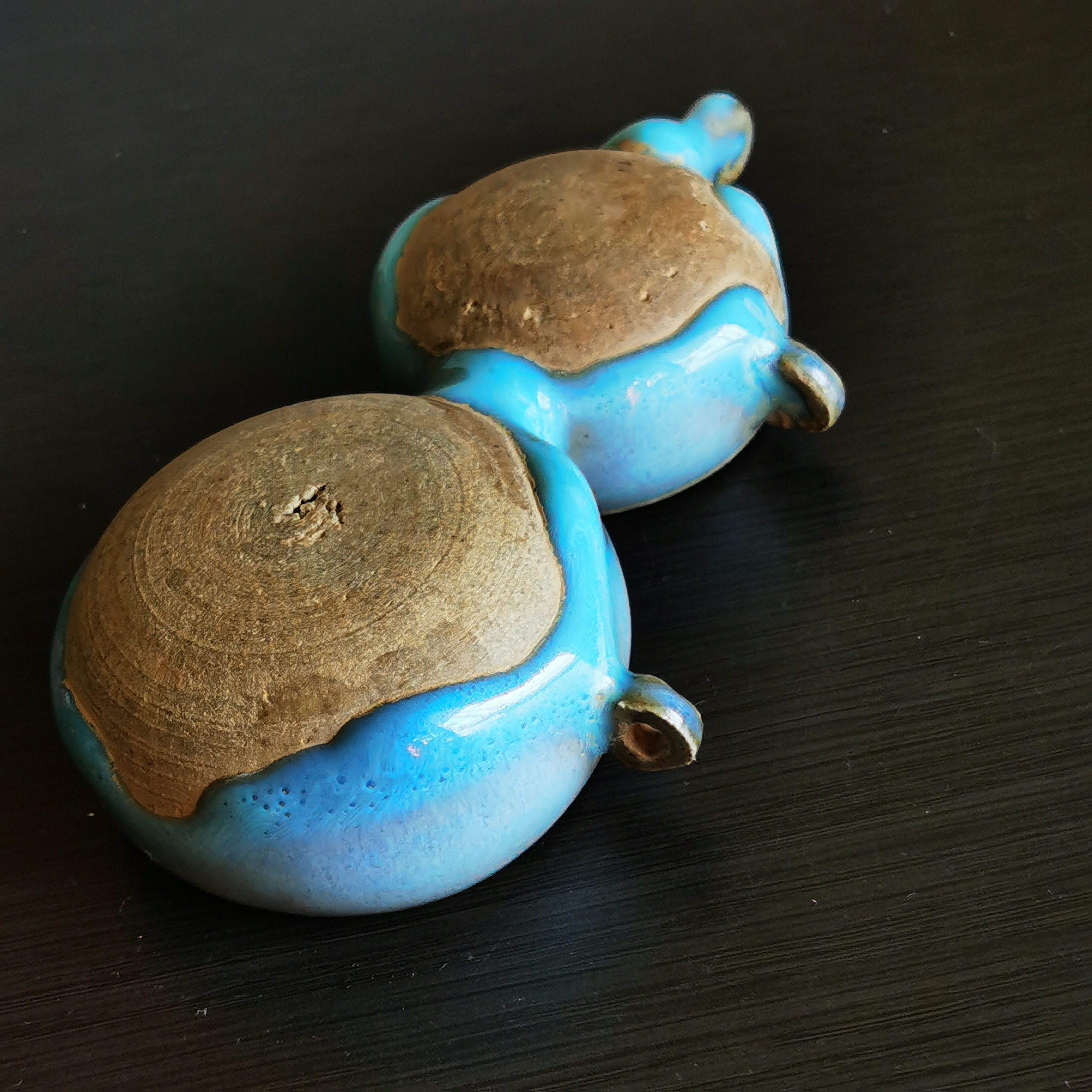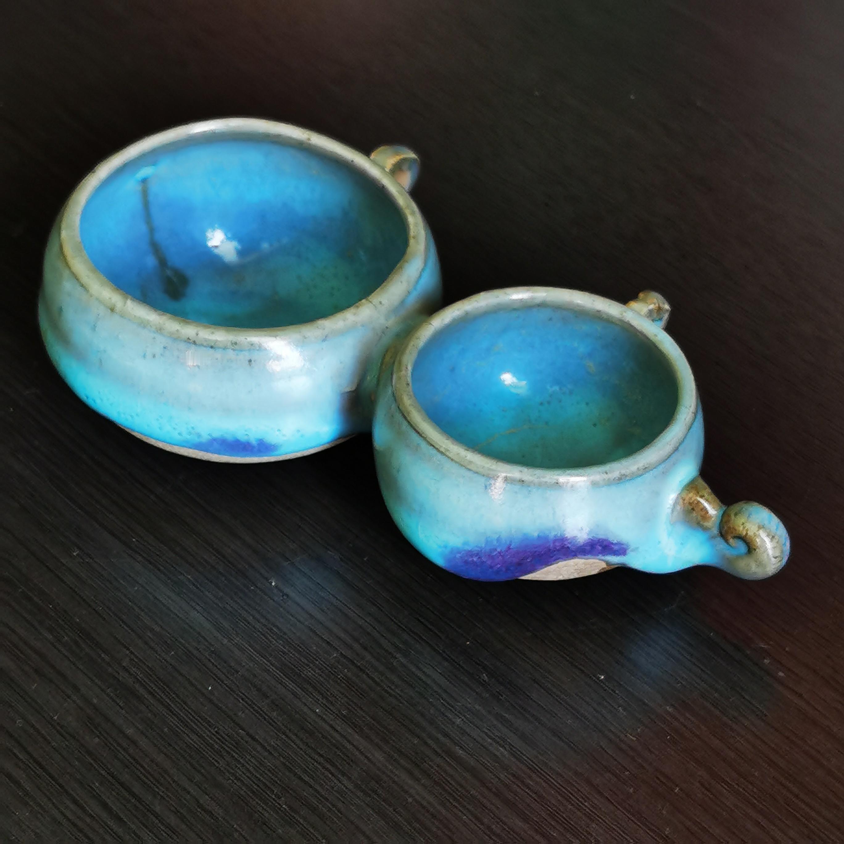 这款元代钧瓷双联鸟食罐,造型精致古朴,釉面温润如玉,其瓷胎质较宋代粗糙,但釉色滋润出众,以天蓝为主,施釉不及底足,圈足露胎呈灰黄色。由于鸟食罐的底部,从宋代的尖底演变为圆足,器身整体的外观设计也趋矮,呈现出文房水盂形制。元代鸟食罐实物稀少,双联排的鸟食罐,更是少见难得。河南博物院138件钧瓷藏品中未见此类器型,参考元代其他窑口(如龙泉窑)有类似产品,钧瓷鸟食罐尚未发现这种双联样式…