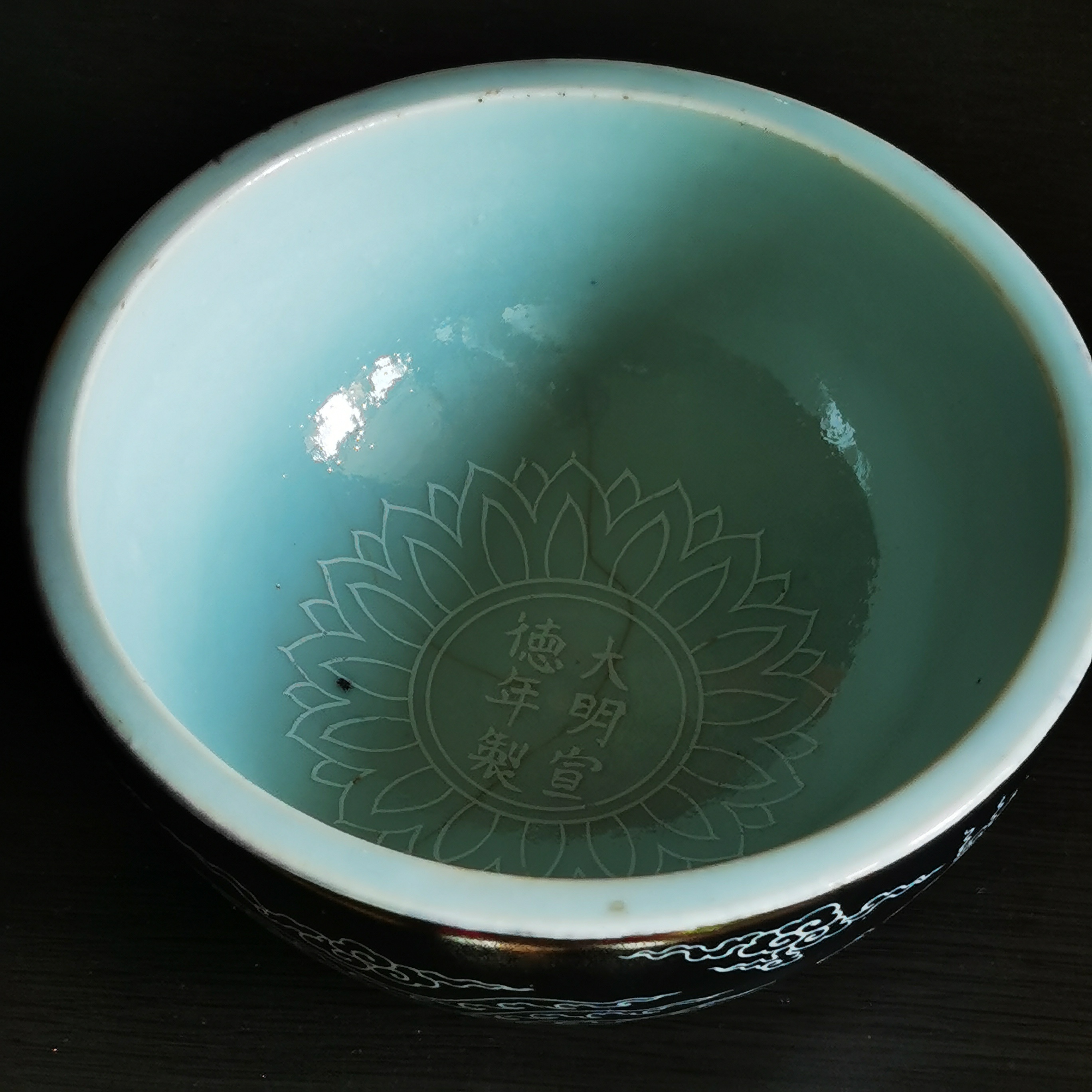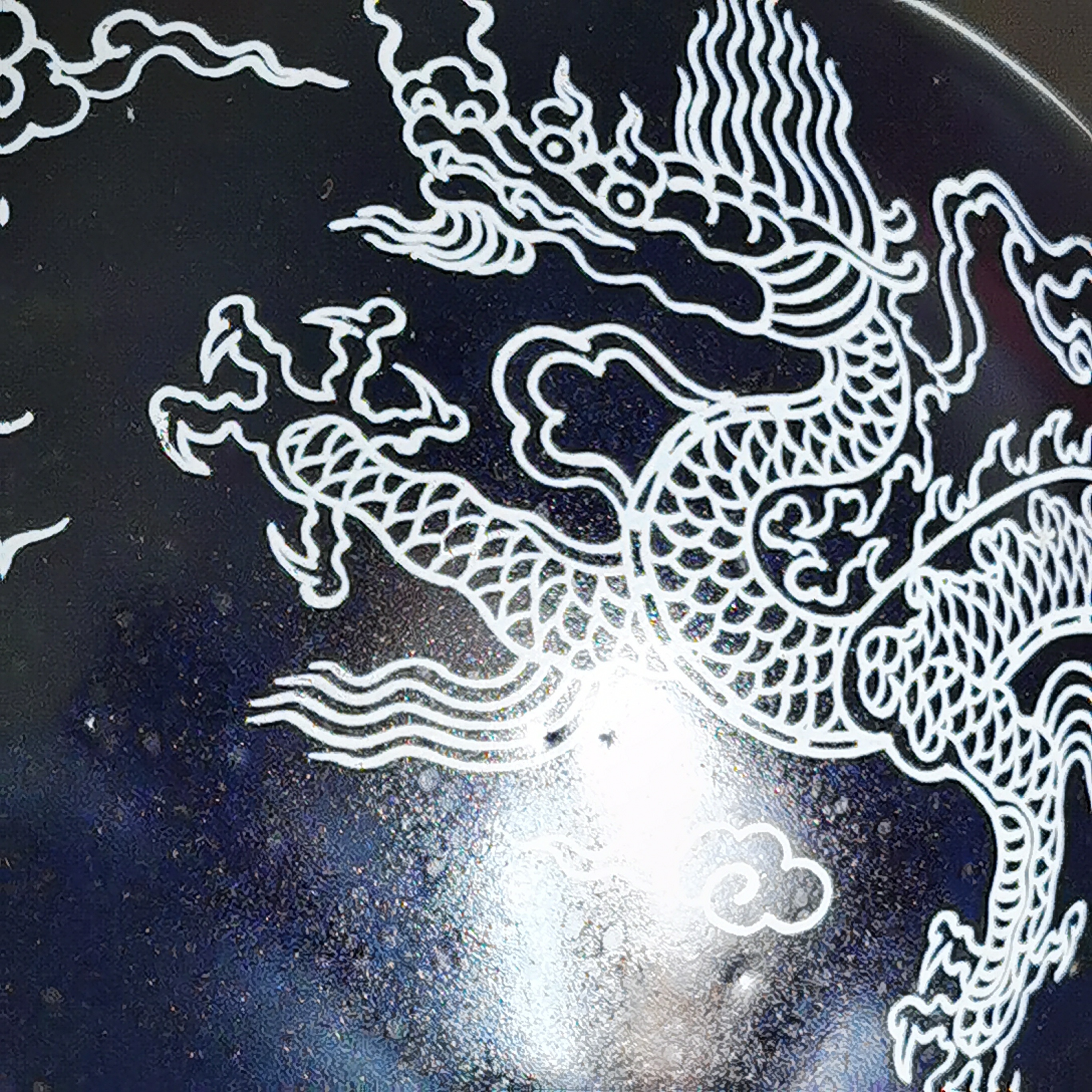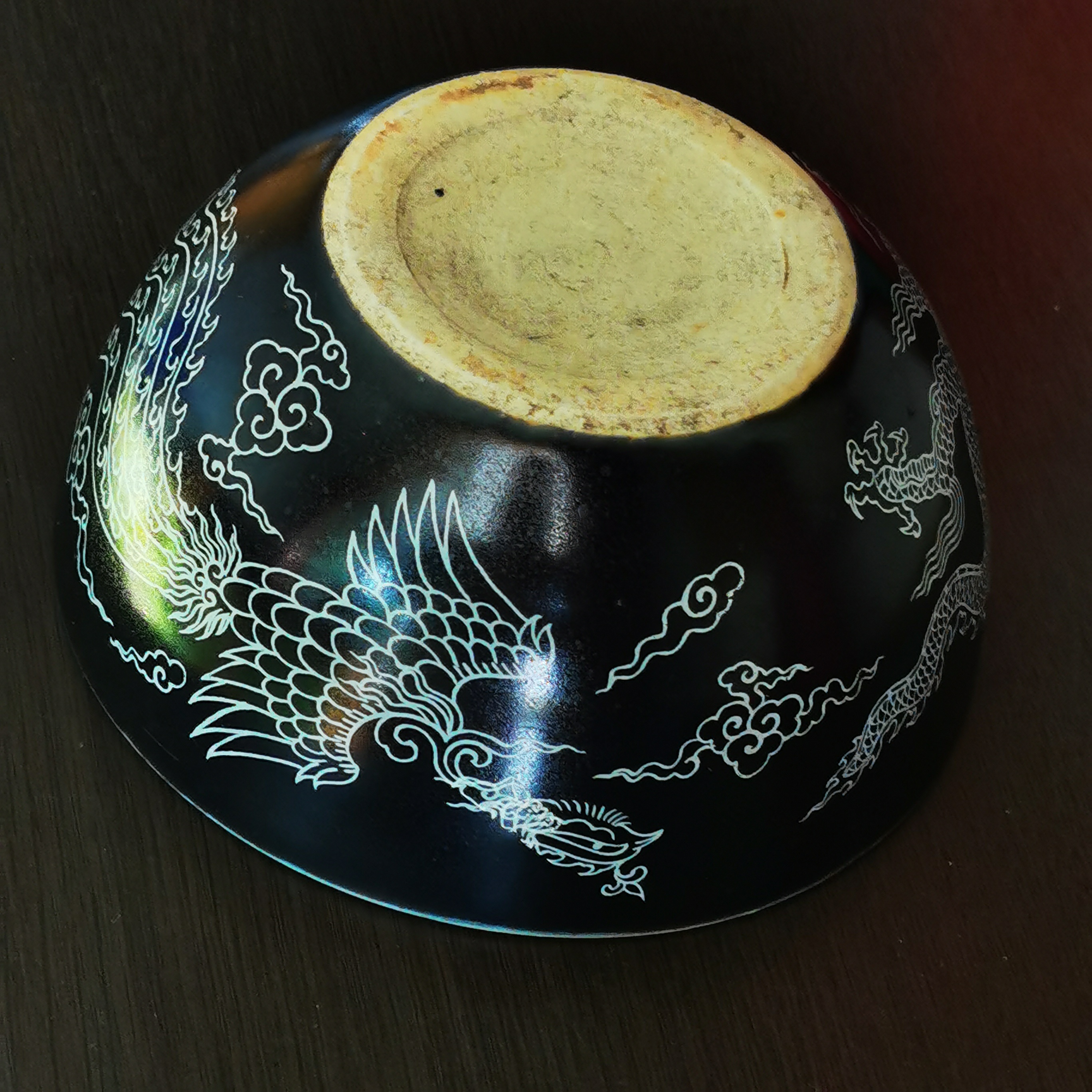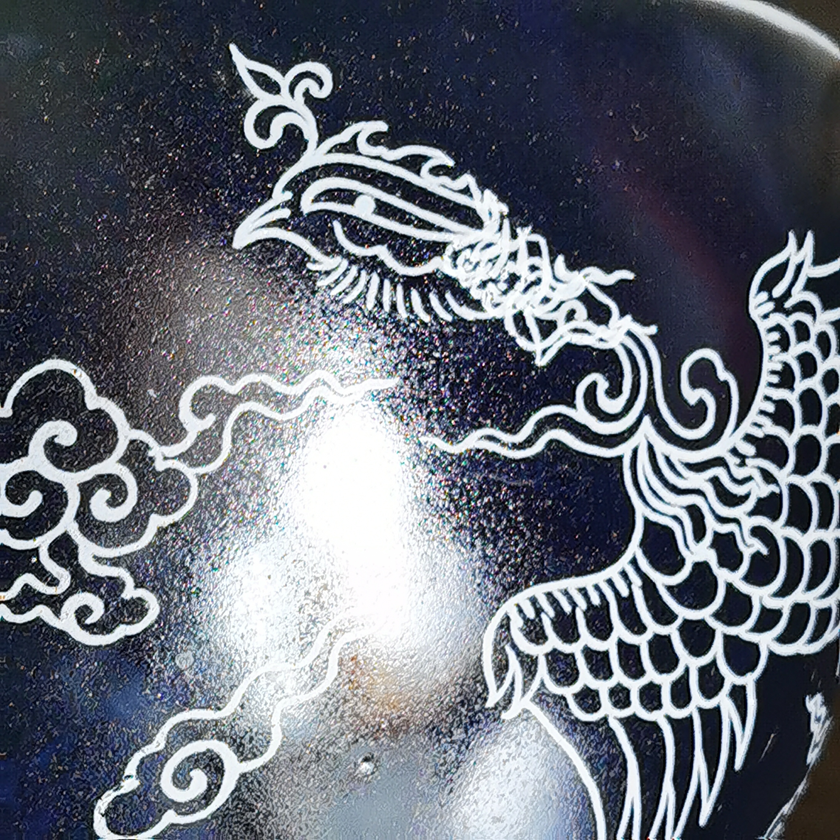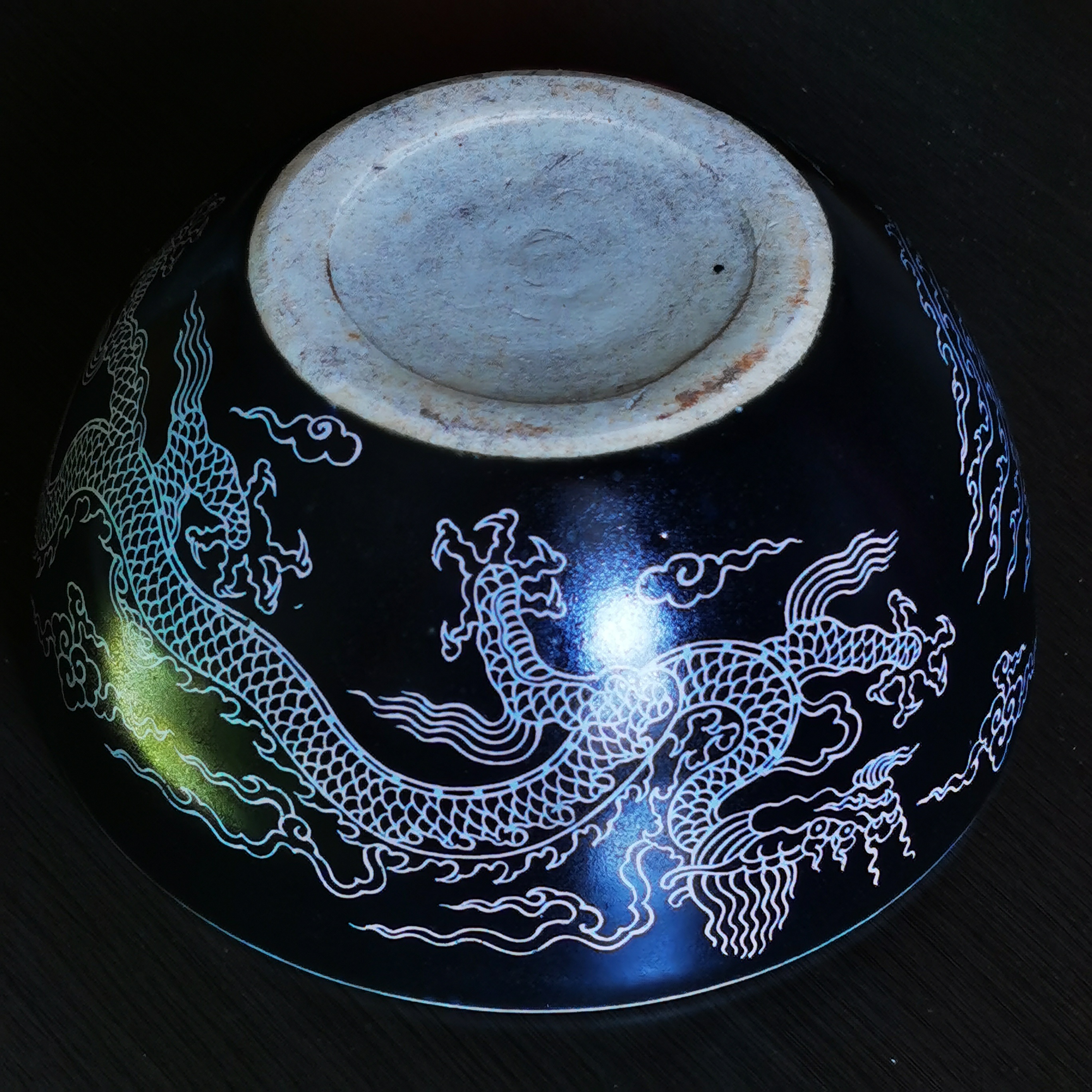 这款黑釉白色沥粉钵,底足露胎处显示,自然氧化 ,过渡痕迹明显的细沙底。 它的 釉面温润,沥粉凸起均匀,立体感自然,白色沥粉龍凤纹饰自然,彰显古代工匠高超酣畅淋漓技法,给人一种外观古朴,沧桑,飘逸,仙气十足的感觉~