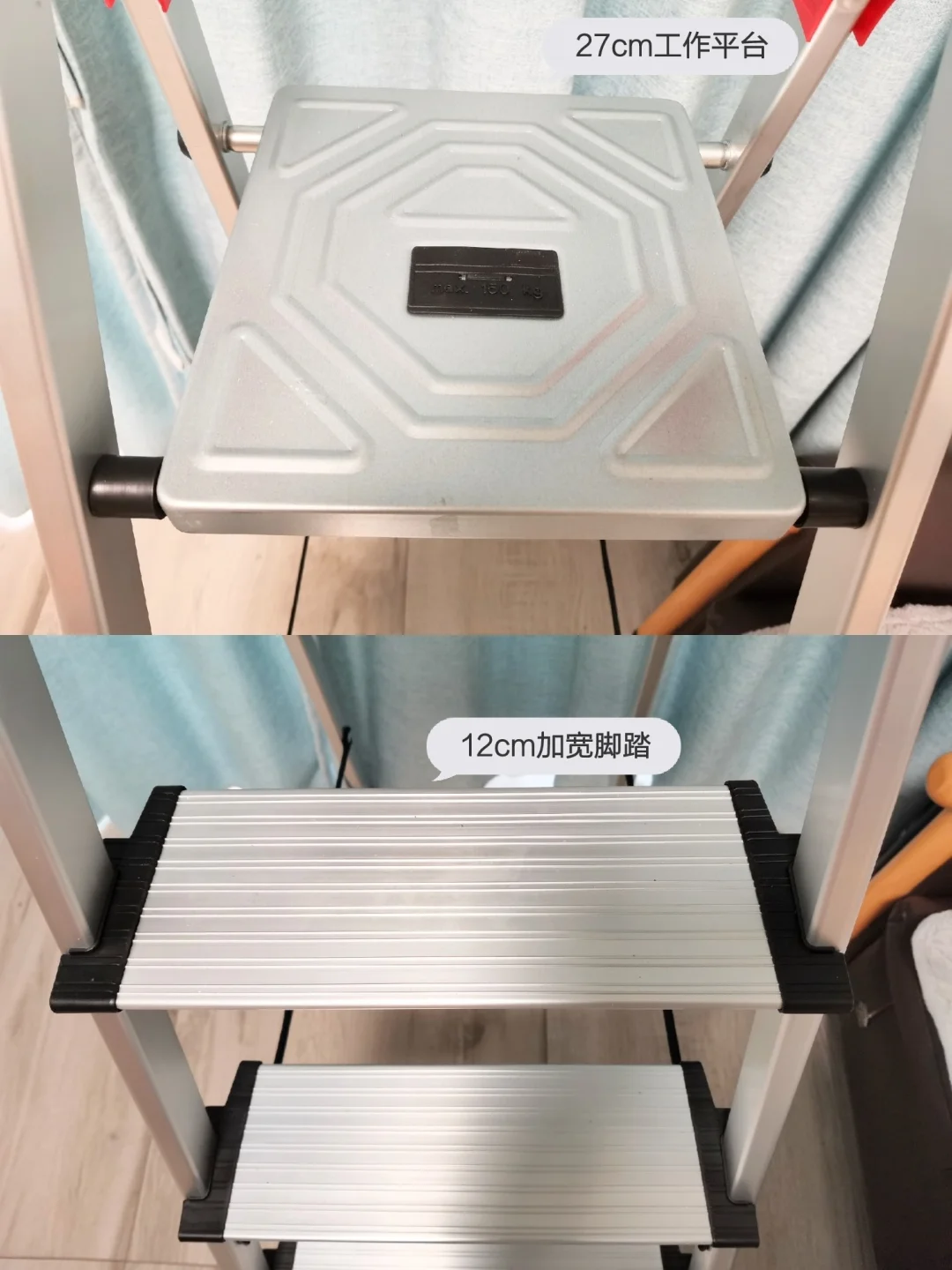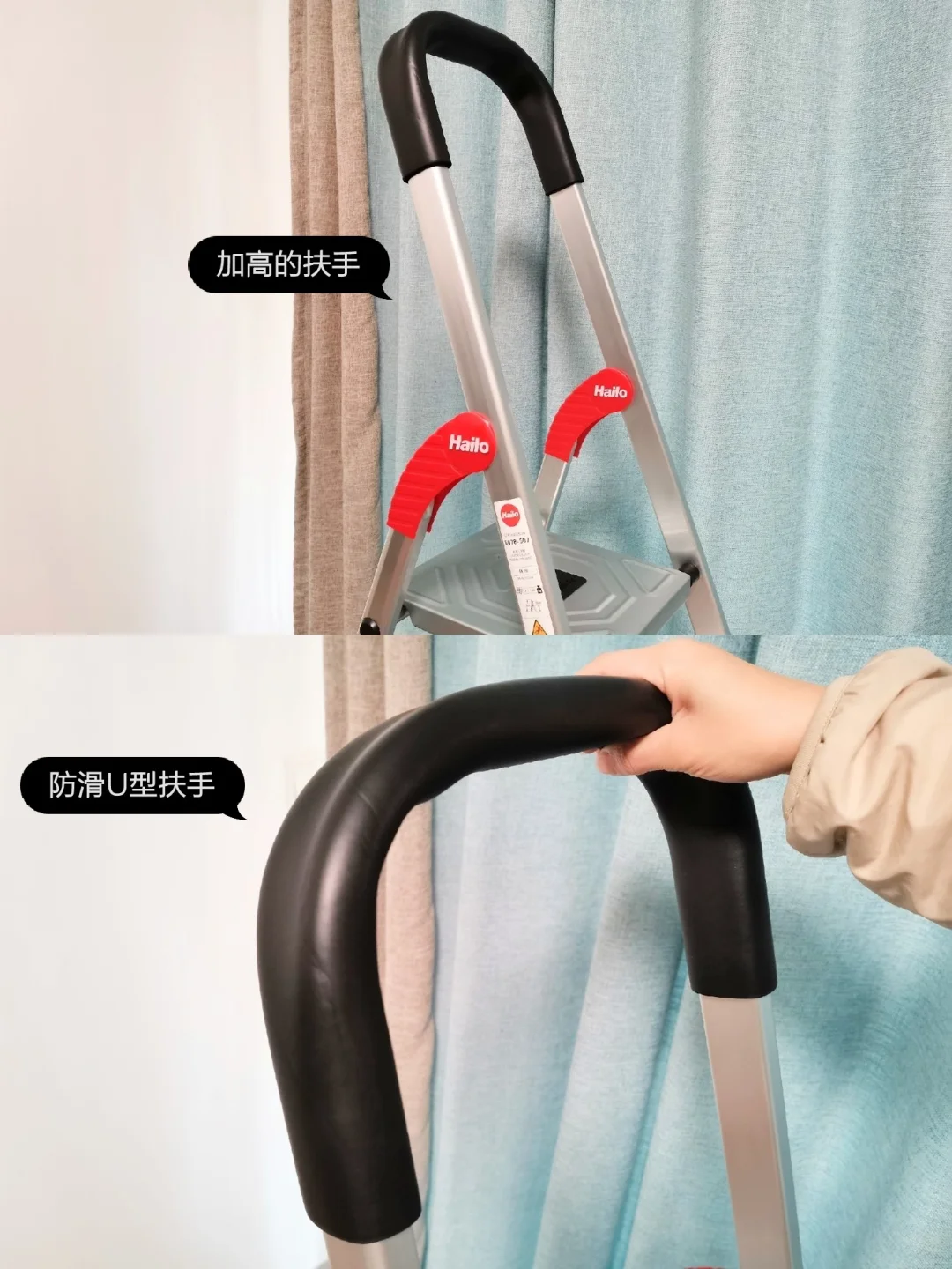 🔆Hailo梯子的踏板是12cm加宽的,最高一层是27cm带锁扣的工作平台,人站在上面可以双脚站立,加高的防滑U形扶手,⭐使用起来更方便又安全。