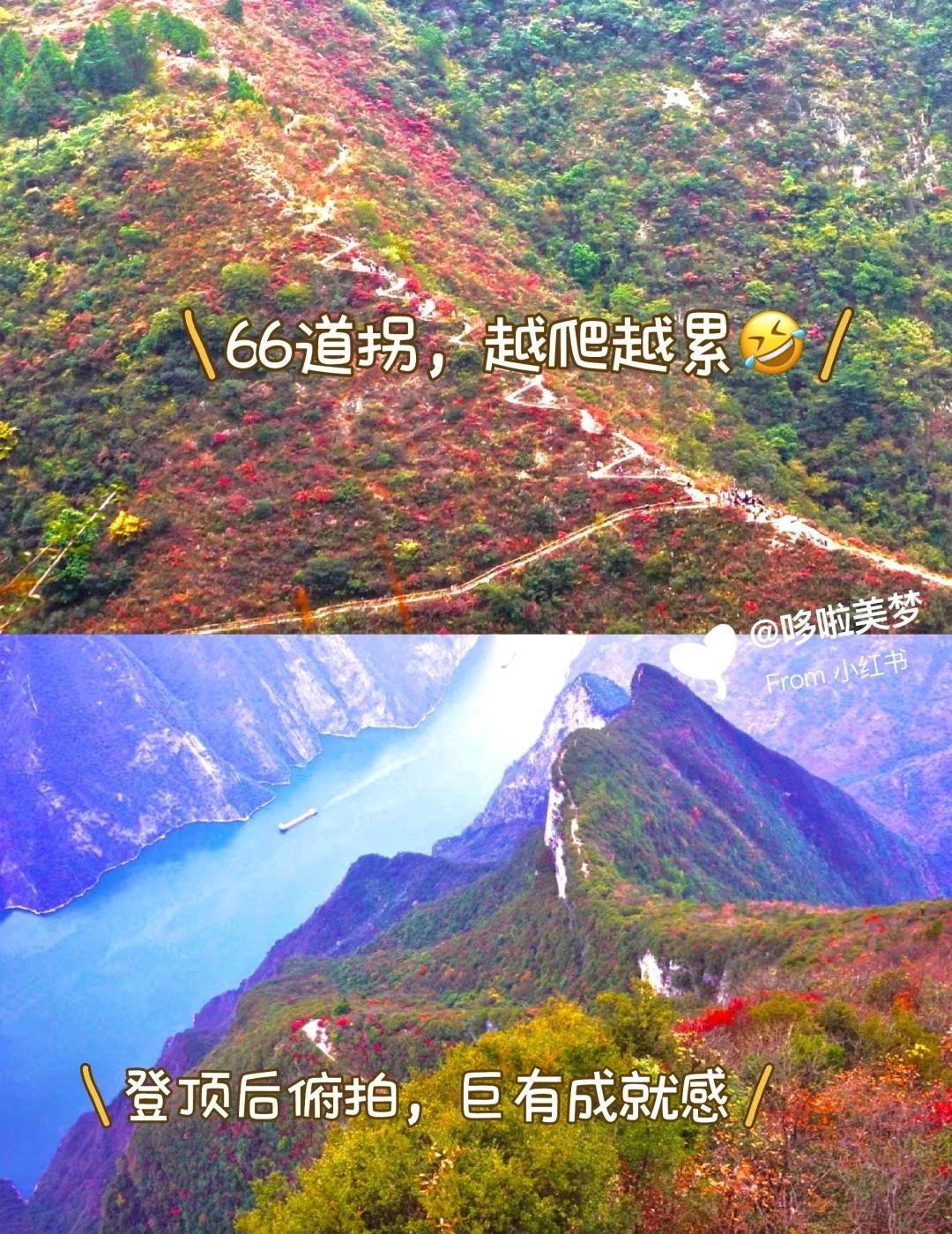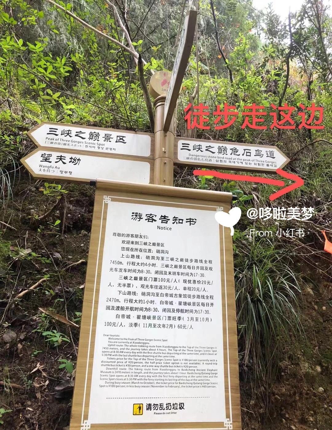 重庆动车2h|三峡之巅徒步保姆级攻略,照抄! 接上篇巫山红叶攻略(主页置顶有完整版)。结束巫山红叶之旅后,我们乘动车20分钟直达奉节,第二天挑战了白帝城→三峡之巅10公里徒步!若从重庆市区出发,动车不到2小时直达奉节,同样便捷。 一、交通方案 奉节设有白帝城-三峡之巅专线大巴:上午10点从高铁站发车,至白帝城约40分钟(15元),至三峡之巅约1小时40分钟(30元);下午3点从山顶返回。此班次时间对徒步者来说过于紧张。 建议徒步选择包车或拼车: - 普遍报价:包车260元/车,拼车100元/人 - 我们的方案:通过网约车司机谈成200元包车,早8:40酒店接至白帝城,下午5:30山顶接至高铁站 - 重要提醒:下午5点多景区门口很难拼车,我们返程时还带了两个拼不到车的情侣下山,务必提前安排好车辆。 二、徒步路线及时间 完整路线:先进入白帝城瞿塘峡景区,到忠义渡口坐轮渡到对岸,之后走赤甲楼左侧路线徒步上山,一路沿栈道和石板路前行即可。 - 徒步全程约10公里,海拔攀升1388米 - 一般用时4-7小时(我们用时5.5小时,同行下山的情侣用时6.5小时) 关键提示:在图9位置选择右侧路线,左侧为盘山公路车道。 徒步难度:前5公里较为平缓,后5公里“66道拐”需攀升1000米海拔,部分路段需手脚并用,注意合理分配体力。 我们的时间记录(供参考): 我们在自帝城游玩了一个小时,坐10点30的轮渡到对岸(约5分钟),在赤甲楼稍作游玩,10点50开始徒步上山,期间边玩边拍照,最后到达山顶时间为4点20分,在山顶游玩1个小时左右,17:30 前乘坐观光车下山(末班车时间)。 三、注意事项 1. 建议乘坐9:30或10:00的轮渡,最晚不超过10:30,确保徒步时间充裕 2. 务必提前确认包车事宜,明确接送时间和地点 3. 登山杖必备,尤其在后半程能有效节省体力、保护膝盖 4. 三峡之巅山顶风大温度低,爬山时易出汗,建议携带方便穿脱的外套 图片摄于24年12月4日,攻略整理不易,喜欢就点个❤️吧[赞] 三峡之巅徒步重庆徒步 白帝城 长江三峡红叶