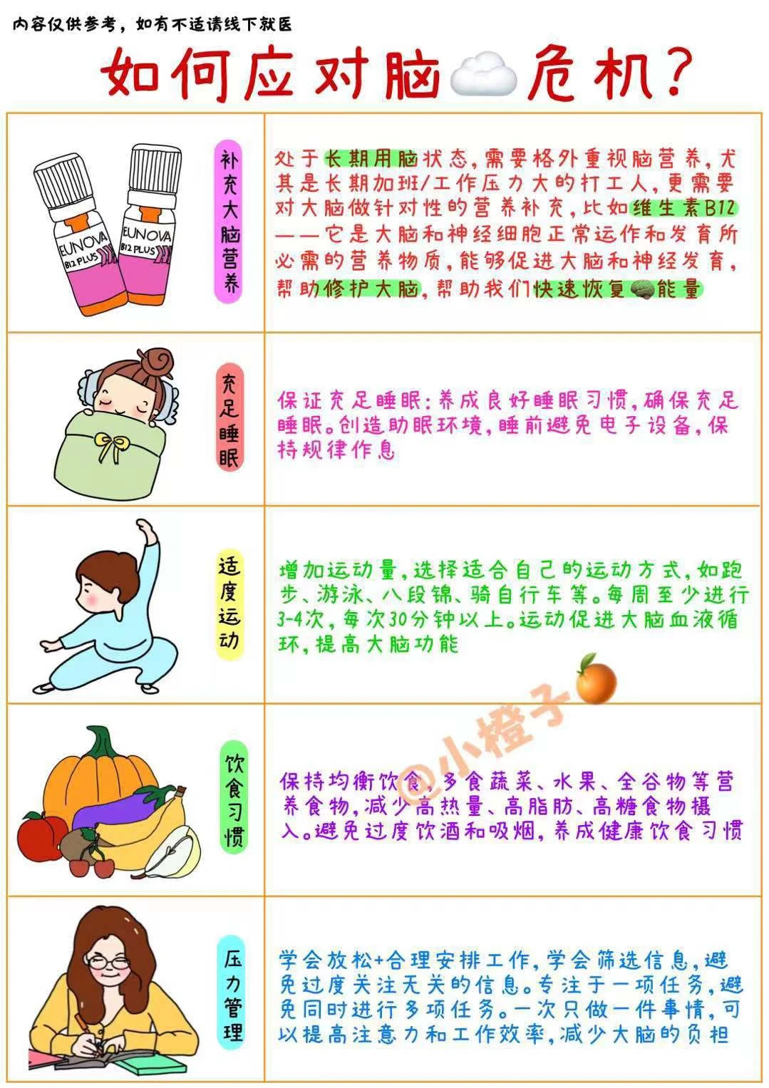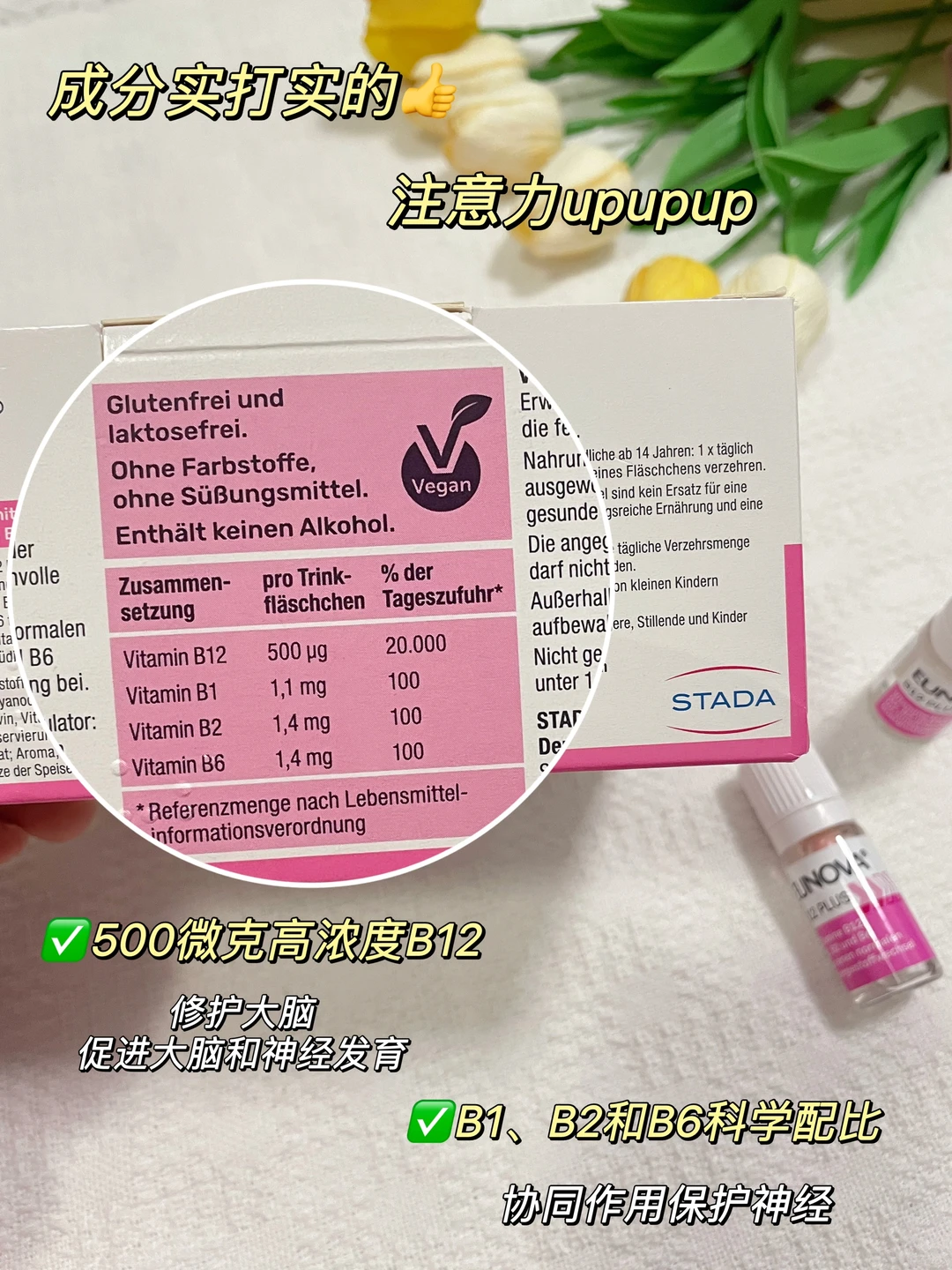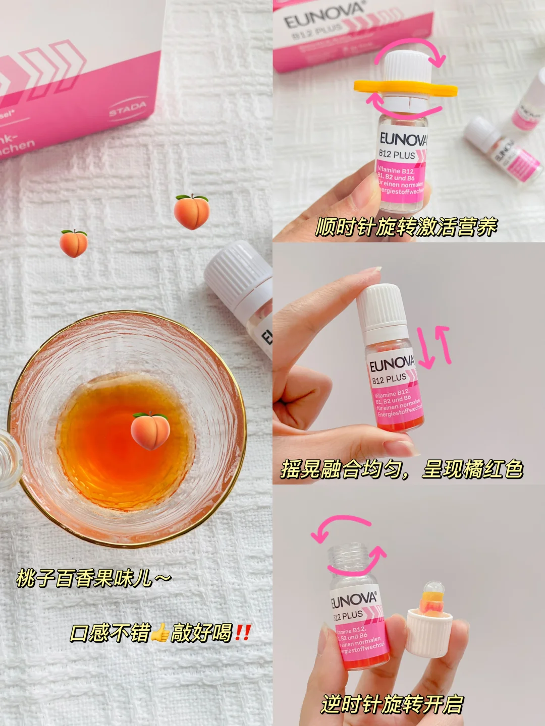 真的想喊救命。。。 虽然天天说自己老了 但也没想到这么早就开始脑☁了😭 前几天早上回家取东西出门,回家才发现钥匙还在门上,现在都觉得后怕。 记性差就算了,反应也跟不上,说着话呢脑子就突然宕机了,上午才复盘过,下午领导提了个问题大脑就一片空白了,回答的时候脑子跟不上嘴巴,心里那个慌啊! 集中注意力也变得困难,不是犯困就是走神, 频频在各种细节上犯错,刚上班没几年,感觉祸都在这几个月闯完了。。。 最后受不了去了🏥,没查出来问题,得出的结论就是脑疲劳,在上班族里还挺常见的,夜是要熬的,外卖是要吃的,脑营养是跟不上, 上班用脑量又大,大脑长期得不到充分的休息和营养,可不是要变迟钝吗! 拯救大脑,我在行动!这份应对脑☁手册请查收✅ [一R]保证充足的睡眠。 [二R]适度的运动:如跑步、游泳、八段锦等。 [三R]保持均衡饮食,多吃蔬菜水果。 [四R]学会放松、合理安排工作。 [五R]补充大脑营养。 长期用脑需要格外重视补充脑营养,尤其是B12——它是大脑所必需的营养,能够帮助修护大脑!维生素B族的奥秘请查看图四哦,小橙子已经给姐妹们整理好啦! 但日常的饮食习惯很难摄取到足量B12的,所以还是建议有用脑需求的群体通过营养补剂来补充。我自己平时用的是史达德B12能量瓶。 STADA史达德是德国百年药企,品质值得信赖,能量瓶里头复配了4种VB,能够很好的补充大脑和脑神经的营养。 像前面提到的B12,含量就高达500微克,不仅可以满足营养需求,还能帮助修护陷入☁的大脑,让注意力更集中⬆⬆ 里面的B1、B2、B6不仅可以补充脑能量,B1、B2会使B6的功能进一步增强,协同作用,更好营养大脑。 激活后呈现漂亮的橘子色,既好看又好喝!酸甜桃子百香果口味坚持完全没压力~ 喝了两三盒,注意力更集中了,最近开了几次长会议都没有再走神过!复盘总结的时候还被领导夸逻辑很清楚表达也很好,简直是打工人的至爽时刻,工作状态直接拉满! 太适合我这种低能量上班族啦! 早起来一支,上一天班都感觉脑袋很清醒!无论是工作计划还是工作复盘都能轻松应对!脑袋笨笨的低能量打工人都喝起来! 对啦!它家的包装今年有升级哦,最近是新旧包装随机发的!