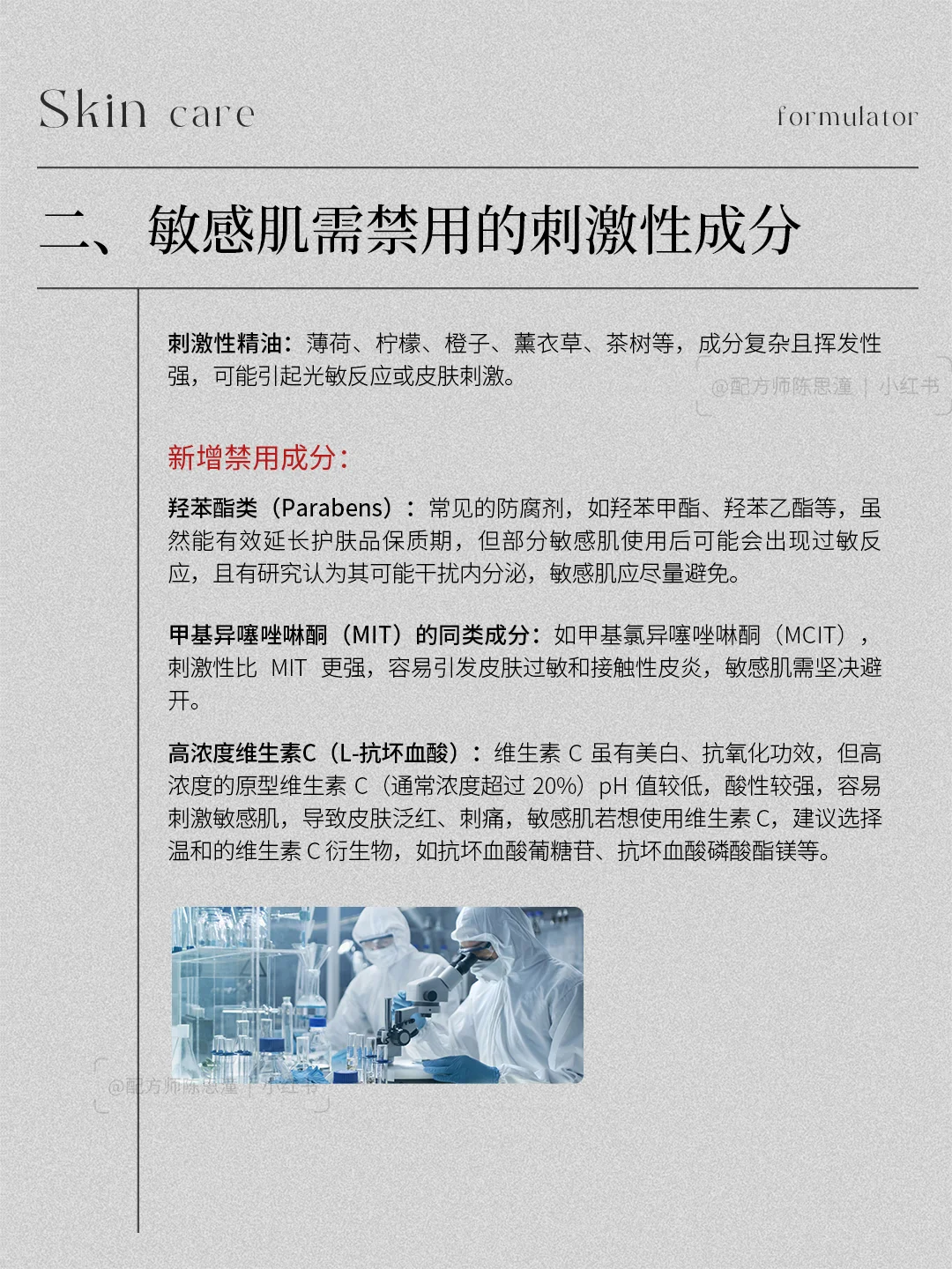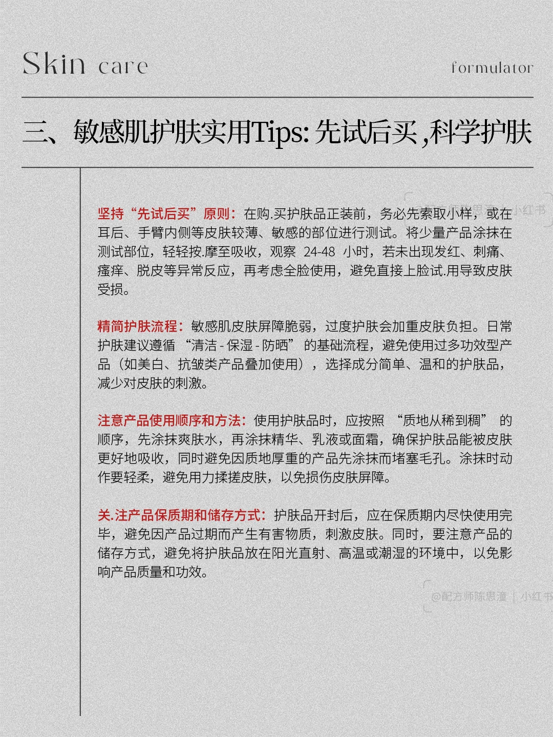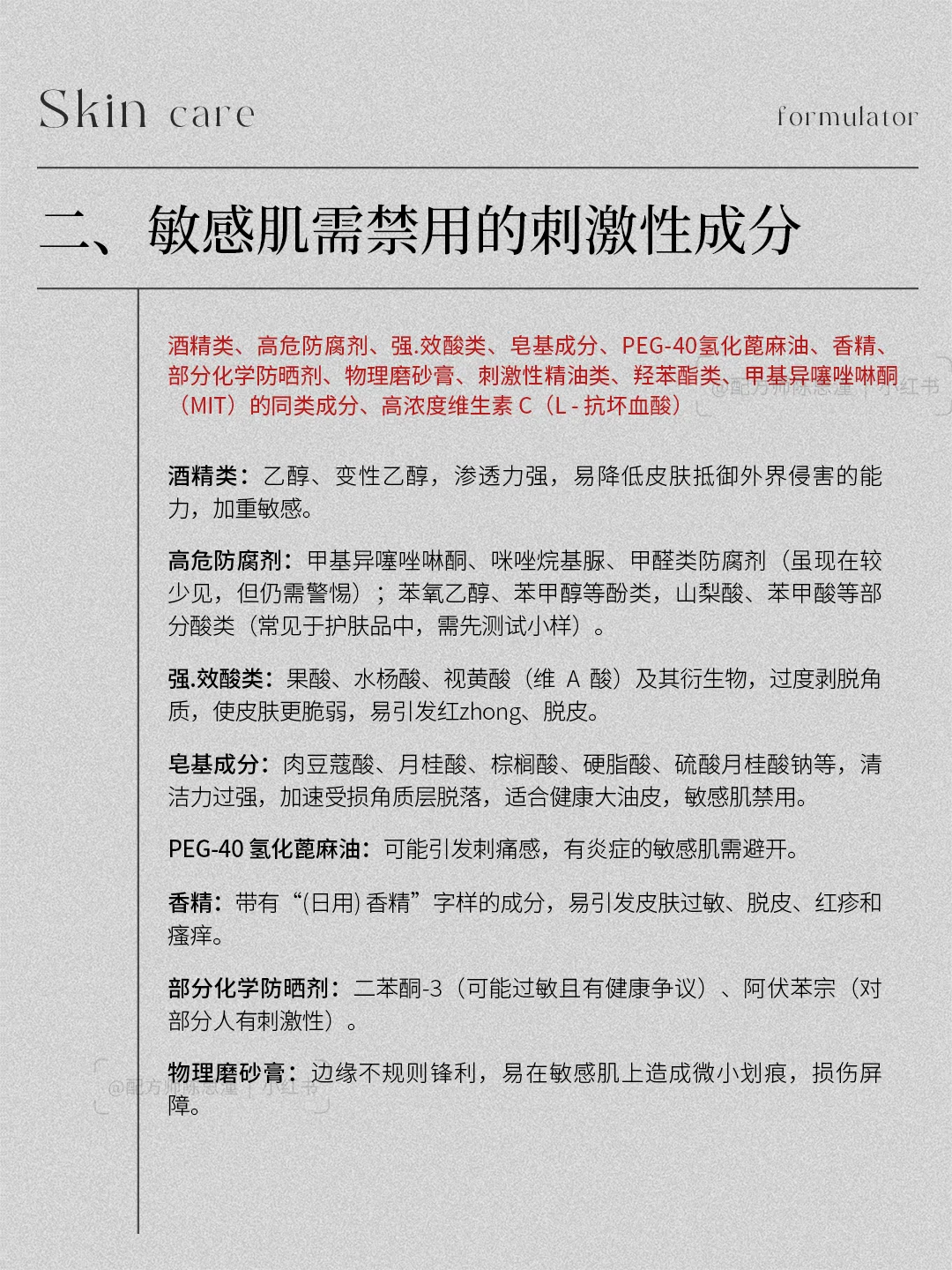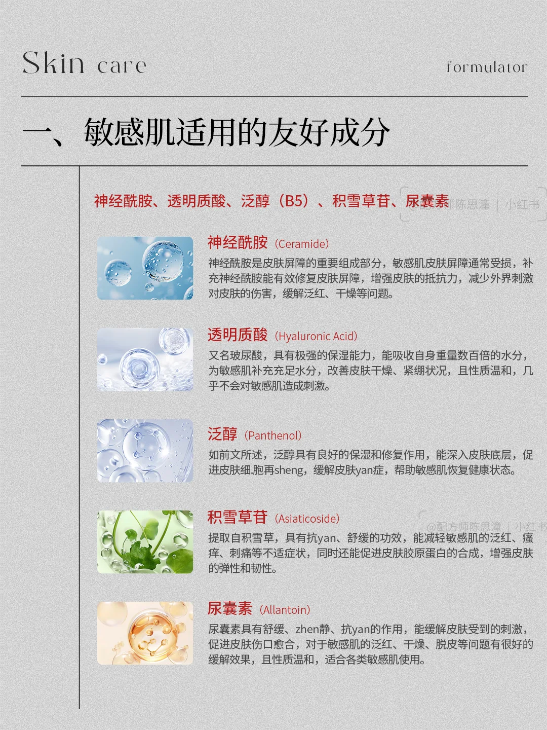 敏肌成分表甄别方法:找准适用成分,避开禁用成分 敏感肌在挑选护肤品时,学会看成分表是关键。只有精准识别适用成分和禁用成分,才能避免踩坑,选择到真正适合自己的产品。 一、敏感肌适用的友好成分 二、敏感肌需禁用的刺激性成分 三、敏感肌护肤实用 Tips:先试后买,科学护肤 一起来关注了解一下吧,下期还想看什么可以评论区告诉我哦~
