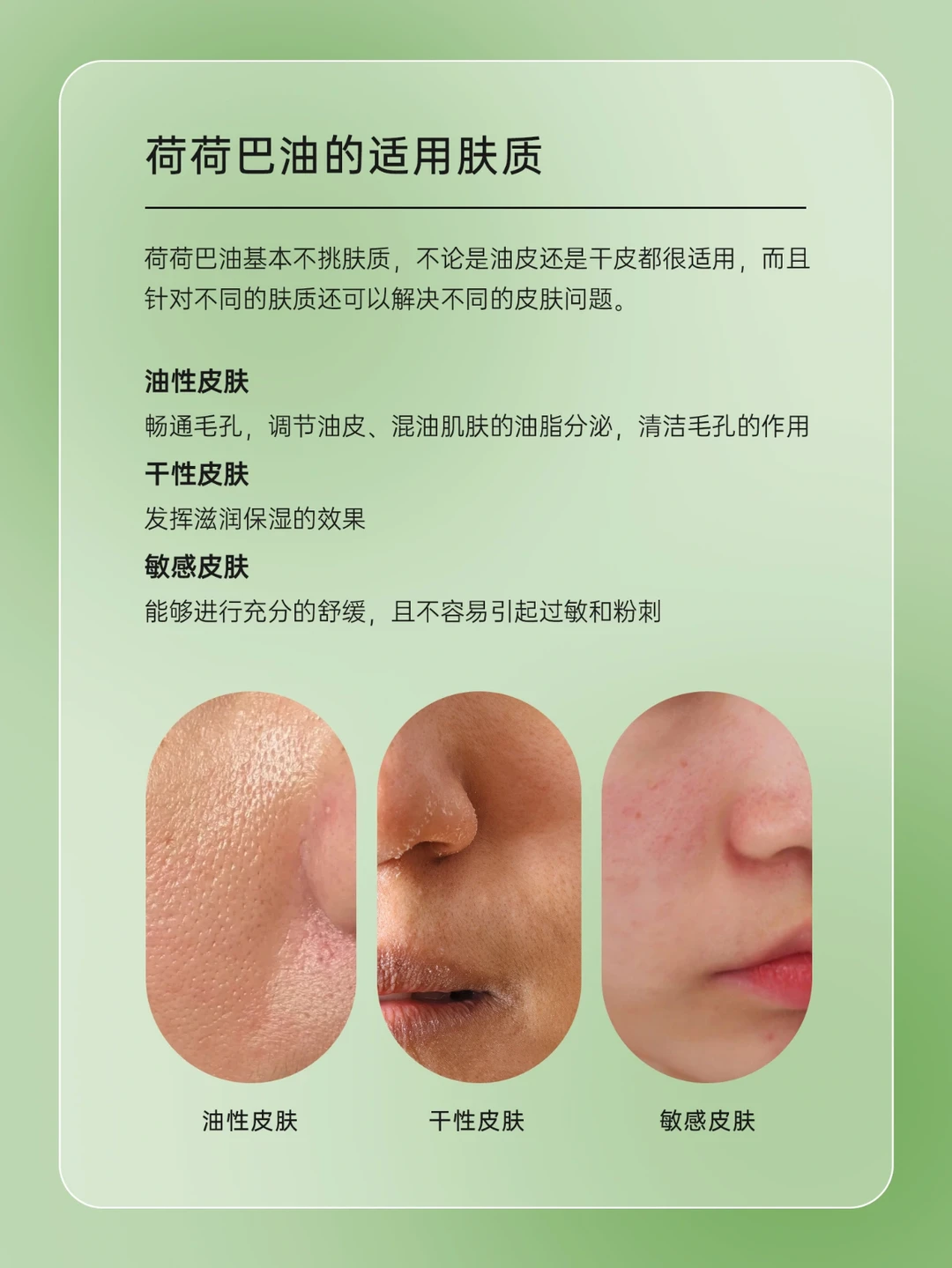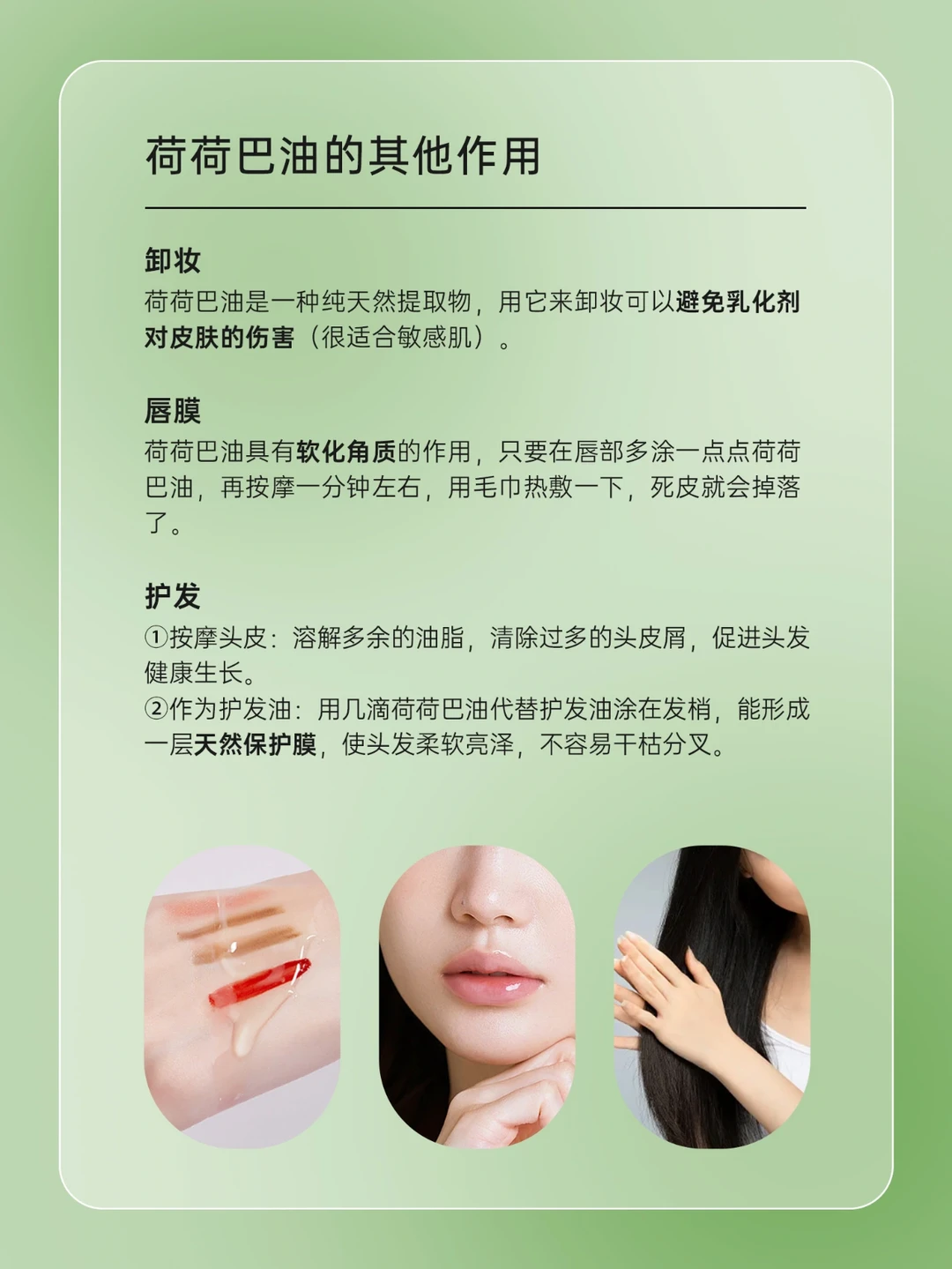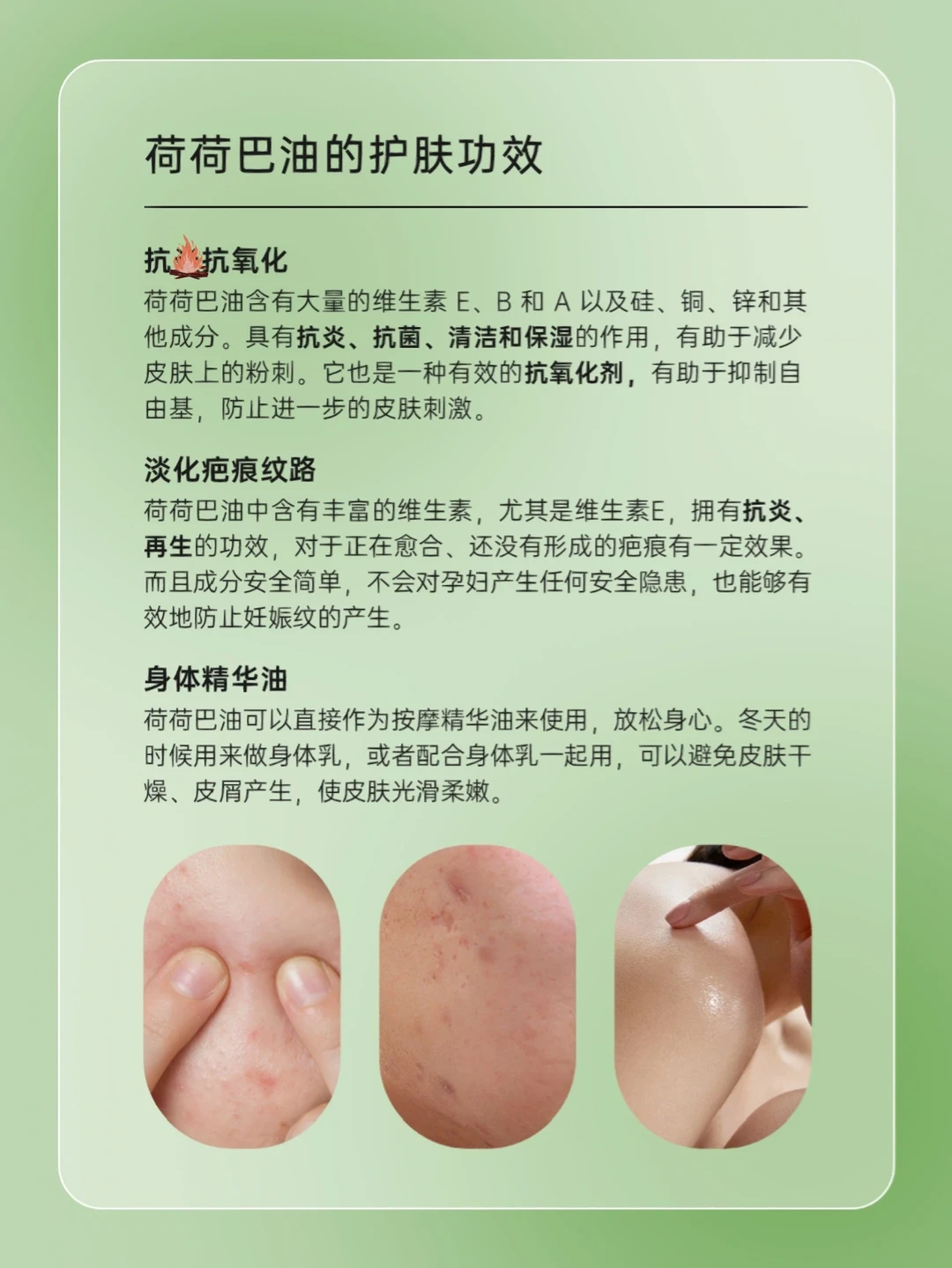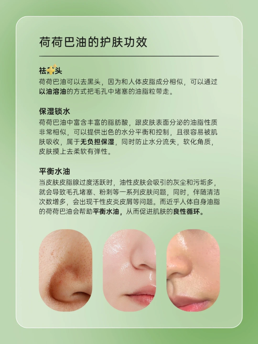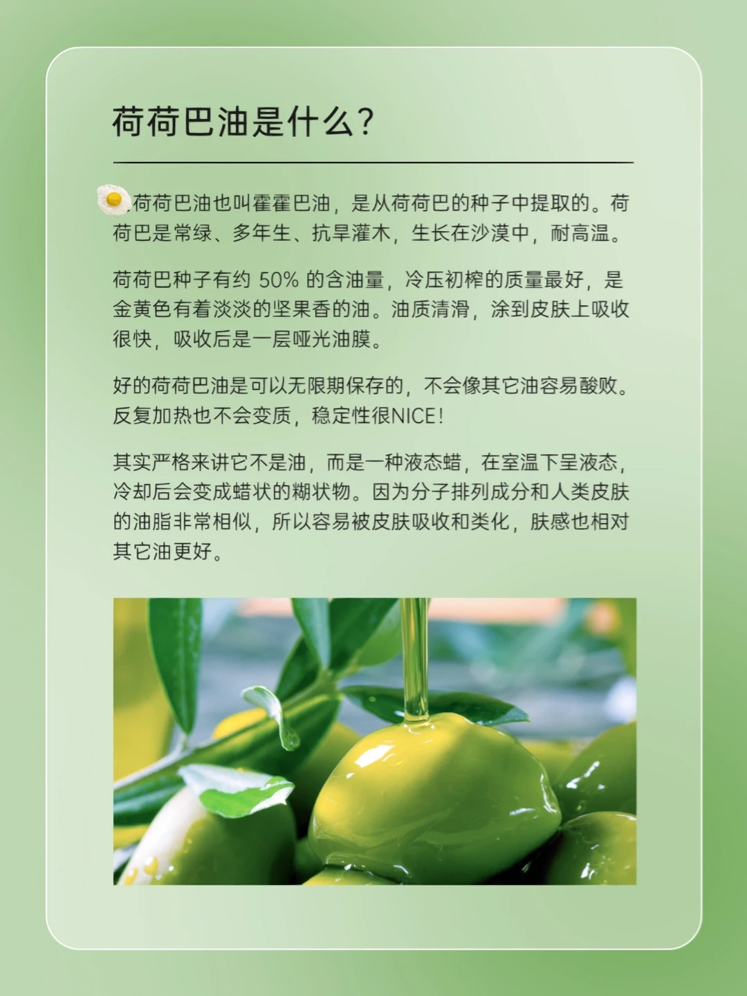 🌿荷荷巴油是什么 🌿荷荷巴油的适用肤质 🌿荷荷巴油的护肤功效 · 去🌚黑.头 · 保湿锁水 · 平衡水油 · 抗🔥抗🐑化 · 淡化疤.痕.纹路 · 身体精华油 🌿 荷荷巴油的其他作用 · 卸妆 · 唇膜 · 护发 一起来了解一下吧,下期还想看什么可以❤️➕🍎告诉我哦