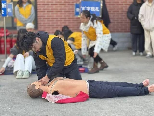 演练现场还设置了“急救技能课堂”,校红十字会成员现场演示了心肺复苏(CPR)、三角巾腿部包扎、8字形包扎、头部包扎及螺旋反折包扎等实用急救技能,细致讲解动作要领。在灭火实操环节,消防员不仅分类介绍了不同灭火器的适用范围,还现场演示了干粉灭火器“提拔握压”的使用步骤,并邀请师生亲自上手体验,将理论知识转化为实操能力。