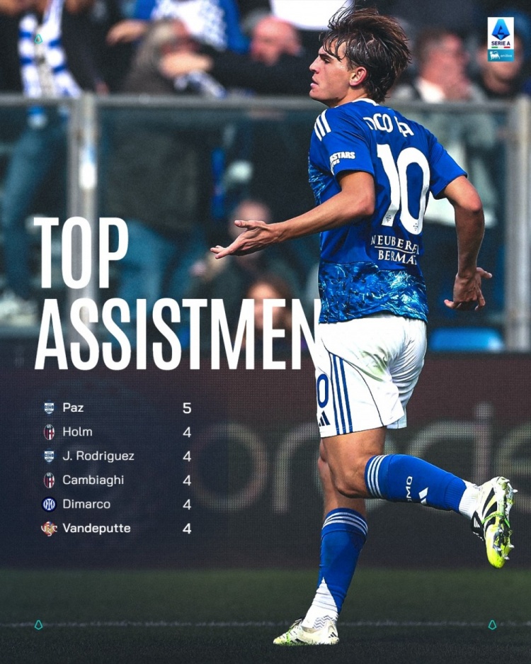 尼科·帕斯本赛季意甲打进5球,并列排名意甲射手榜首位,助攻5次,登顶意甲助攻榜,意甲官方社媒晒出射手榜、助攻榜海报,对他表示祝贺。