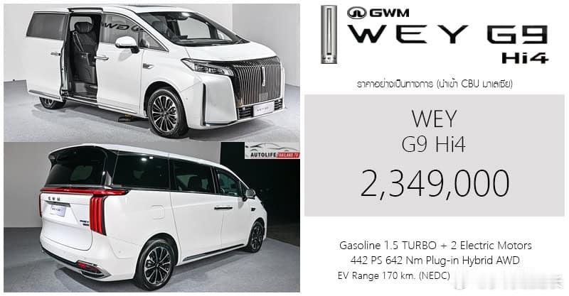 GWM WEY G9(魏牌全新高山)的预售价格2349000泰铢,Hi4动力技术是产品重要亮点,安全多模+平顺舒适的行车质感,Hi4也能营造,颜色应该是还差一个黑色我与汽车的日常中国车在海外