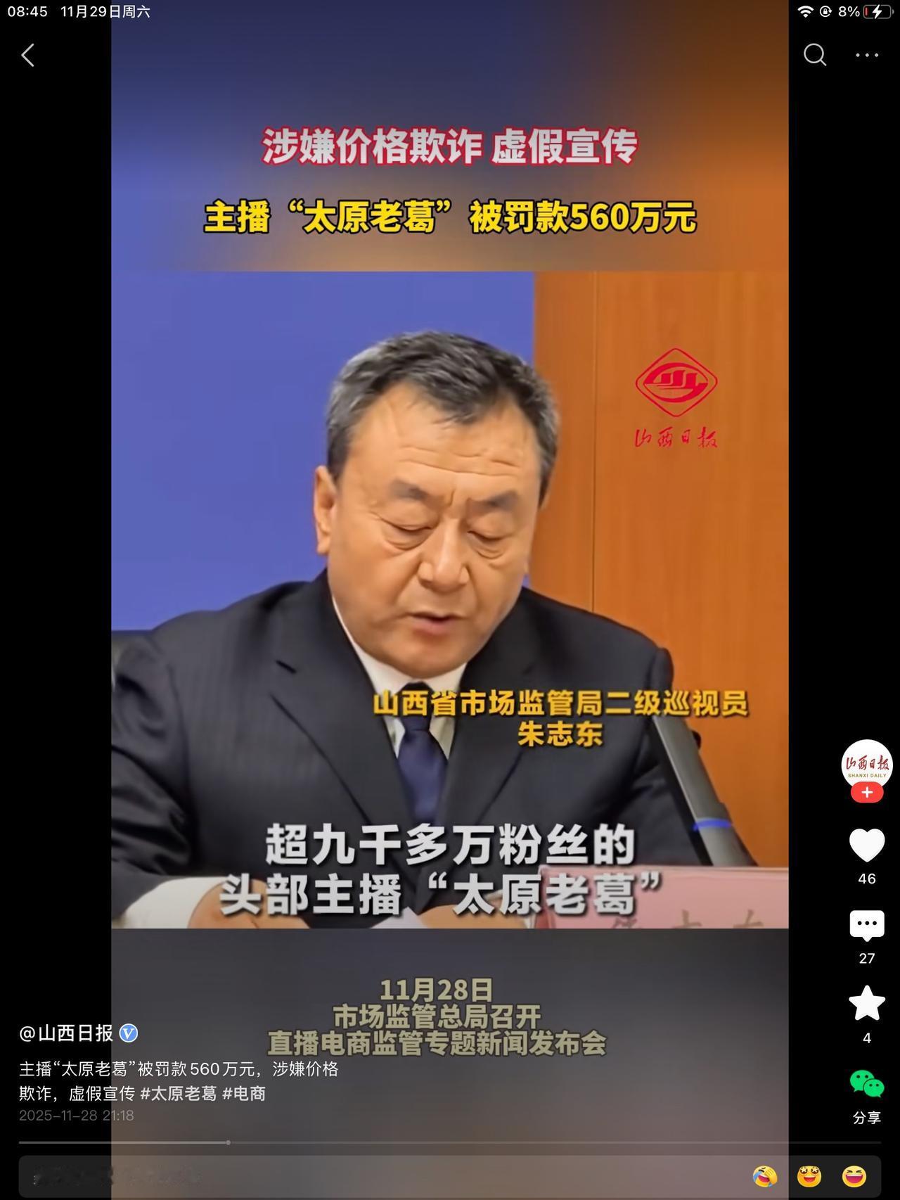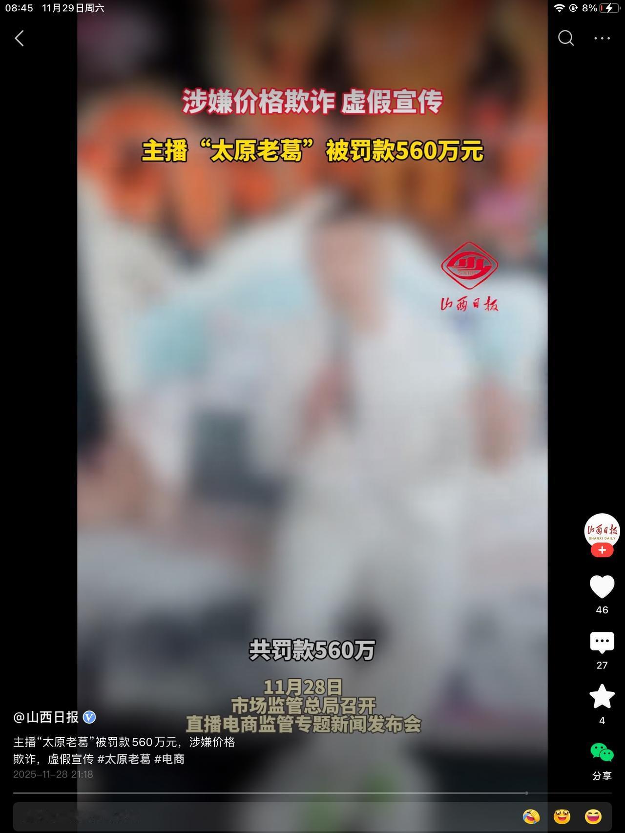 主播太原老葛,某手粉丝,9000多万,因虚假宣传,被罚款560万元。这个真不敢笑话他。你想啊,每14人当中,就有一个人关注他。你真的,你比你身边这十四人过的好吗?首先,他有钱有时间去关注他,并有可能买他的东西。你有吗?真没有。 所以,能获得那么多的关注,这本身就是一种玄学。一人给他一块钱,他就不得了了。一人给我一块钱,还不过万。上哪比比不了。人家这560万,跟咱56块钱似的。不过这评论区说得对,这太原二字,不能再被这么霍霍了。