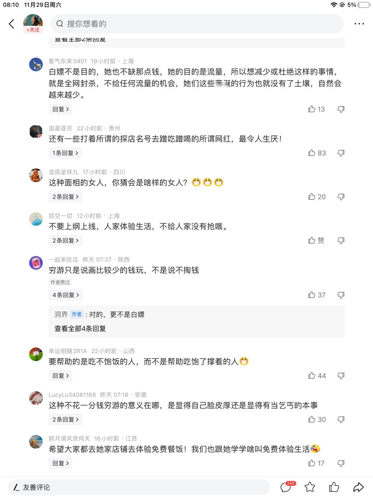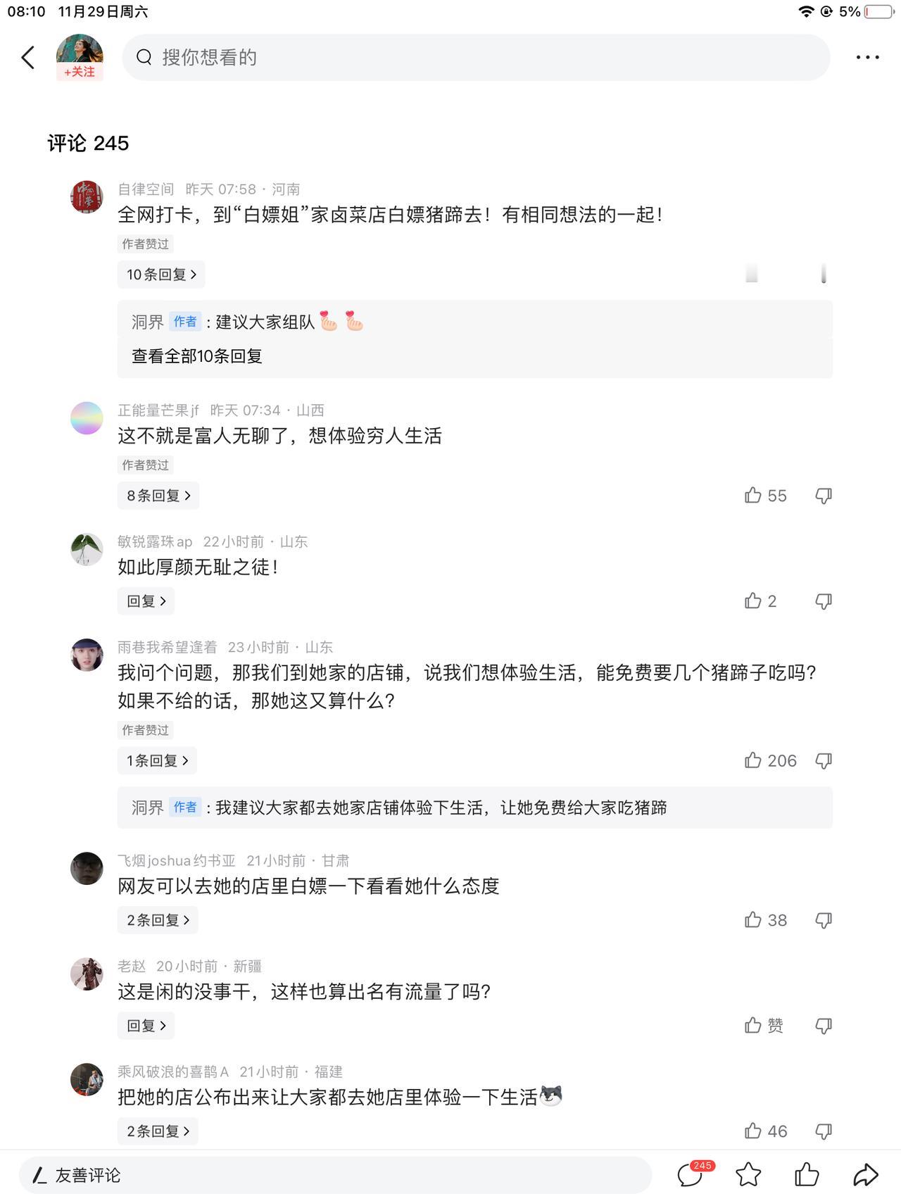 白嫖姐后续,名下多家实体店。富人体验穷人生活博流量,让流量给吞噬了。 穿着光鲜亮丽,看着是生活优渥的人。如此状况去小店让人免费赞助一顿饭,在得到明确拒绝后,说没事没事。好像不给她白吃,是人家的错,她原谅人了。真是不知个死活口儿。凭什么啊,该她的啊? 想体验吃不上饭去荒野求生,那里饿的半死,没吃的,没🔥,不会钻木取火的都吃生的。 富人的掠夺思维,张嘴三分利,你给就给,不给也不损失什么。给了,损失的是对方。自己拿到的是流量。显然店家没上当,而且,人家开店的,也不是穷人,人家有自己的思维逻辑。帮助,也是帮助那种真正吃不上饭的人。弱势群体。 自己有卤肉饭,可以真空包装路上带着,饿了拿出来啃两口。反过来说,如果别人去她的卤肉店,吃白食,…就是纯体验,有课程需要,像她一样,她会舍吗?应该是够呛。想占便宜的人,自己荷包捂的都很紧。