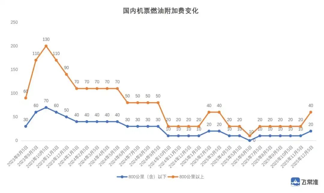 自2025年12月5日(出票日期)起,国内所有航线燃油附加费收取标准为: