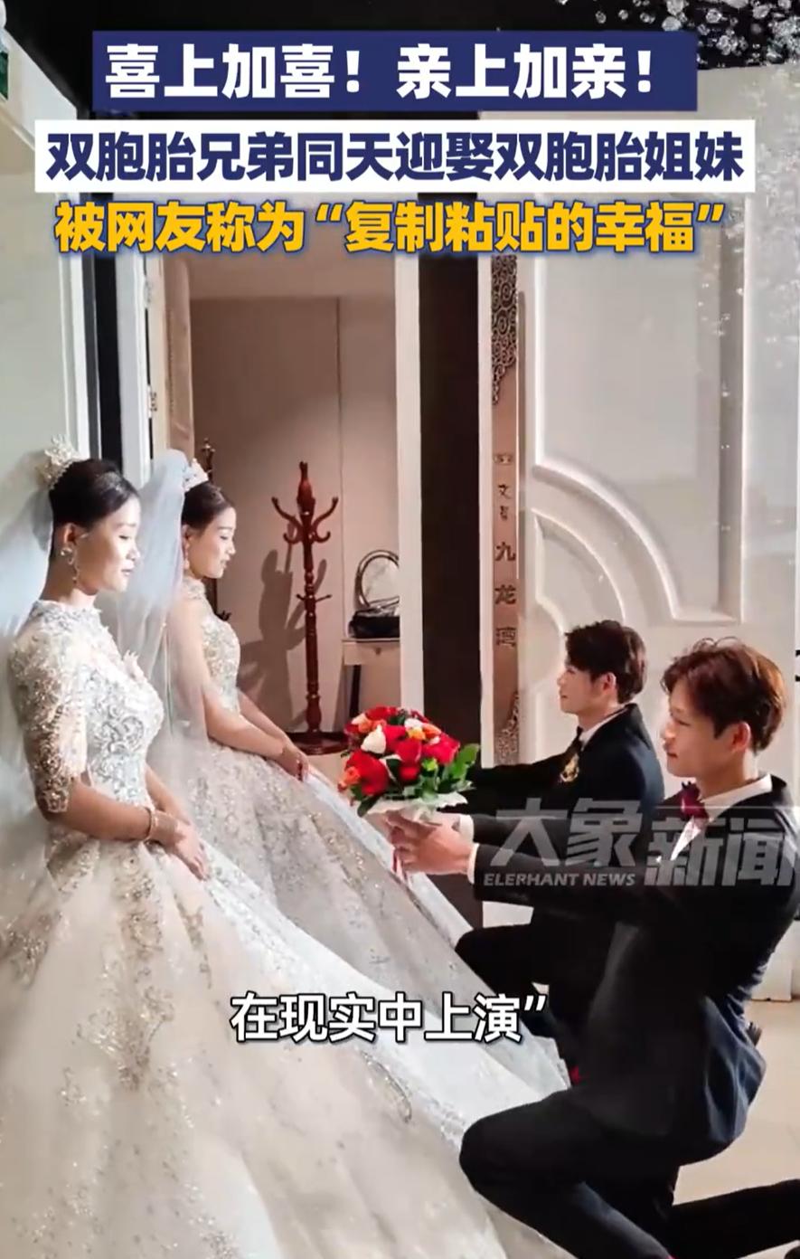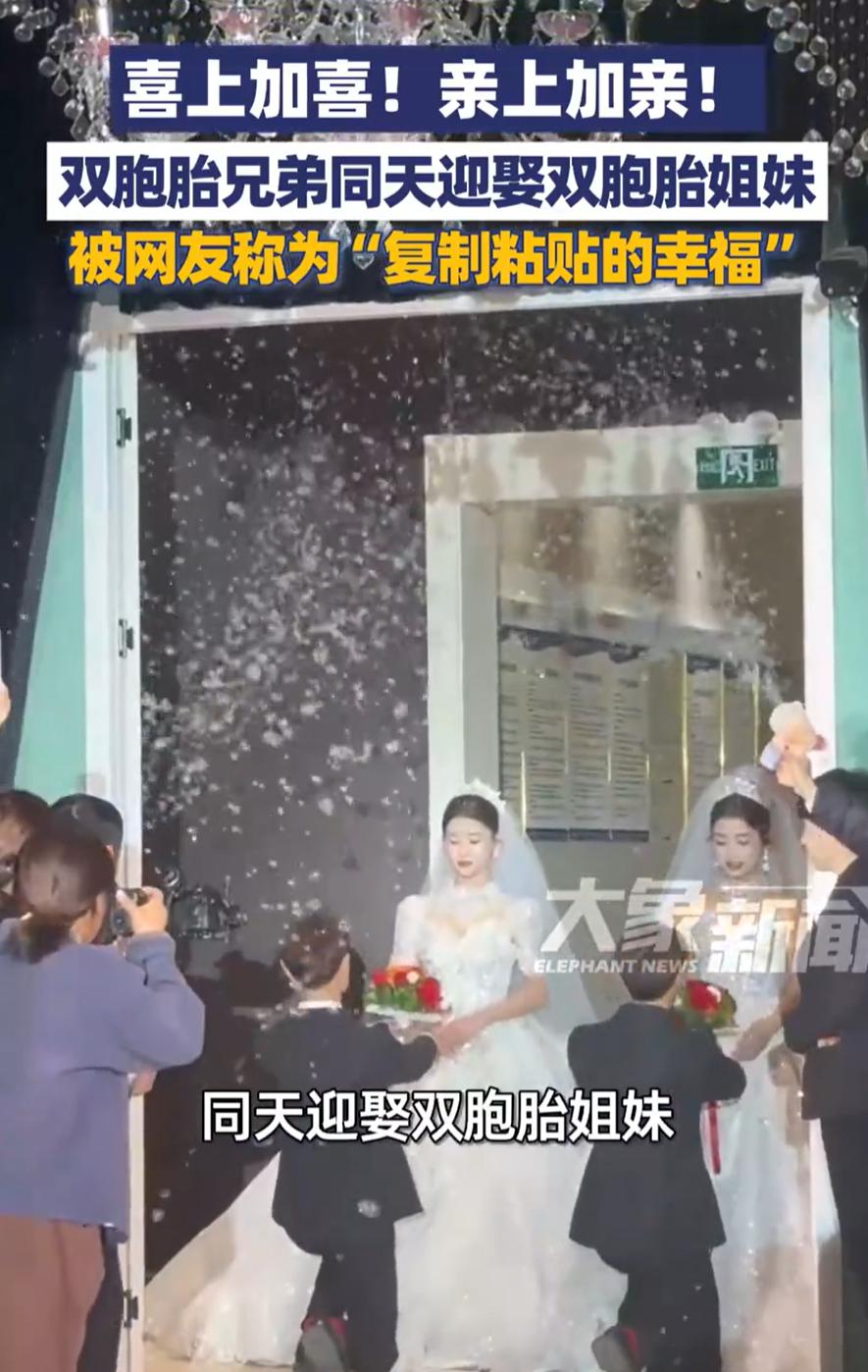 这真是喜上加喜!河南商丘,一对双胞胎兄弟选择同一天结婚,不过让人意外的是,两人的新娘还是一对双胞胎姐妹,婚礼现场,除了两方的家长,来宾几乎分不清谁是哥哥弟弟,谁是姐姐妹妹。网友:复制粘贴的幸福 婚礼现场,两对新人并排站着。四个人的装扮完全同步,兄弟俩身上的西装颜色、剪裁、领结都一样,站姿都像是从一个模子里刻出来的。姐妹俩的婚纱也是一个风格,裙摆垂得干干净净,头纱轻轻披在肩上,从远处看几乎像两束一模一样的白色光 迎宾环节最热闹。亲友们刚到门口就愣住,看着两对新人来回切换视线,谁都怕自己喊错人。有人笑着举手机拍视频,有人靠近以后还要再确认一遍,兄弟俩被问得次数多了,干脆都用点头回应,倒也没有一点尴尬。姐妹俩站在旁边互相看一眼,两人都憋着笑,像是从小就习惯一起面对这种局面 有人说,这是喜上加喜。也有人说,这是命中注定的缘分。但我倒觉得,这种巧合背后,其实藏着一种温暖的必然 双胞胎从小一起长大,分享着相似的情感频率和生活方式。当他们各自寻找伴侣时,被同一类型的异性吸引,其实并不意外。而双胞胎姐妹能够理解并接纳这种特殊的家庭关系,更是难得 这种双倍的幸福,是幸运,更是智慧。它提醒我们,美好的关系需要用心经营,无论是爱情还是亲情。日子还长,未来的路需要他们四个人一起走。但有了这样的开始,相信他们会更懂得包容与珍惜