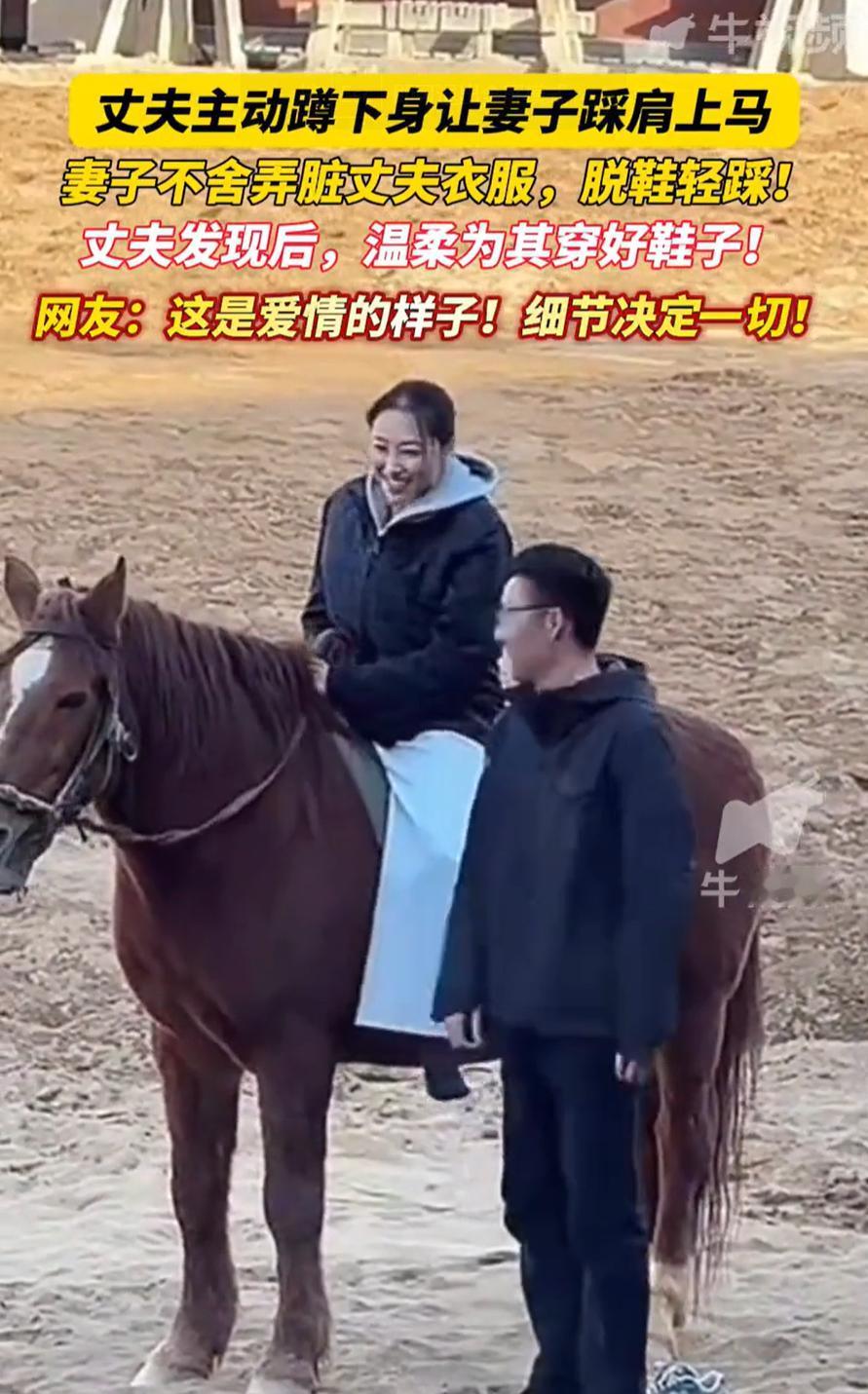 这是来秀恩爱的吧!河南开封清明上河园景区,一对夫妻去体验骑马的活动,没想到,两人从上马的动作开始,就给现场观众们吃了一波狗粮 因为这个活动是没有马蹬的,全靠观众自己想办法,别人可能是在身后托着,但这对夫妻不一样。丈夫什么也没说,直接蹲下身,示意妻子踩着自己肩膀上去。妻子犹豫了一下,忽然弯腰把鞋脱了,光脚踩在丈夫肩上,生怕弄脏了丈夫的衣服 更暖的是下一秒。丈夫察觉肩上的触感不对,回头看见妻子光着的脚,二话不说,轻轻把她扶下来,蹲在地上帮她把鞋穿好 整个过程中两人没说什么甜言蜜语,只是相视一笑。每一个动作都在说“我在乎你” 有网友说:什么甜言蜜语,海誓山盟都比不上这真心的动作。真爱 确实如此,这大概就是婚姻里最动人的模样,不是轰轰烈烈的誓言,而是藏在细节里的体贴。他愿意为你弯腰,你舍不得他受累;他注意到你的小心思,并用行动回应 很多夫妻相处久了,容易忽略这些细微处的关怀。总觉得都是自家人,不必太讲究。可正是这些看似多余的顾虑,才是感情最好的保鲜剂 好的感情从来不是单方面的付出,而是双向的细心。你为我考虑一分,我为你多想一寸,这样日子才能越过越暖