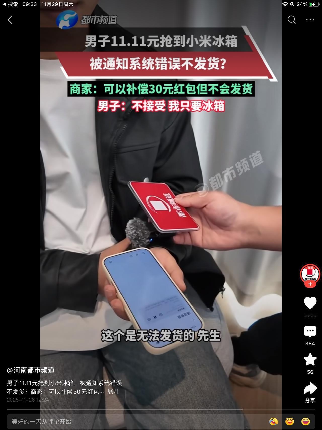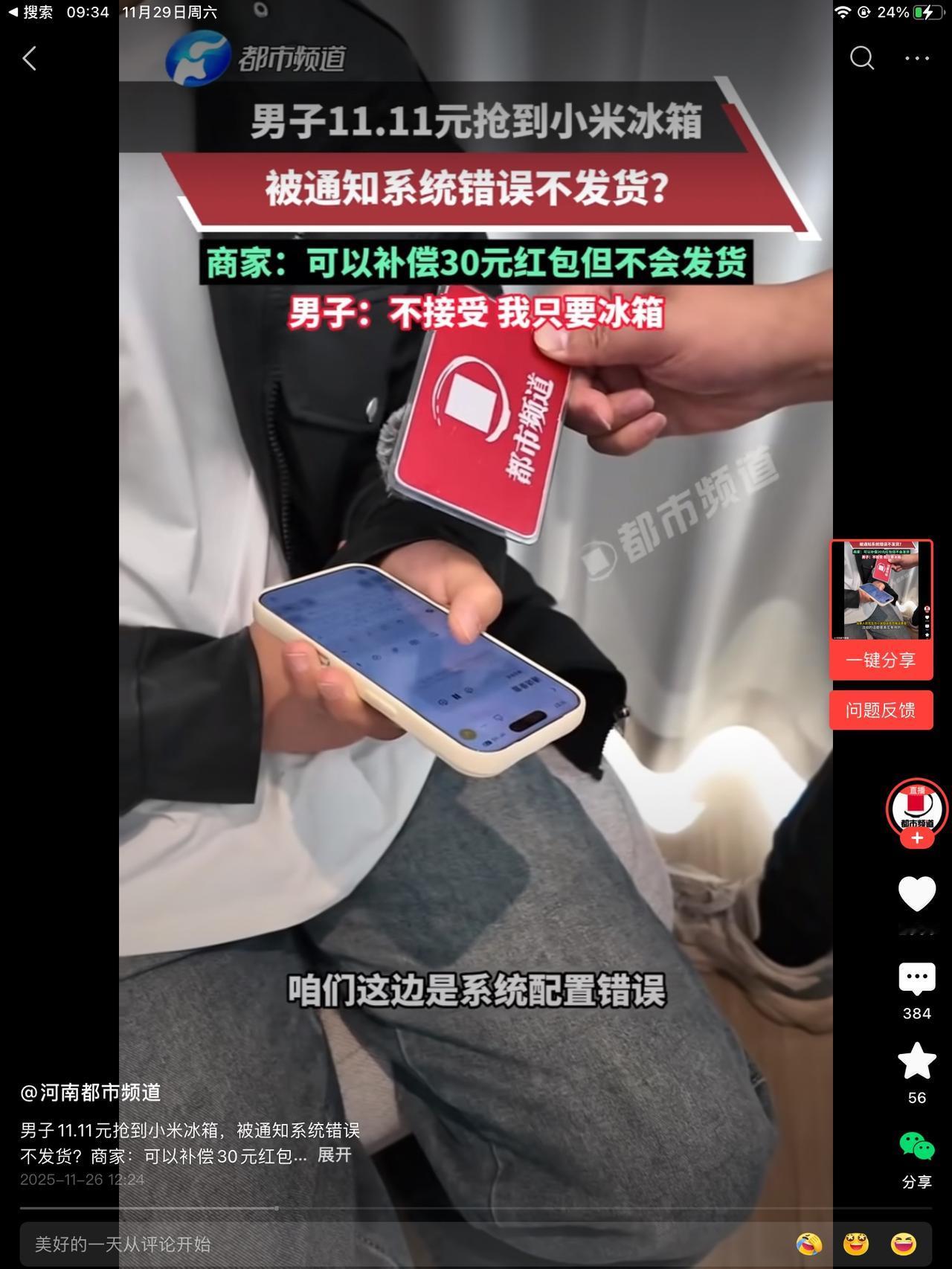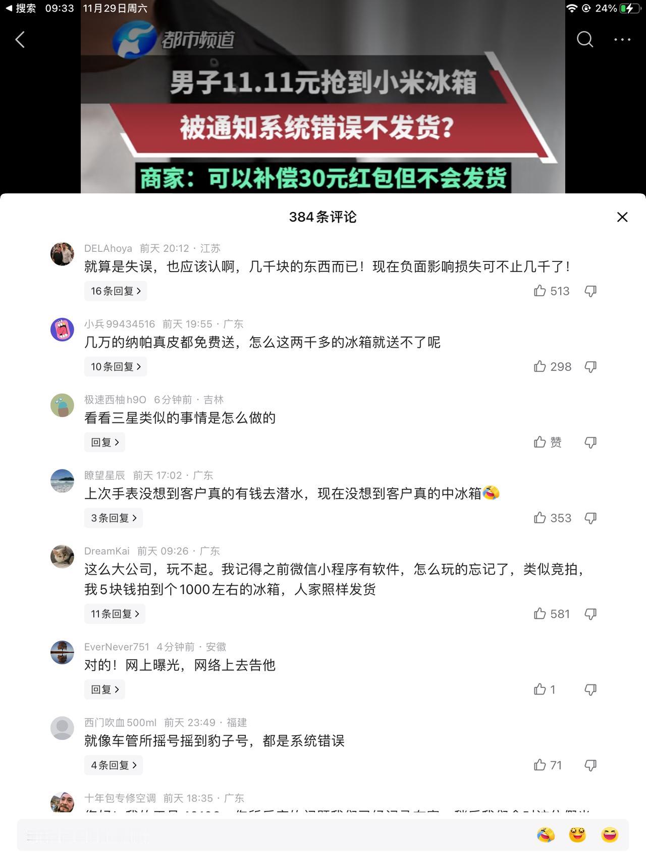 1000万的捐款大家给你鼓掌。感谢对火灾的受灾的支持。可11块1毛1的冰箱不能发货!活动是真实有效的,只是你的系统配置错误。这话怎么理解? 是说,如果是我们安排的内部人员抢到了,这就有效,因为不用发货。被外面的人抢到了,就不行了,因为真要发货。所以系统配置错误。是这样吗? 只能给您发一个三十块钱的补偿券,你爱要不要,不要拉倒。拉倒就拉倒,一百年不准变! 至今还没有发货,但此事的影响已经远超11块的千万倍了。得不偿失啊,难道他不知道吗?还是装糊涂,他为什么会装糊涂? 企业对社会有社会责任,对个人就没有了吗?哪怕你不发货,补偿大一点也好啊?补个三头五百的,对吧,你你就这样赤果果的耍起了无赖!你这唱的哪出儿啊?