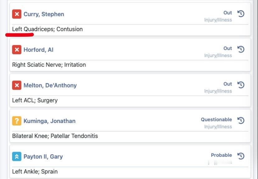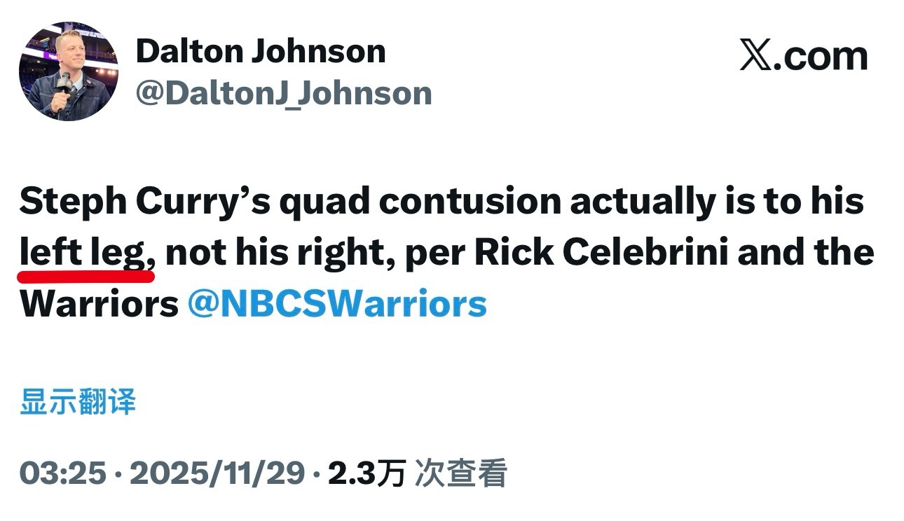 左右搞错了勇士官方、队医和跟队记者今天先后作出更正,库里的股四头肌挫伤发生在他的左腿而不是右腿。