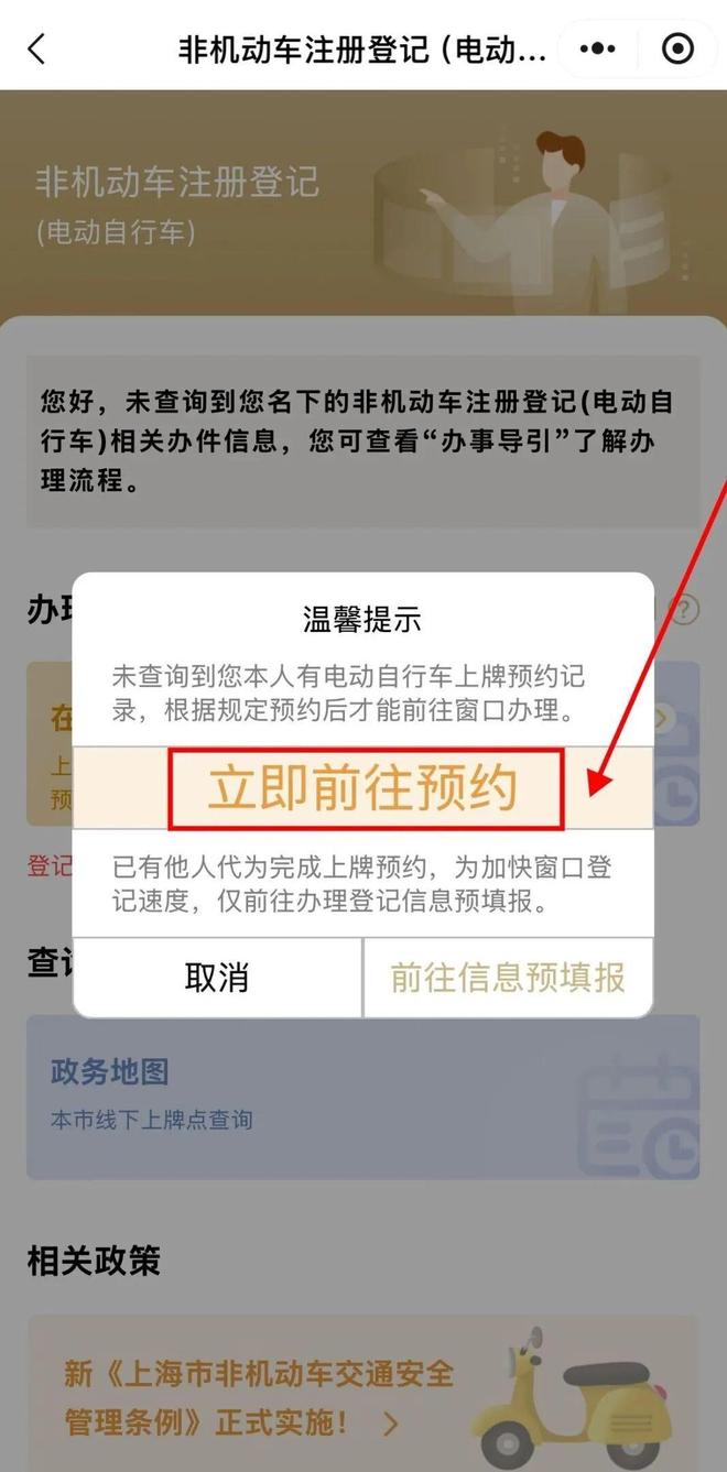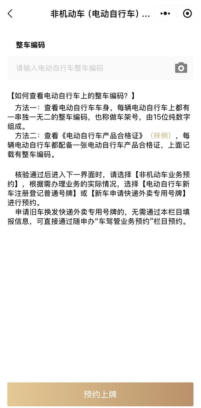3.在“非机动车注册登记(电动自行车)”专区内,点击办理服务的“在线办理”,根据提示点击“立即前往预约”,输入您的整车编码后点击“预约上牌”。
