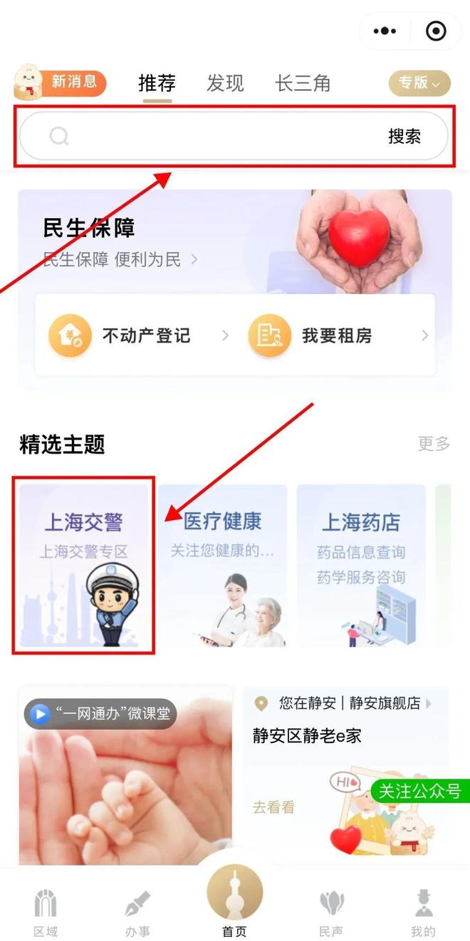 1.打开“随申办市民云”(app/微信小程序/支付宝小程序),首页搜索栏或下滑找到“上海交警”,点击进入。