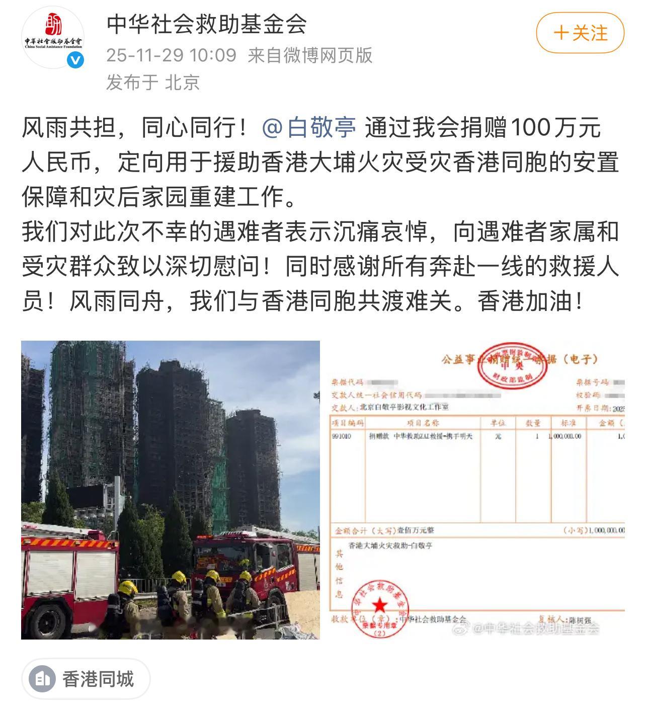 白敬亭通过中华社会救助基金会捐赠人民币100万元,用于支援香港大埔灾后重建!愿同