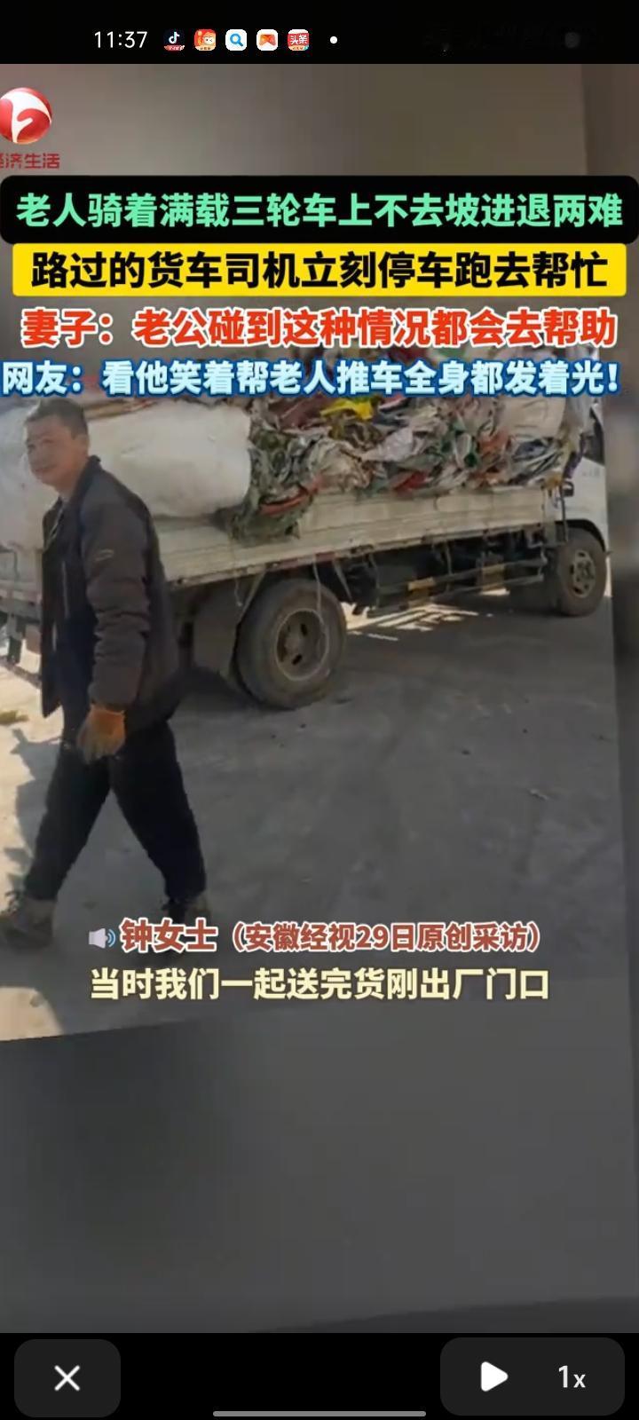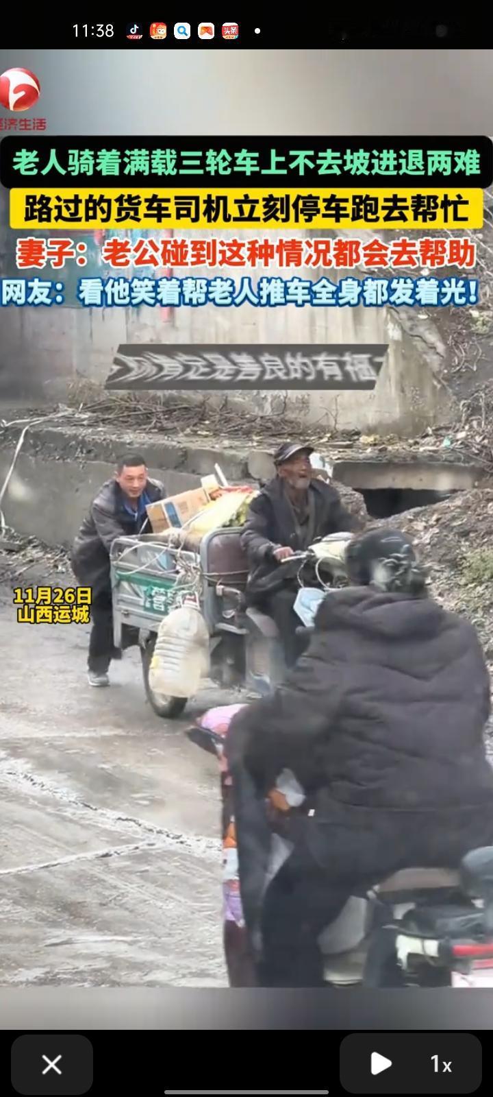 11月26日,山西运城。男子在干废品回收工作,刚出厂门口看见一位大爷骑着三轮车上不了坡,男子毫不犹豫的跑去帮忙,把三轮车推上去了。这个世界的美好莫过于爱心的传递,希望每个人都被温柔以待。