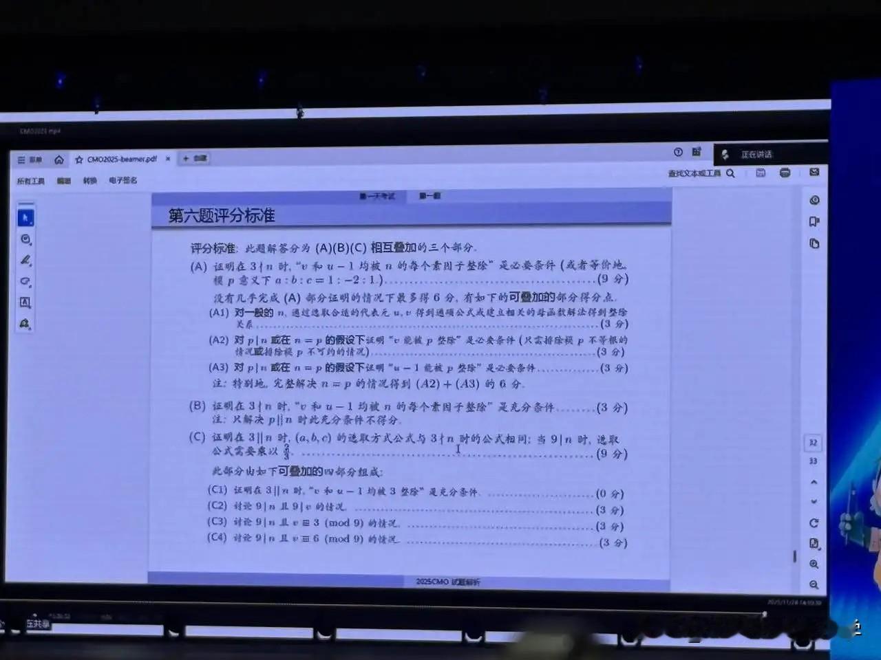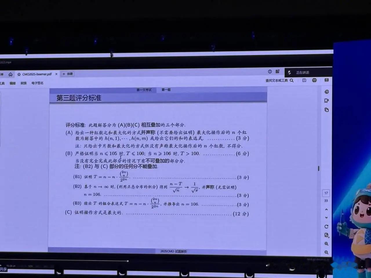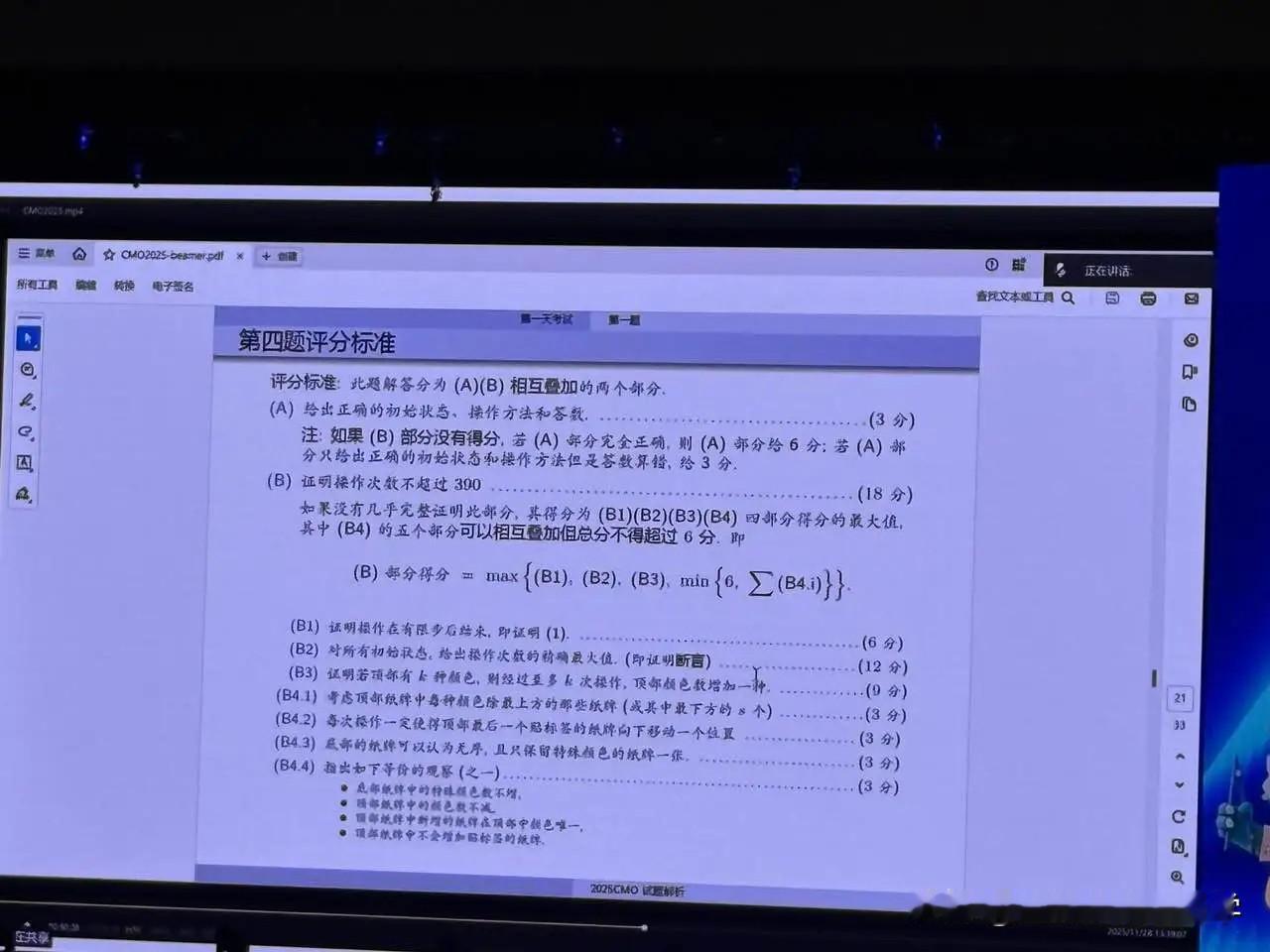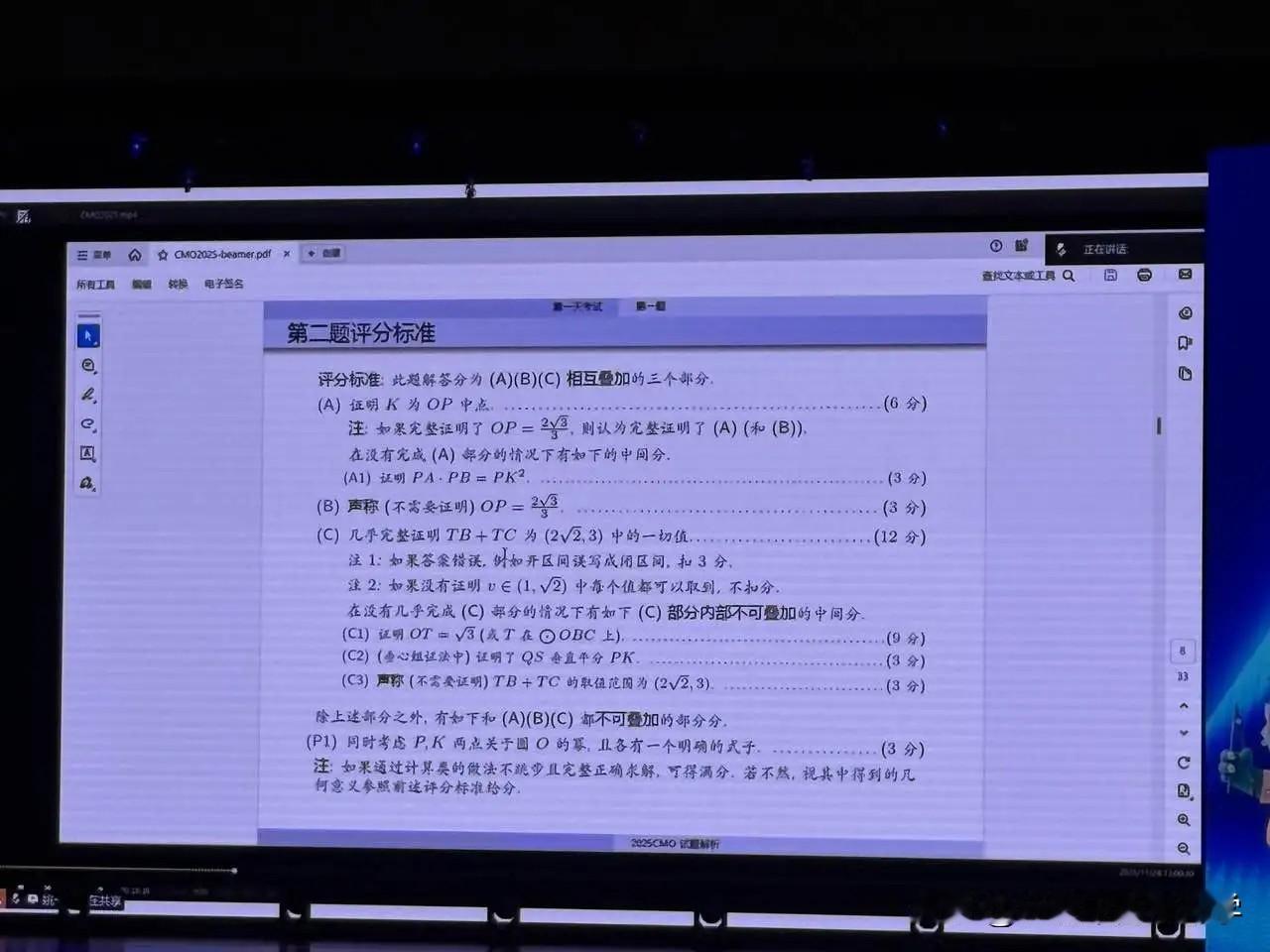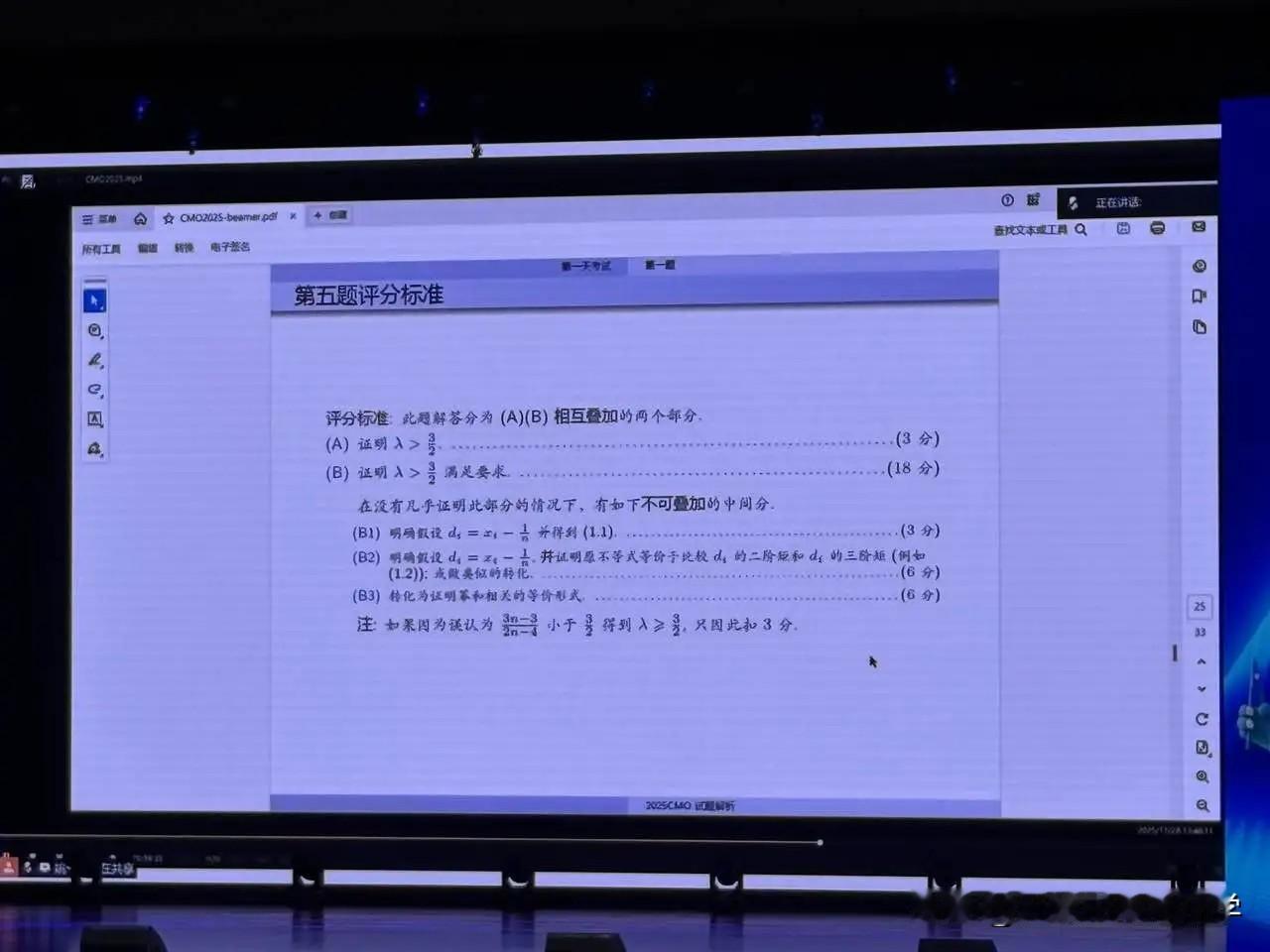 2025年CMO已经官宣出分了, 昨天晚上讲了所有题目的得分点, 考生可以根据得分点评估自己的分数, 今天早上各位选手就已经查到了自己分数, 目前知道的有90分的,有81分, 看来今年的分数都不算低。 因为今年题目能做出4道题的人还是不少, 而第6题如果能拿到得分点, 前面4题还能做到不扣分的情况, 这就能保证分数能上90了, 而第6题的加权系数是1.2, 如果在同分情况下,第6题能拿分, 离国集就已经非常近了。