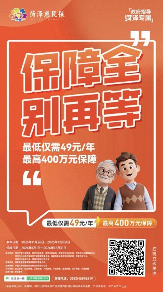 近日,“菏泽惠民保2026”上线。菏泽惠民保,用一顿饭的钱,为全家备好百万守护。政府指导,安心可靠。不为“万一”的恐慌,只为“一万个”安心的日常。守护孩子的欢笑,支撑父母的晚年,给自己奔波的底气。这份政府的暖心工程,是每个菏泽家庭最该备上的“安心锁”。菏泽惠民保2026,一年最低49元,最高400万保障。不限年龄、不限职业、不限既往病史。扫描二维码,立即锁定这份安心!