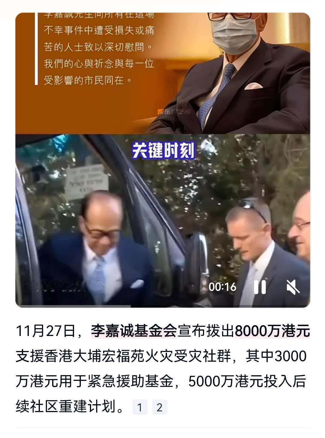香港大火,全国悲痛!![流泪][流泪][流泪] 针对灾后重建,却出现一个难以置信的事!!! 就是李嘉诚紧急拿出8000万,为灾后重建做出支援!!! 这行为让很多人肃然起敬。 曾经很多人痛骂李嘉诚,说他吸中国人的血! 现在房子公摊面积就是他搞出来的, 在国内大量囤地,等地价上涨赚取差价, 说他不支持国家建设等。 但现在香港大火,他第一时间捐献8000万, 这是实实在在的真金白银,这是让我们没有想到的, 说明李嘉诚大格局,也是心系人民的。 人设发生绝地翻转! 对此你怎么看呢?