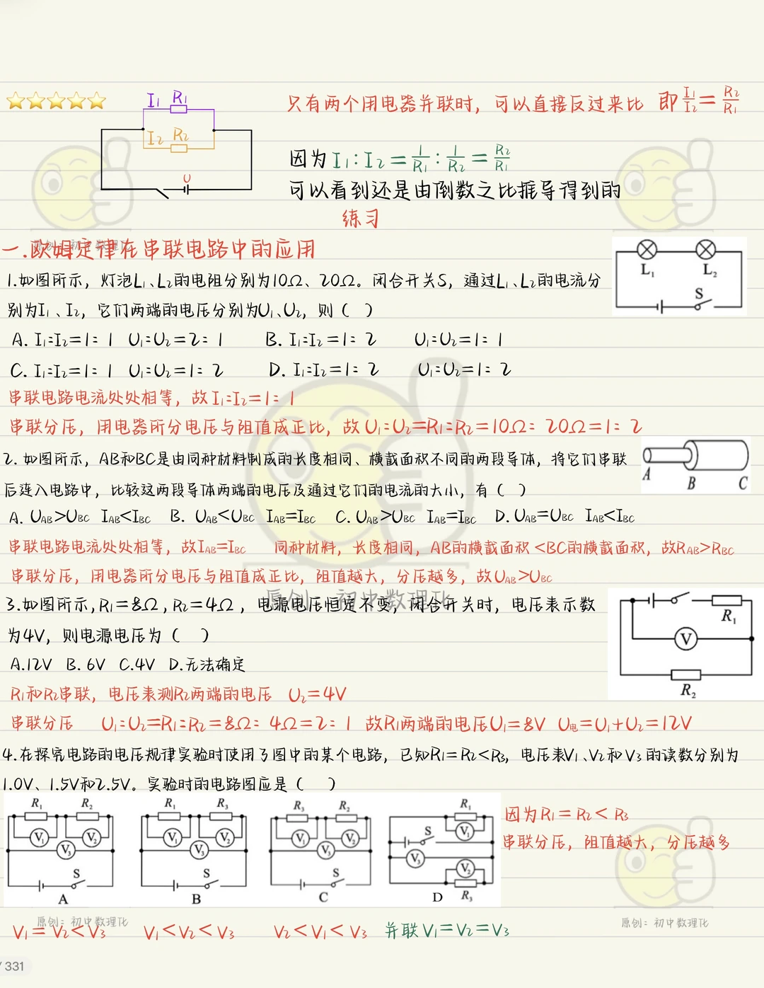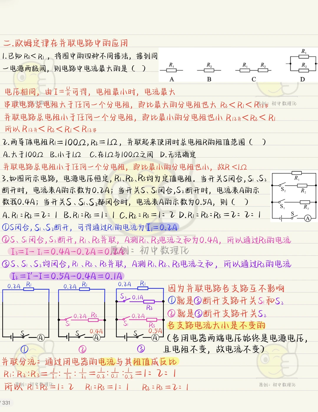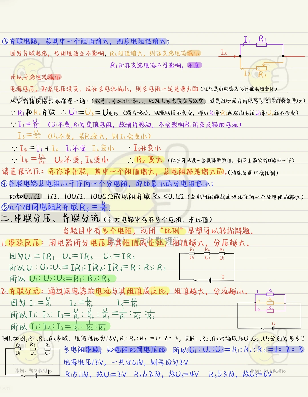 串联分压:在串联电路中,总电压等于各电阻电压之和。电阻越大,其分得的电压也越大。电压按电阻值正比分配。 并联分流:在并联电路中,干路电流等于各支路电流之和。电阻越大,其分得的电流反而越小。电流按电阻值反比分配。 核心是欧姆定律:I = U/R,它是分析电路的基础。