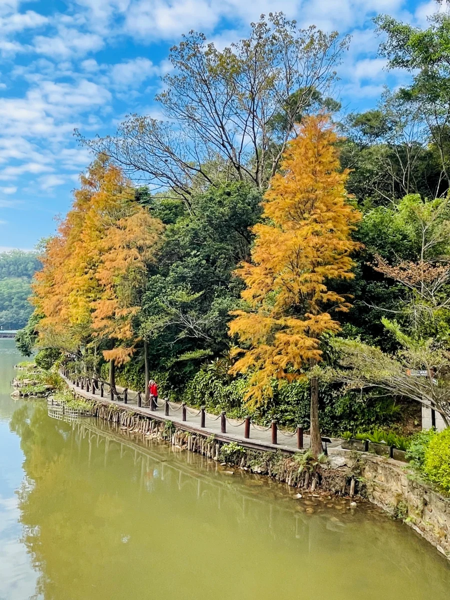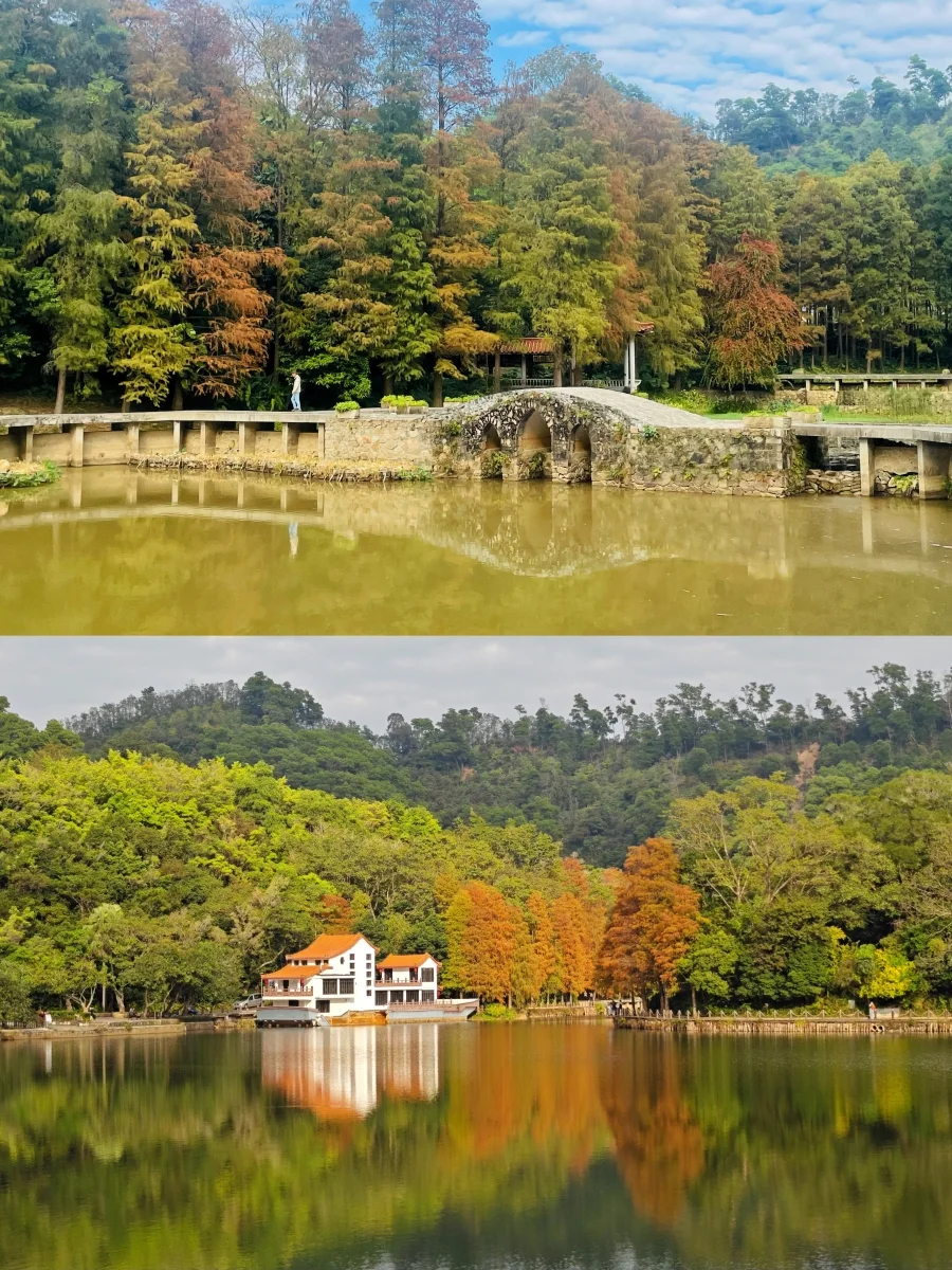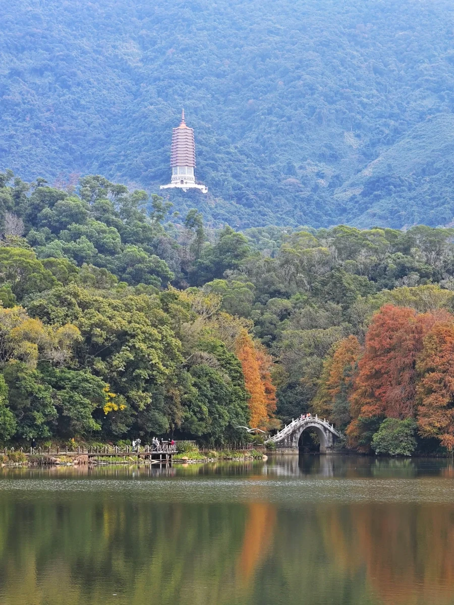 湖中寺庙与落羽杉的倒影更是美轮美奂