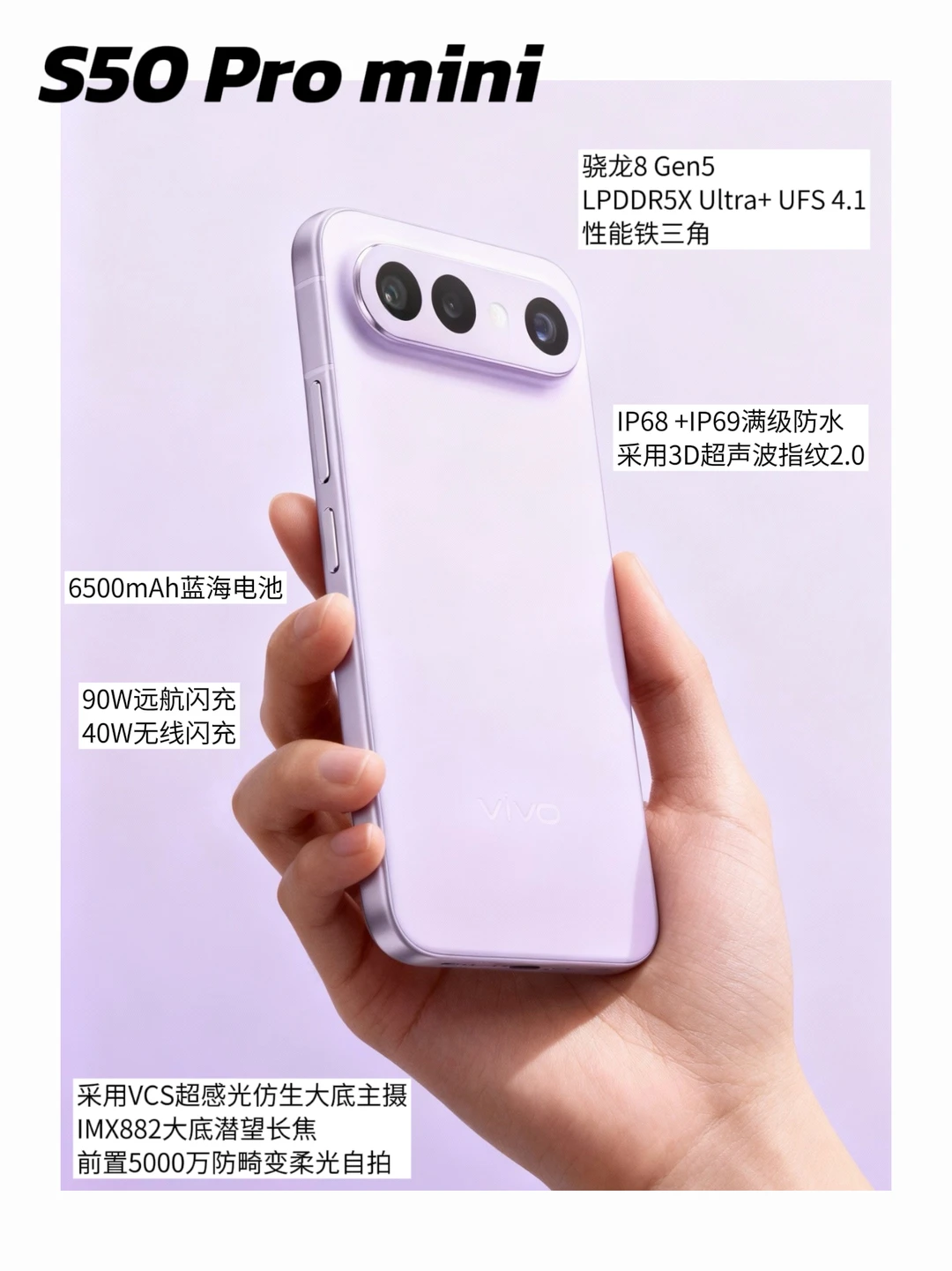 看了这段时间的消息,我对 vivo S50 Pro mini 的好奇心是真的被点满了。 小而能打的感觉很独特,外观也完全没有传统小屏机那种廉价感,甚至更像官方说的那种 “治愈系战斗天使”——温柔的外表下塞着一身狠料。 - 骁龙 8 Gen5 + LPDDR5X + UFS4.1 的 性能铁三角直接拉满,影像也是真正的旗舰级:VCS 超感光仿生大底主摄、IMX882 大底潜望长焦、5000 万防畸变柔光自拍,再加上旗舰同款的全焦段变焦闪光灯,以及新加入的 高光慢动作运镜、变焦运镜,看一眼就知道它不只是 长焦 Live 神器,夜景人像估计也会非常稳。 - 其他体验也没省:3D 超声波指纹 2.0、IP69+IP68 满级防水、X 轴马达,还有 6500mAh 蓝海大电池配 90W 远航闪充 + 40W 无线闪充,妥妥的旗舰配置。 - 当然,同系列的 vivo S50 也保持了家族特色,“告白”配色的纱缎光刻工艺真的太加分,干净、耐看,拍照风格依旧是 S 系列最拿手的那种氛围感人像。 - 总结下来,vivo S50 Pro mini 是能打的那一款,vivo S50 是能拍的那一款。 这次的升级都很实在,我现在真的蛮期待的!