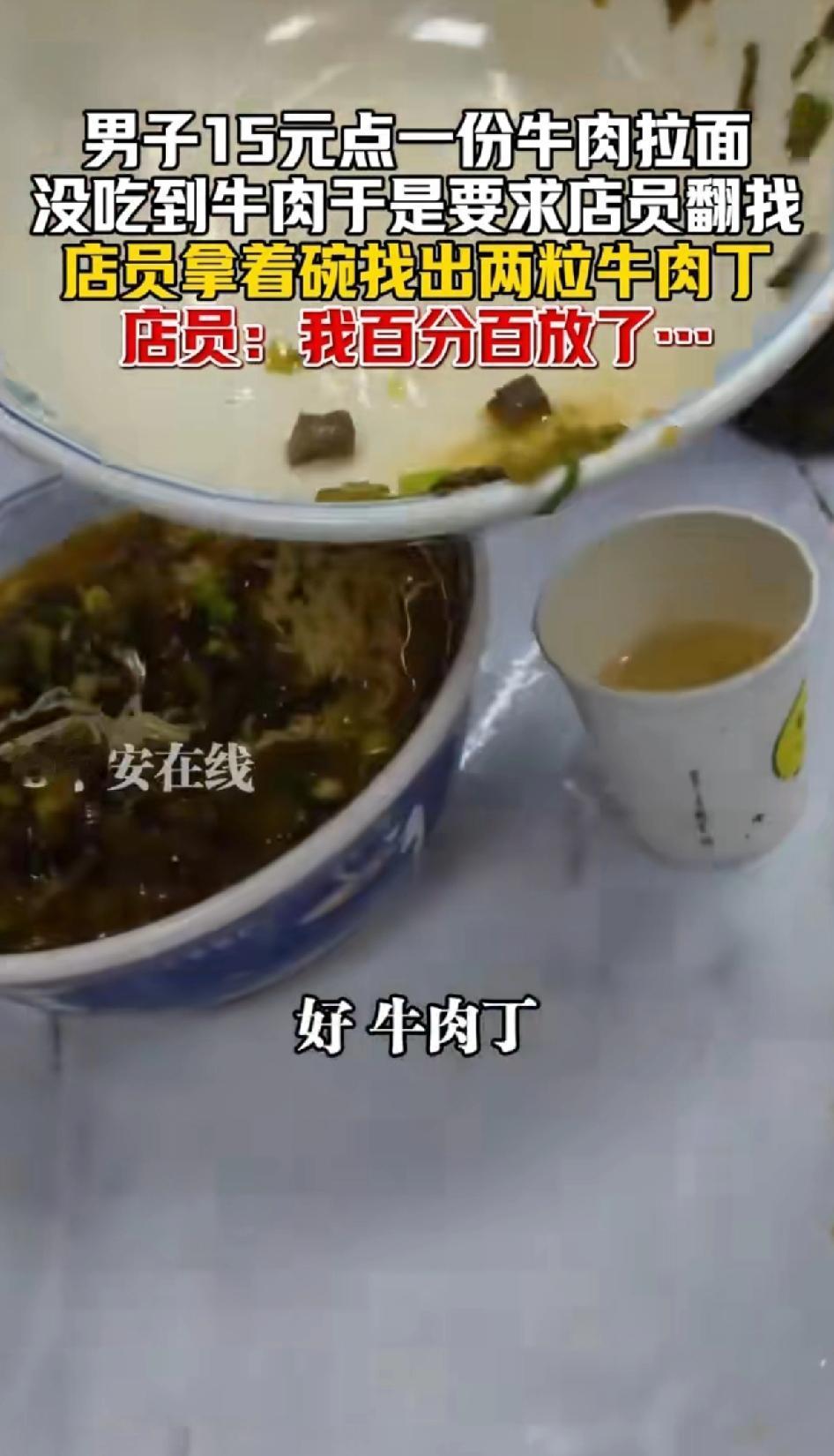 男子15元点了一碗牛肉拉面,没找到牛肉,要求店员翻找,店员过来语气肯定的表示:我肯定放了,然后仔细翻找,把面倒在另一个碗里,最终在一堆酸菜里挑出两粒,像苍蝇大小的牛肉丁。 这位男顾客让服务员翻找牛肉面里的牛肉,这种做法是多少人想做又不好意思做的。 去兰州拉面馆,十几块钱点一碗牛肉面或羊肉面,哪见过牛肉,最多飘几根蒜苗,两根香菜叶。 一个拉面馆一年也用不了一头牛。 仔细看了男子点的这碗面好歹还有一些酸菜在里面。 比我吃的牛肉面配菜多很多,我吃过的牛肉拉面,真的很正宗,碗里只有面,剩下的就是面汤了。