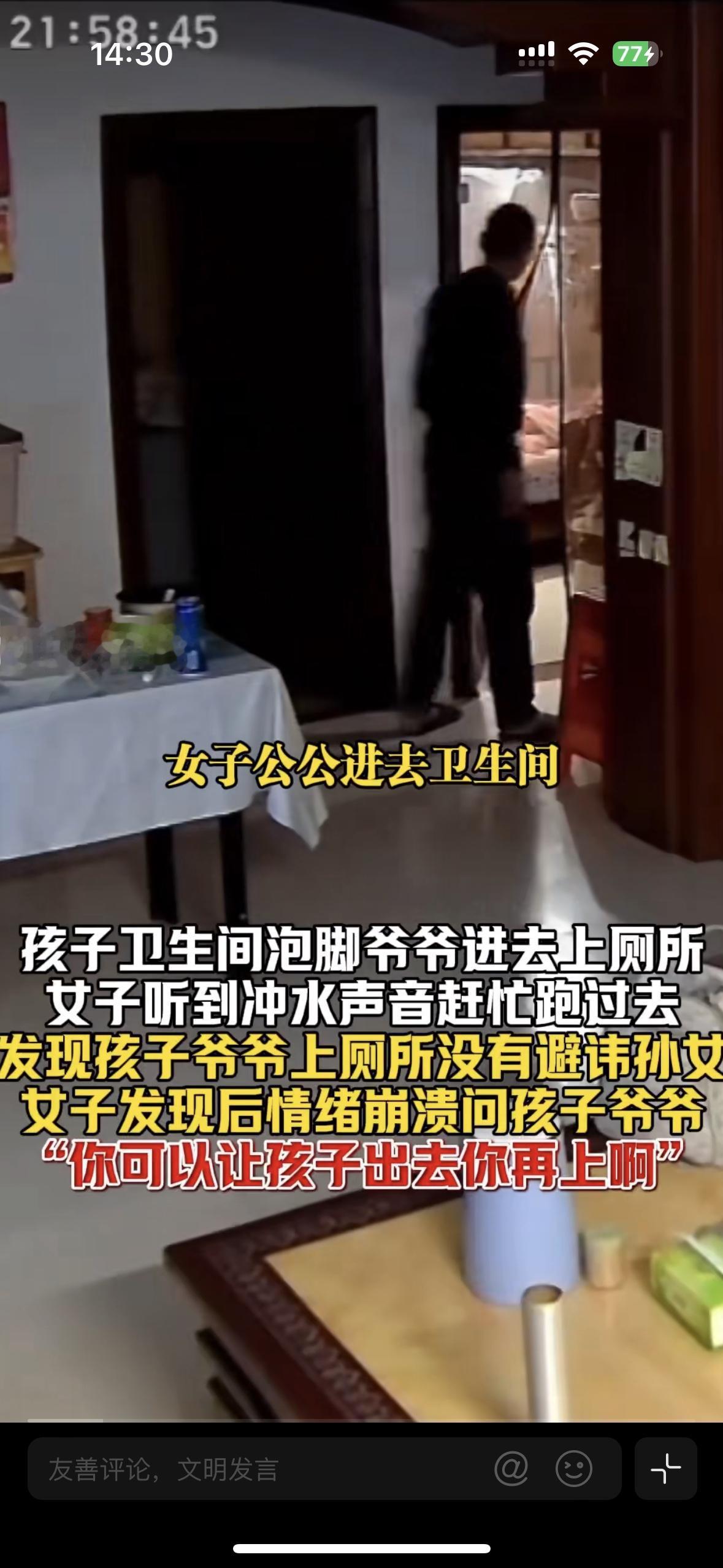 我说这是男人的通病,大家同意吗? 媳妇儿被公公气到崩溃直哭,不是因为儿子欺负她,也不是因为公公不讲理 是因为公公当着正在洗脚的女儿面前上厕所 爷爷在上厕所的时候不避讳正在泡脚的孙女,可是男女有别,更不要说年龄差这么多的祖孙二人!这不就是为老不尊吗?故意耍流氓吗? 不只是老的爷爷,年轻的叔叔,还有上学的男生,都会随地大小便,这好像成了一种习惯,反而是被撞到的人需要躲避他们,难道去厕所里在小便的时候避讳他人就那么难吗?
