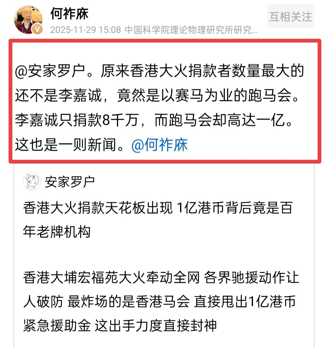 何祚庥老院士谈爱心捐款榜。 11月29日下午3点多钟,何祚庥老院士对一桩事表示很意外。何老院士说,原来李嘉诚先生不是在爱心捐款榜的榜首,却没想到榜首有变化。这榜首竟然是在香港的跑马会,其爱心捐款额达到一亿,何老院士强调这也是一则新闻。 当然,这里何老是在客观描述一件事情。所谓爱心无大小,在力所能及的范围内做到就行了。这是一场爱的传递,也彰显了中华民族的优良传统。