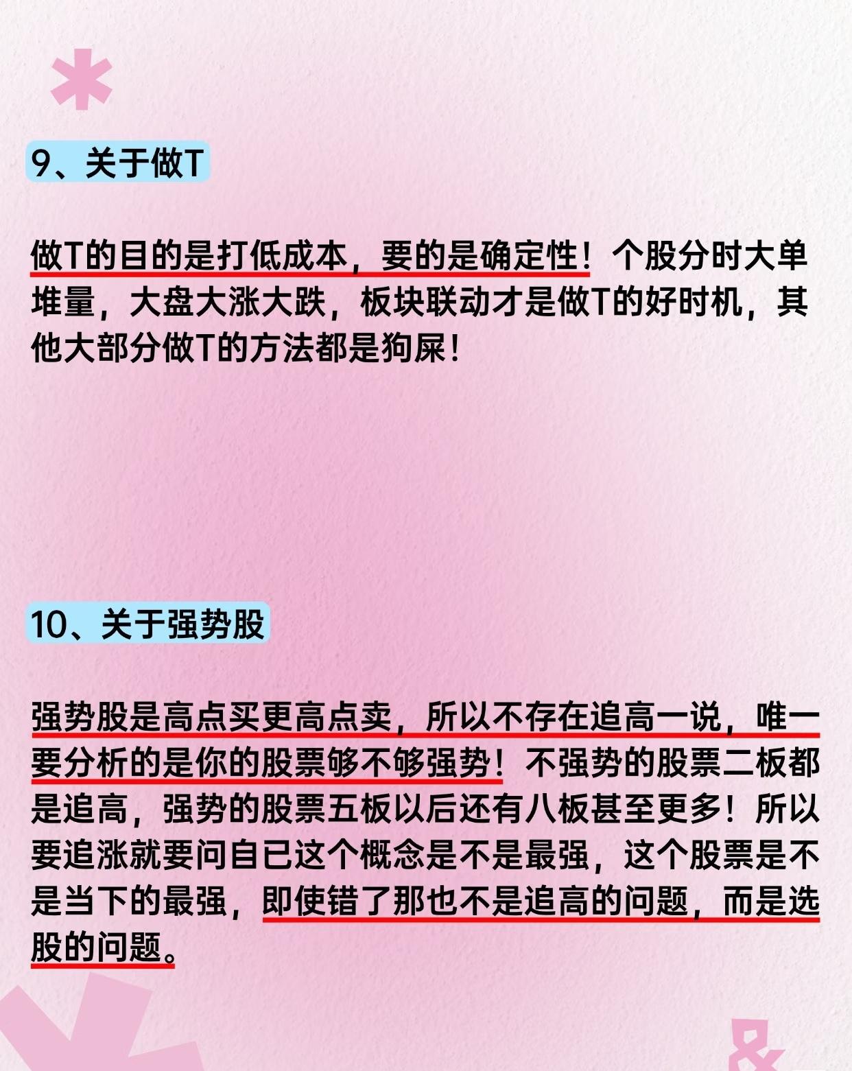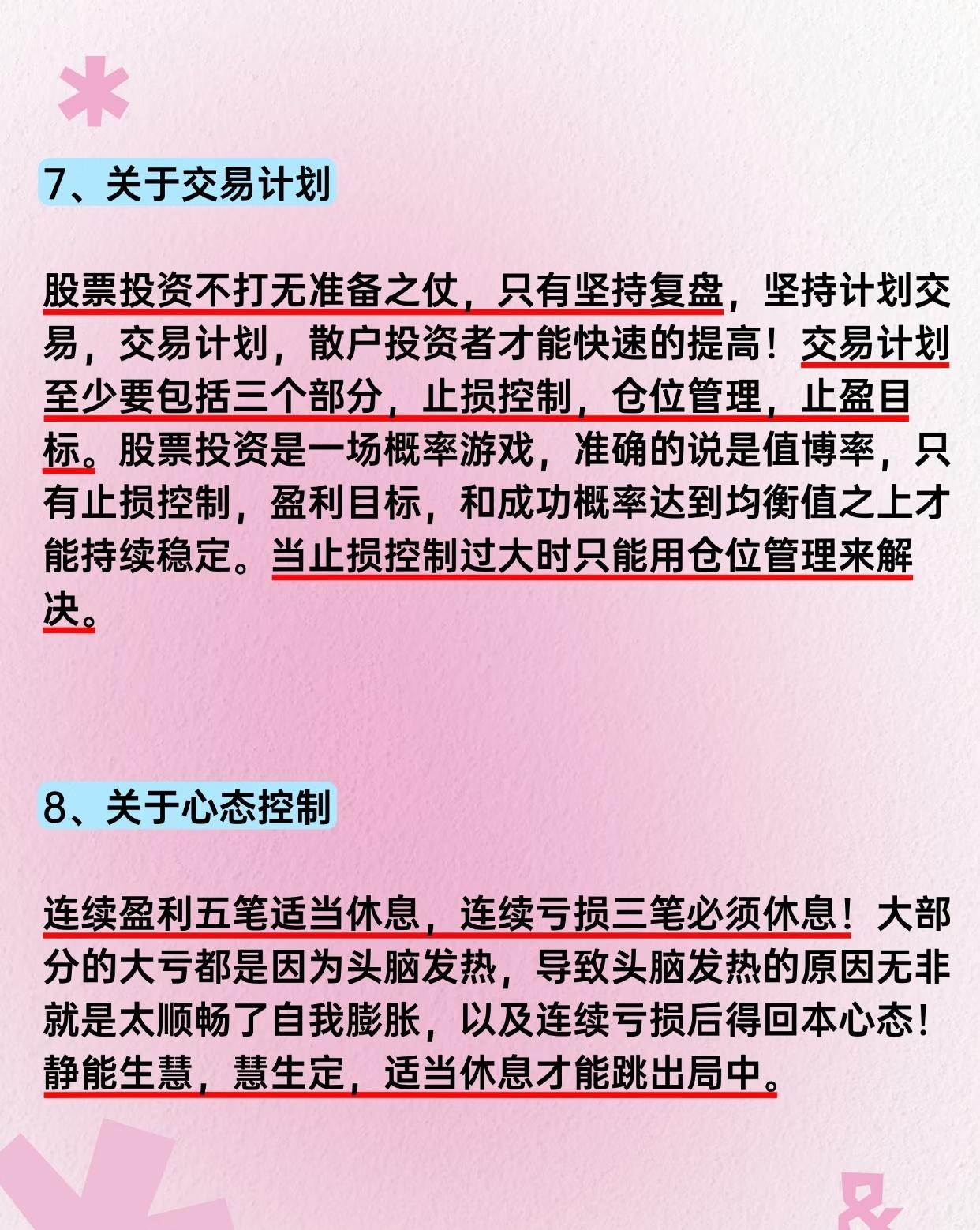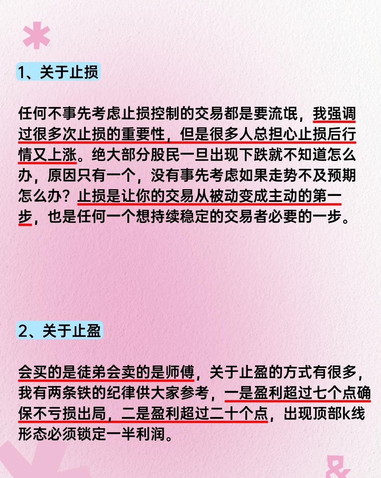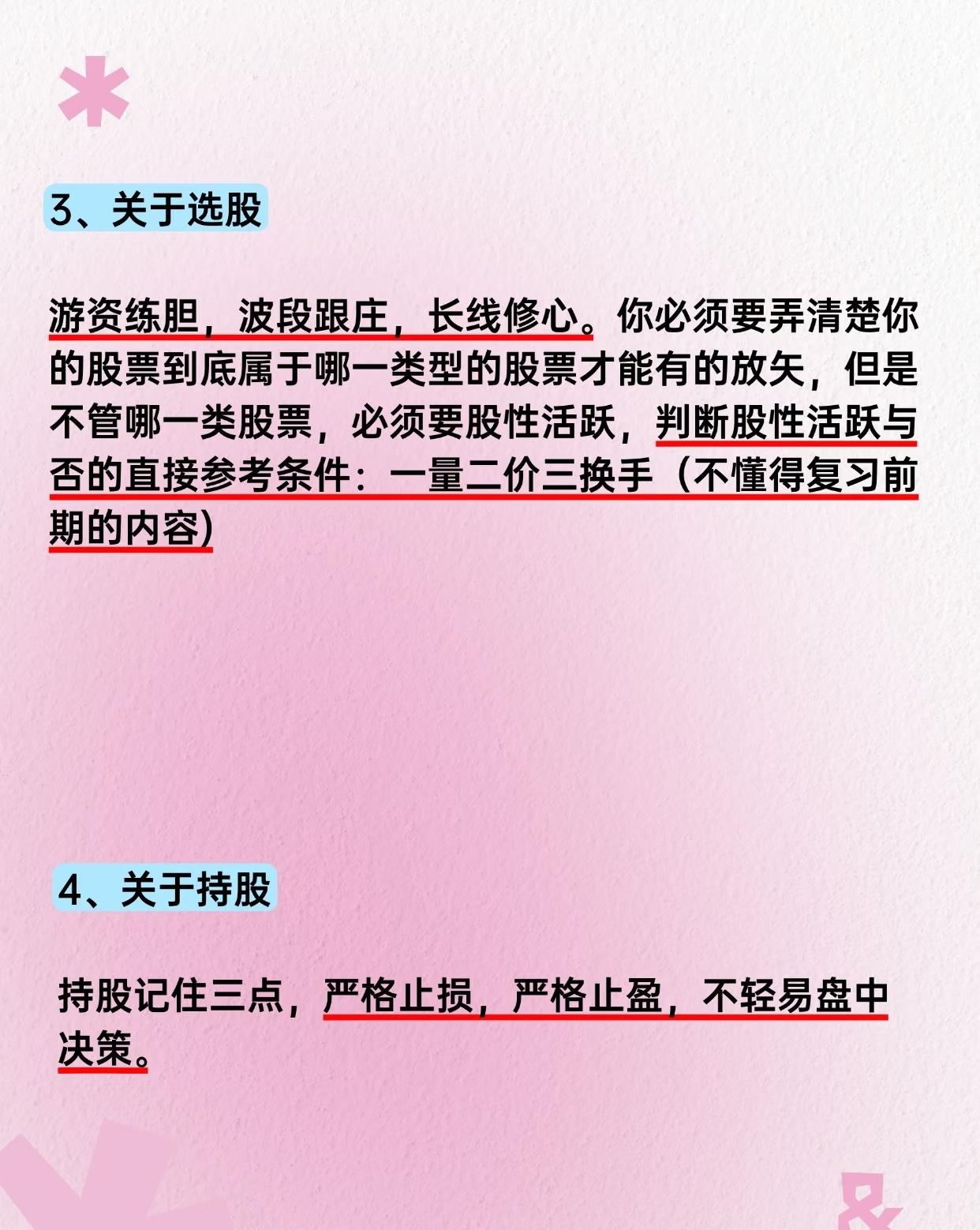 股票投资分享,涵盖从风险控制到实操策略的多维度内容,核心要点如下: 首先强调风险控制的基础——止损与止盈。止损是交易的主动第一步,任何不考虑止损的交易不负责任,能避免因下跌无预案而不知所措;止盈需遵循两条铁律:盈利超七点确保不亏出局,盈利超二十点且出现顶部K线形态时锁定一半利润,呼应“会卖是师傅”的经验。 选股与持股环节明确方向:选股需先定位类型(游资练胆、波段跟庄、长线修心),且无论哪类都要求股性活跃,判断依据为“一量二价三换手”;持股需牢记三点——严格止损、严格止盈、不轻易盘中决策。 买点与仓位管理聚焦实操:买点有三种策略——支撑位反应(跌至支撑企稳,回调三个点以上或三天以上且涨幅15%内)、箱体突破(比前高突破更安全)、惯性形成(强势股追涨/打板核心是市场情绪);仓位管理原则是“永远留可用仓位,仅当所有持仓获利时才满仓”。 交易计划与心态控制关乎长期稳定:交易计划需包含止损、仓位、止盈三部分,因投资是概率(值博率)游戏,需平衡风险收益,止损过大时用仓位调节;心态上,连续盈利五笔或亏损三笔应休息,警惕自我膨胀或急于回本的头脑发热,以“静能生慧”跳出局中。 最后针对做T与强势股细化技巧:做T目的是降成本、求确定,仅在个股分时大单堆量、大盘大涨大跌、板块联动时进行,其他方法不可取;强势股是“高点买更高点卖”,无追高之说,关键是判断是否为当下最强概念/个股,错误源于选股非追高。 整套内容从基础逻辑到具体操作,兼顾风险控制与实战技巧,强调纪律性与心态管理,为投资者提供了一套清晰的操作框架。