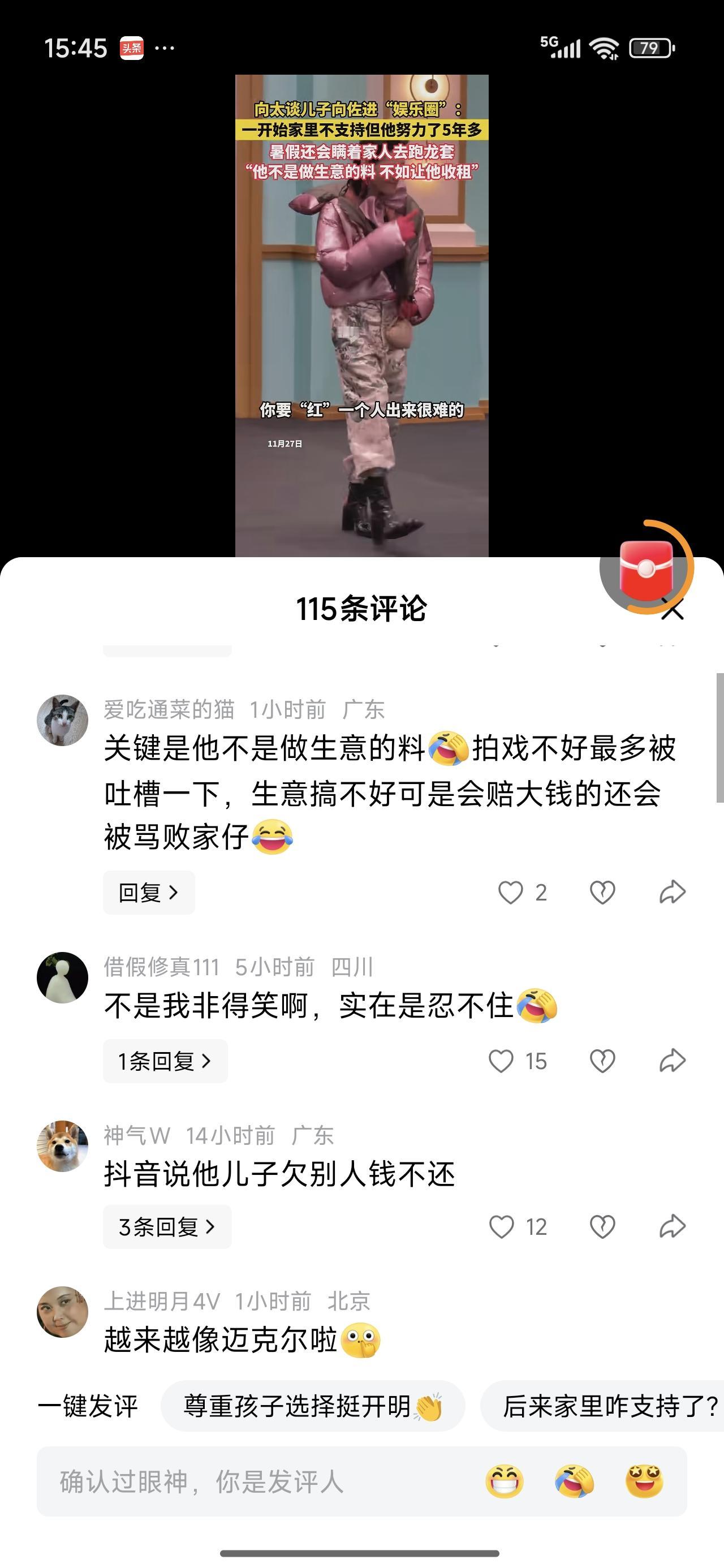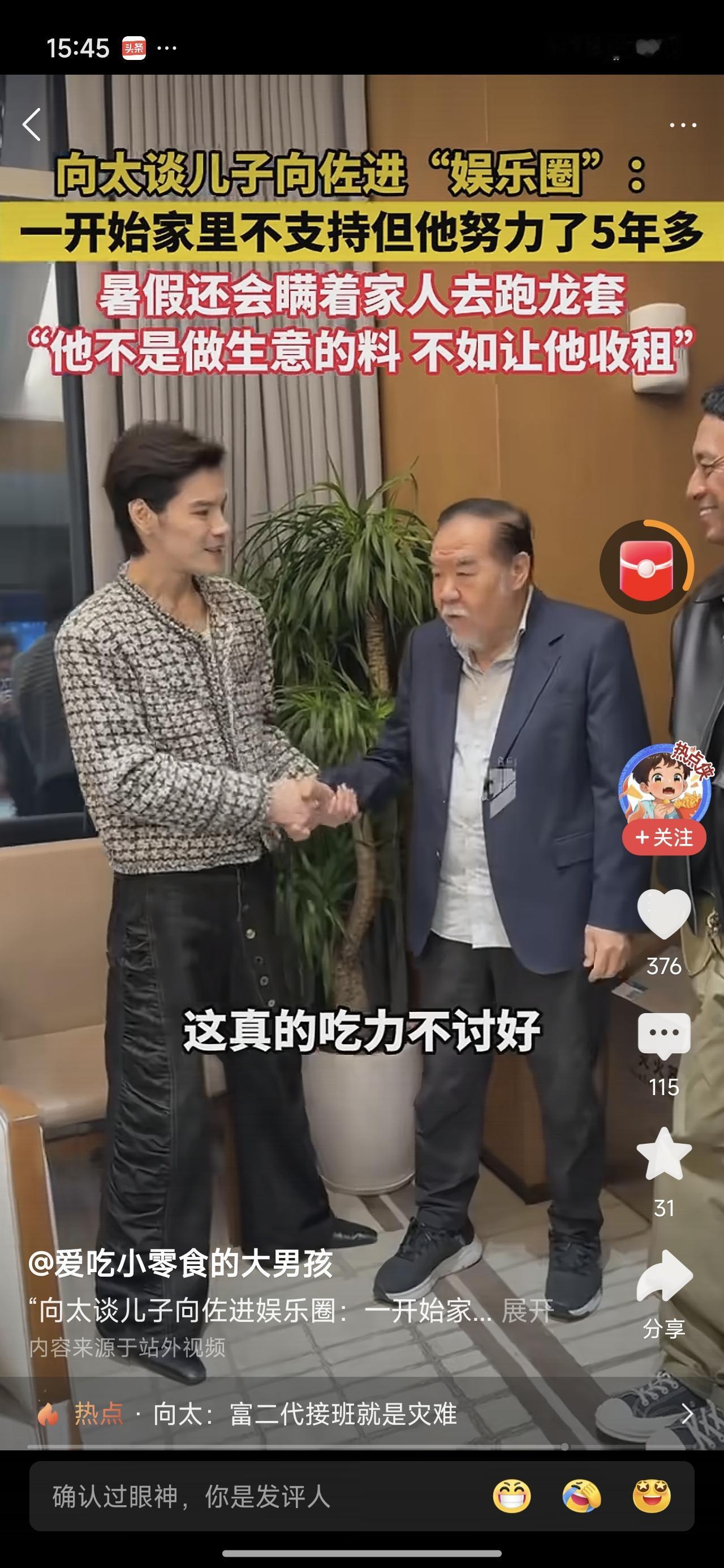 向太聊起儿子向左进娱乐圈,说他就是喜欢,背着他们去跑龙套。她们一开始是不支持的,娱乐圈推一个明星出来很难得。 他爸爸后来看儿子那么努力,没办法,只能放任他去闯了。 向太还说,不如买两套房子,给他收租金。 听完向太说这么多,真觉得富不过三代是有道理的。 穷不过三代,,是因为,娶不到媳妇,就没有儿子孙子就更不要想了。 原来,富人有富人的无奈。有命运的无根牵引。