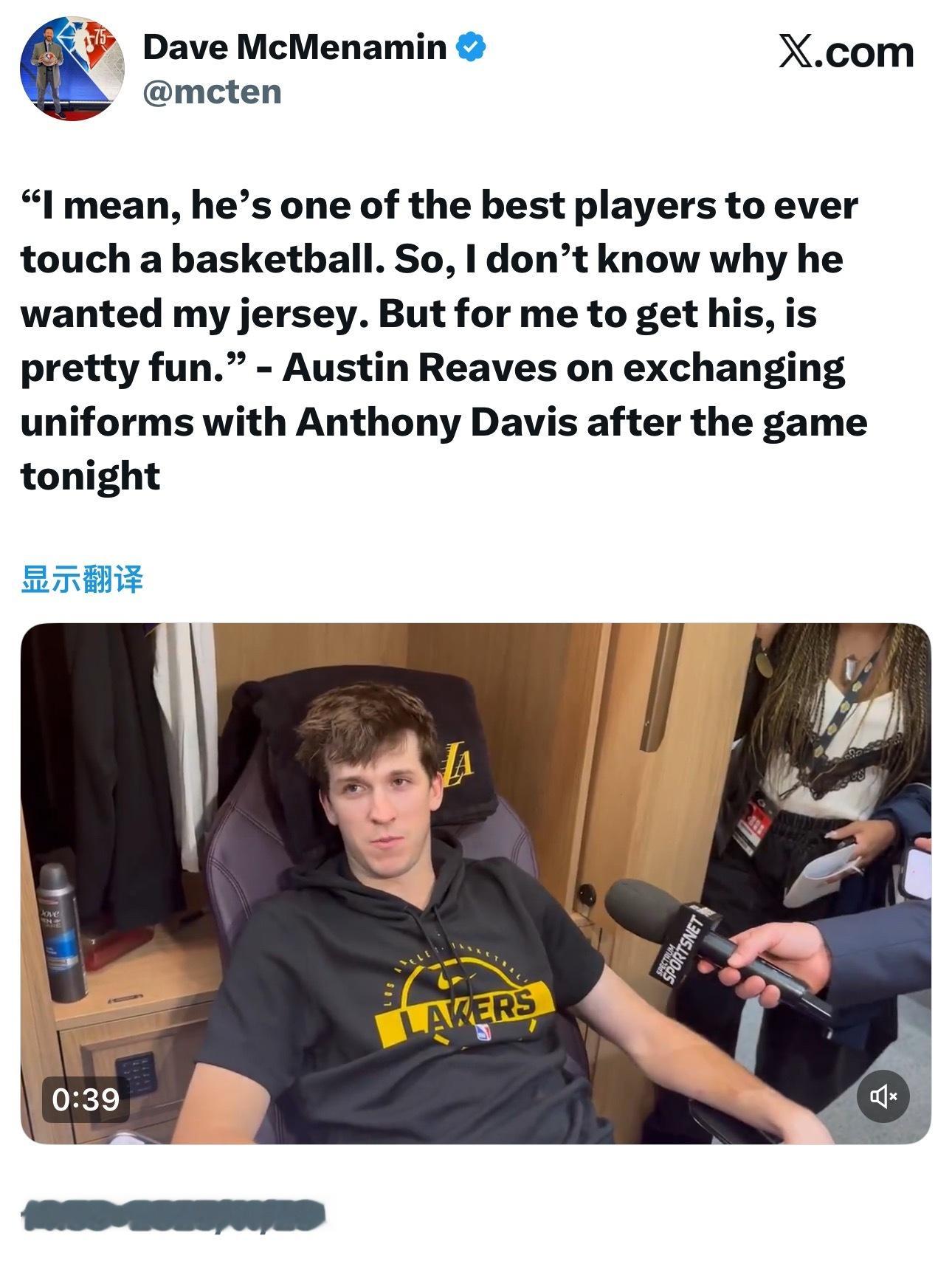 里夫斯说自己与浓眉交换了球衣:“我的意思是,AD是篮球史上最出色的球员之一。所以我不知道他为什么想要我的球衣,不过能得到他的球衣,感觉真的很棒。”