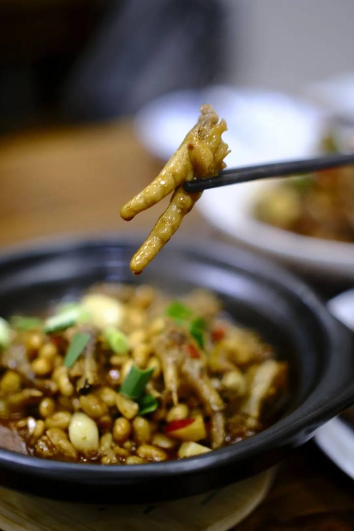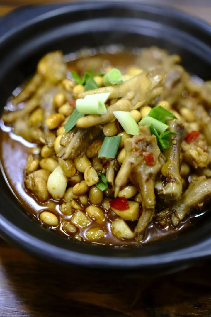 黄豆要炖酥烂,黄豆提前一天晚上清洗过后浸泡一夜,然后鸡爪飞水以后和黄豆一起下香料调味,共炖。鸡爪胶质尽出,热则汁浓,冷则带冻,微微辣,过饭香。