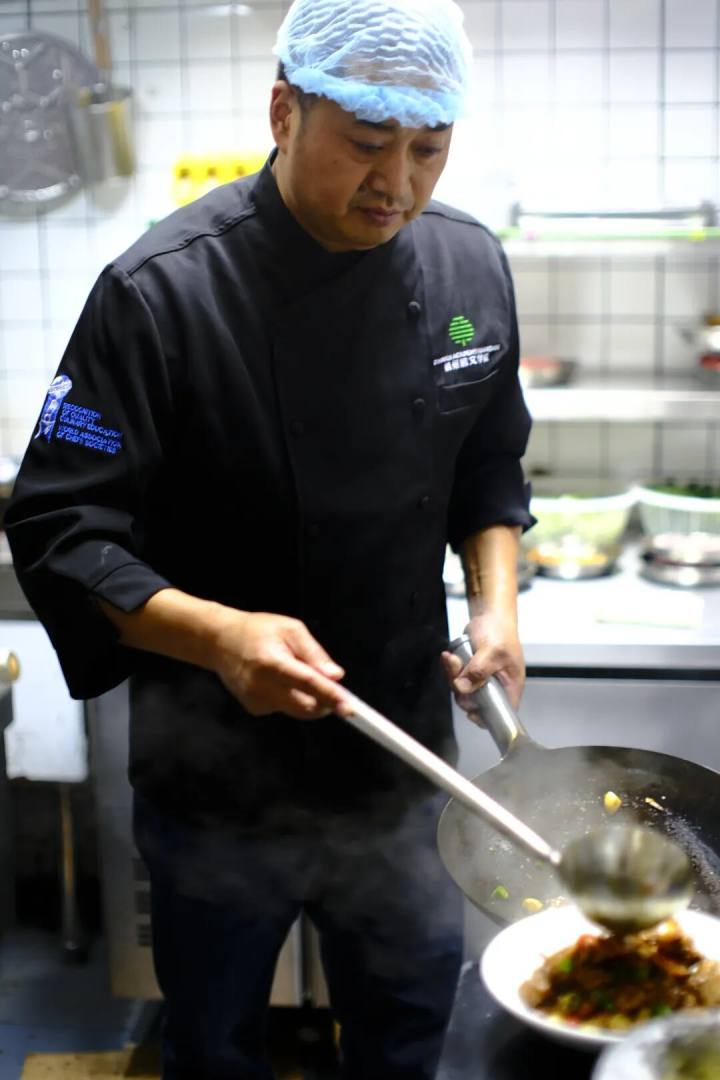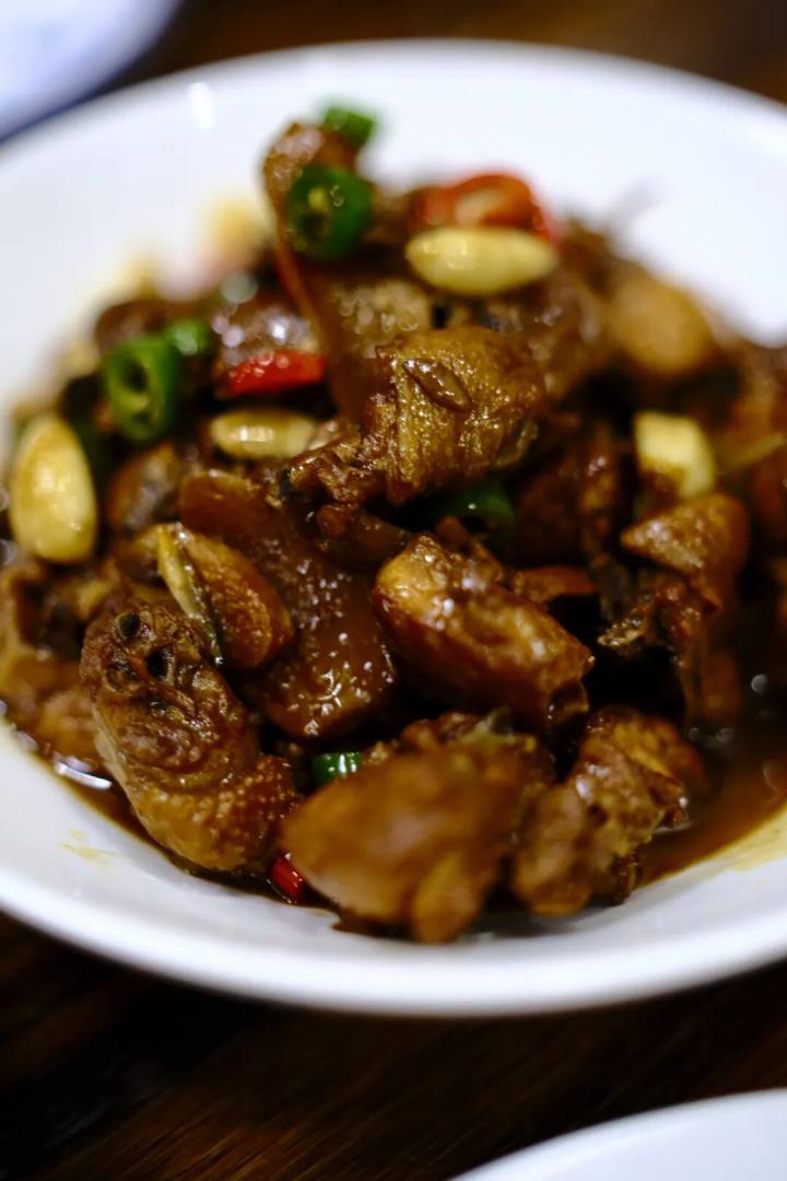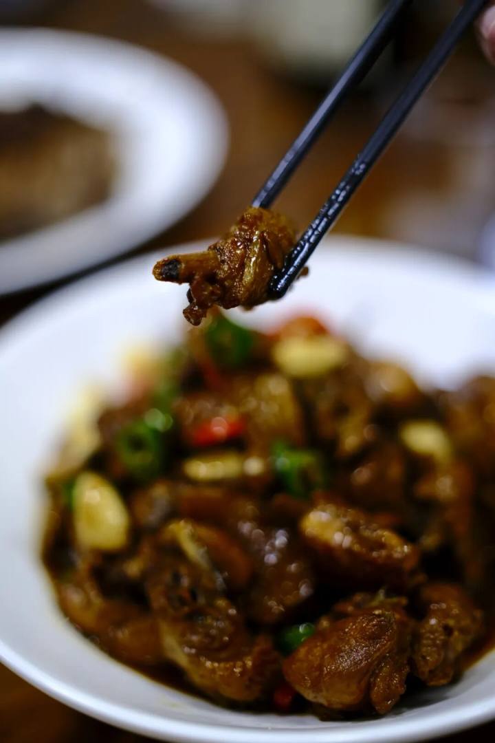 醋烧鸡是王丙兆从临安学的,鸡块斩件较大,以青红鲜椒、蒜头热油爆香,鸡块翻炒至微黄,料酒老抽提色,最后沿锅边淋入陈醋增香。