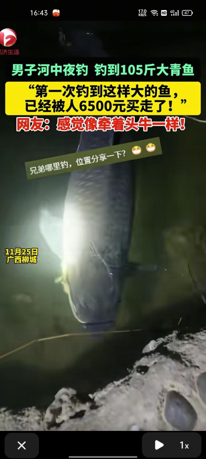 11月25日,柳州市柳城县。男子在店里河中夜钓,钓到105斤大青鱼。他表示,第一次钓到这么大的鱼,非常开心,已经被人以6500元买走了。网友称,感觉像牵着头牛一样。