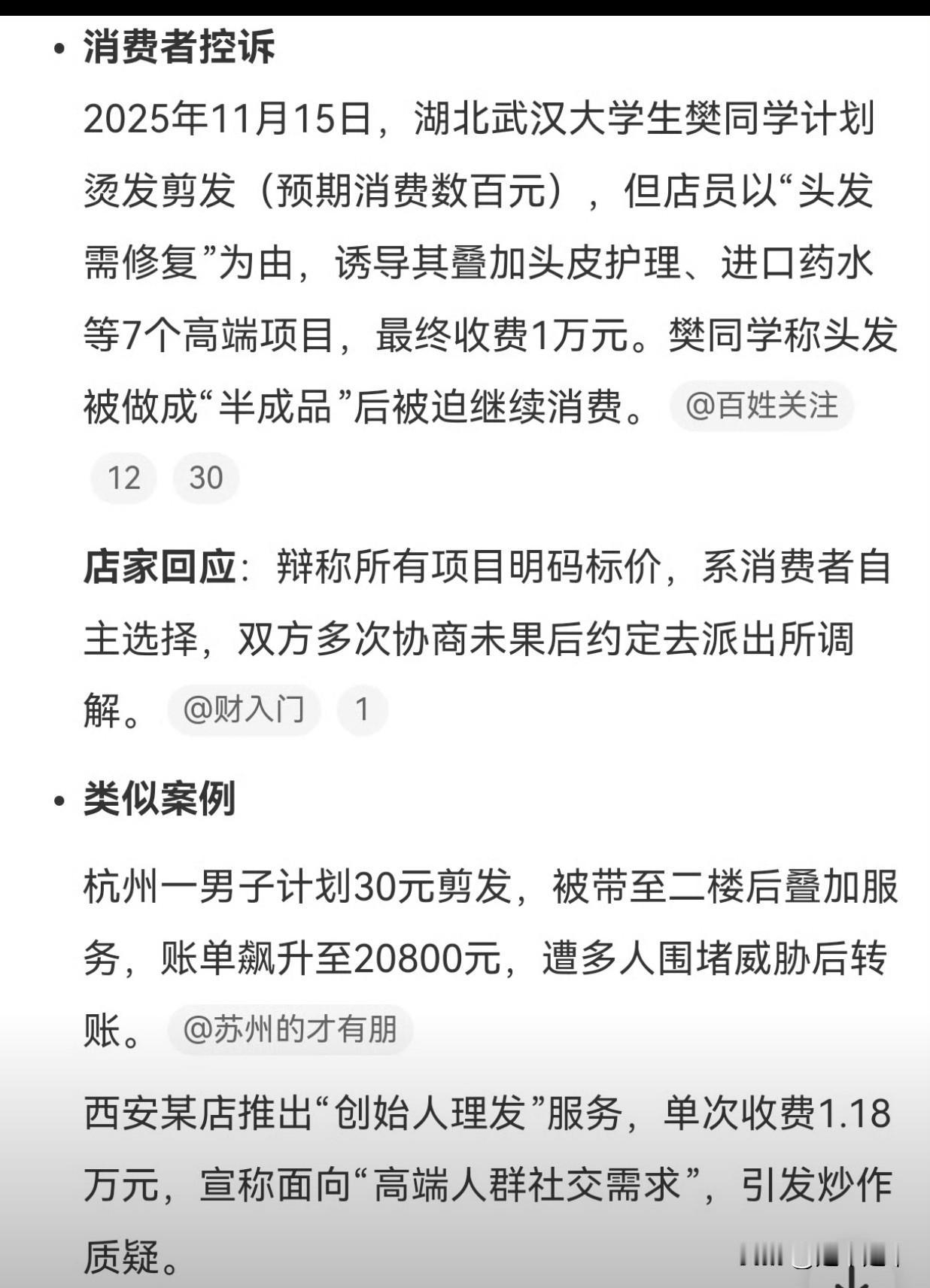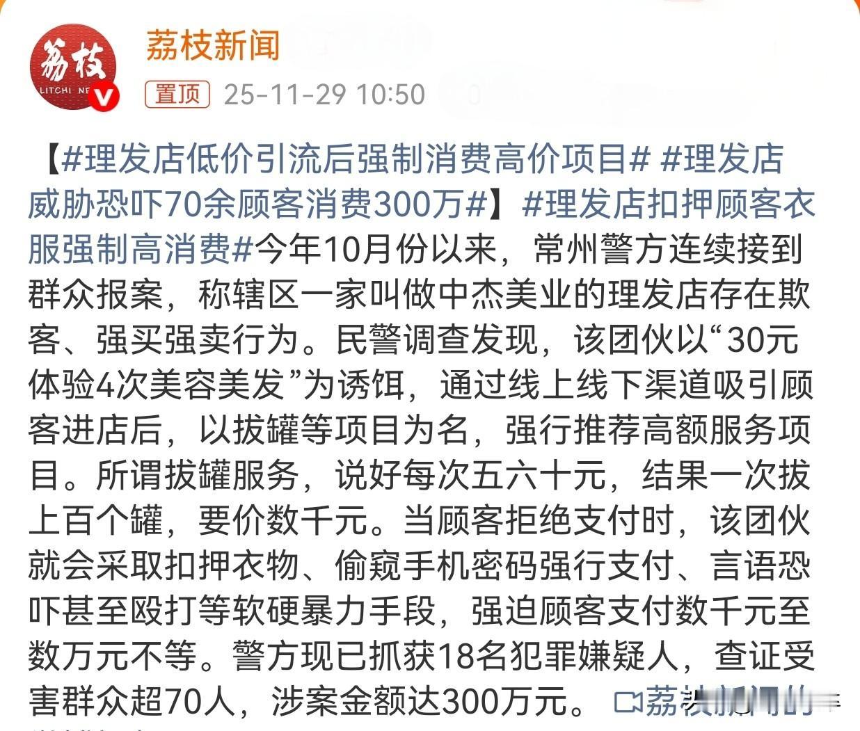 常州这次真的成“ℓ”州了🤣托尼老师持棍打劫! 一场以“30元体验卡”为诱饵的理发店骗局,竟演变成对70余名顾客的暴力劫持,扣押衣物、偷窥密码、言语恐吓甚至殴打等犯罪手段令人震惊,涉案金额高达300万元。 犯罪手法以低价诱饵。犯罪团伙以“30元享受4次美容美发”的体验卡线上线下引流,吸引顾客进店。后续以拔罐等名义虚增项目(单次拔上百个罐收费数千元)。对拒付者扣押衣物、偷窥手机密码强制转账,甚至实施殴打、威胁拍摄隐私照片。有周边商户证实[常看到顾客哭着离店]。截至25年11月,警方已抓获18名嫌疑人,查实70余名受害者,涉案金额300万元。 这样的消费陷阱全国各地都有,可使用暴力手段胁迫客户的还是首次曝光。给常州公安点赞👍他们打破了其他地方通常按消费纠纷调解的惯例,常州警方以强迫交易罪刑事立案把暴力宰客当刑事案件办理,这是对全国各地的司法部门来讲是个重要信号。 我们要时刻牢记贪小便宜等于吃大亏这句警示名言。那些看似可以“薅羊毛”的低价套餐,背后全是等着割韭菜的镰刀!咱们赚钱都不容易,理性消费不是抠门,是保护自己的钱包和人生的安全。作为消费者要破除“怕冲突”心理,及时报警是打破暴力宰客关键性的第一步。理发店价格陷阱 理发店遭天价