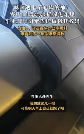 “零下11℃掰引擎救猫!”11月26日,吉林吉林市孙先生准备出门,听见车内传出微弱猫叫,发现一只流浪猫躲进引擎取暖;担心启动车辆会伤猫,他当场徒手掰碎护板,把瑟瑟发抖的小家伙抱了出来。网友:车可以修,命只有一条! 据荔枝新闻11月26日消息,孙先生先尝试引诱,小猫不肯出来,便直接上手拆护板;猫被抱出后又咬又挠,再次钻进电瓶车底。当晚零下11℃,他担心猫无处可去,便将猫带回办公室安置,提供水和食物。 视频里,引擎盖碎口清晰可见,小猫蜷在纸箱里舔水,孙先生一句“谁看见都会救”让弹幕刷屏;网友留言“这就是善良的样子”,并提醒冬季启动前先按喇叭或拍引擎盖,避免误伤取暖的小动物。 对于这件事情,大家有什么看法?