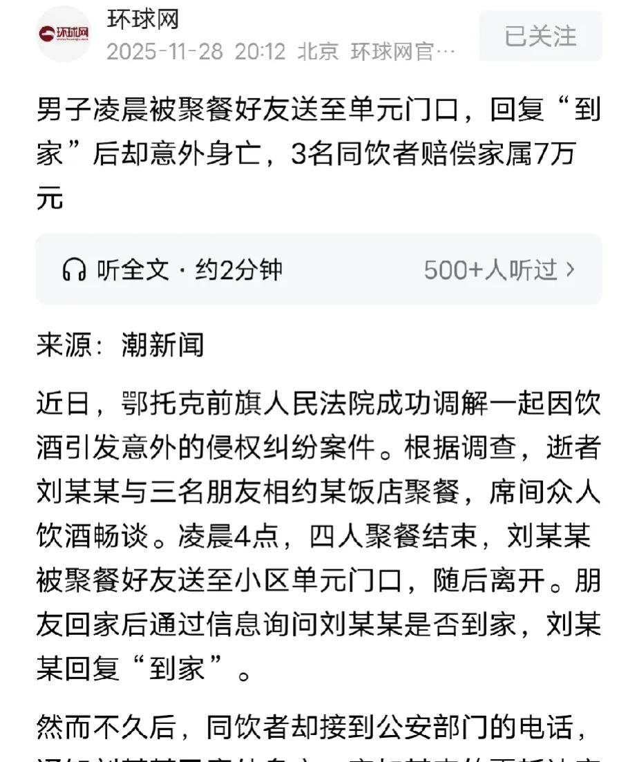 内蒙古,男子和3个好友聚餐喝酒,相谈甚欢,喝到凌晨4点才离去,3个好友把他送到单元门口后放心离去,之后男子给3个好友回信息“到家”。没想到,次日早上,3个好友接派出所电话称,男子意外身亡。家属悲痛欲绝,认为3个同饮者没把男子安全送到家,未尽到安全护送义务,告上法庭,要求3人共同赔偿20万元,3人辩称:已送到小区门口,而且他已经回复“到家”两个字,所以,不该赔偿。最终法院判决让人意外。 刘某有三个要好的朋友,平时几个人有事没事就喜欢出去玩玩,喝点小酒解闷。 某天晚上,几个好友因为闲来无事又开始在微信群里相互邀约,大家出去吃个饭,喝两杯再回来。 他们4个人到某酒店订了一桌子菜,边吃饭边聊天,为了助兴又点了几瓶酒。 因为大家好久没聚了,这一次玩得有些晚,他们一直从晚上7点左右喝到次日凌晨4点,才依依不舍离开酒店。 4个人都喝了不少酒,从酒店出来,大家走路都有点摇摇晃晃的,尤其是刘某,他最活跃,喝得最多,而且不胜酒力。 朋友们怕刘某出事,三个人一起把刘某护送回家,刘某可能喝醉了,嘴里一直嚷嚷着说,自己能行,不用送,还开玩笑说,如果坚持要送,到家了再上去喝两杯。 一路上,几个人有说有笑,气氛很开心活跃。 不知不觉,他们来到刘某所住的小区单元门口,三人问刘某自己进去能行不? 刘某肯定地回答说,当然没问题,还反问他们,都到小区门口了,离家还有多远? 三个好友想着,既然已经到小区门口了,应该不会再出现任何闪失,所以他们目送着刘某走进去之后便离开了。 回家途中,三个朋友不放心又在群里问刘某,安全到家了没? 刘某回了两个字说“到家”。 之后三个朋友也放心地各自回家,本来以为一场开心的聚餐到这里就结束了,之后有空再聚。 可谁也没想到,第二天清晨,三个好友突然接到公安部门电话说,刘某出意外身亡了。 这个消息犹如晴天霹雳,他们都懵了,昨晚不是已经把他送到单元楼门口了吗,而且他说安全到家了,这是怎么回事? 对朋友的突然离去,三个好友除了震惊更多的是心痛和惋惜,谁都不希望发生这样的事,他们甚至有些懊恼,当时应该把他送进家门,让他睡下才离开。 而刘某家属更是伤心不已,好端端的一个人,出去喝个酒回来,人没了,除了伤心,他们更多的是不理解那三个朋友,已经送到单元楼门口了,为何就不能多走几步路把他安全送进家门? 家属一致认为,刘某的死,于情于理,三个好友都脱不了干系,所以,办理完刘某的后事,家属把三个好友告上法庭,要求他们共同赔偿20万元。 三个好友觉得很冤,法庭上他们辩称,饮酒过程中并未劝酒,酒后他们也把刘某送到单元楼门口,而且刘某到家后还给他们发信息“到家”。 这说明,刘某当时是有一定的意识,而且刘某作为完全民事行为能力人,应该自行承担责任,又于他们三人何干? 法庭上双方争论不休,情绪对立,调解一度进入僵局。 法官经过多次调解,沟通、开导三位好友,最终,双方谈妥,三个人共同赔偿家属7万元,当场支付了一部分,家属对调解结果表示接受。 有人说,这3个好友很冤,该做的都做了,最后还要赔钱,是不是谁死谁有理? 有人不禁反问,个个都要送,最后一个让谁来送,如果最后一个出事了,其他人需不需要担责? 所以说,一起喝酒的,只要出了事同饮者就得担责,不管你劝没劝酒? 那么,从法律角度如何分析这个事件呢? 《民法典》第1165条规定,行为人因过错侵害他人民事权益造成损害的,应当承担侵权责任。 依照法律规定推定行为人有过错,其不能证明自己没有过错的,应当承担侵权责任。 本案中,三名同饮者虽将刘某送至单元门口,但未核实其实际安全到家,仅凭“到家”的信息便离开,未尽到醉酒同伴的照顾、护送义务,存在明显过错。 刘某醉酒后判断和行动能力受损,同饮者应预见仅送至单元门口的风险却未采取进一步措施,该过错与刘某意外身亡存在因果关系,因此需依此条款承担侵权赔偿责任。 另外,《民法典》第1198条规定,宾馆、商场等经营场所、公共场所的经营者、管理者或群众性活动组织者,未尽到安全保障义务造成他人损害的,应承担侵权责任。 共同饮酒属于特殊社交活动,同饮者间形成情谊性安全保障义务,与该条款的安全保障法理相通。 本案中,三名同饮者作为共同饮酒的参与者,对醉酒的刘某负有护送、保障其安全的义务,却未完全履行,属于未尽安全保障义务的情形。 法院据此调解确定7万元赔偿,正是对该义务的司法认定,三名同饮者需依此条款的法理承担相应责任。 这事儿真是给所有人提了个醒!喝酒聚会图的是开心,可千万别忽视了身边醉酒的朋友,把他安全送到家,或者交给家属真花不了多长时间。 法律上的情谊义务不是空话,一时疏忽可能酿成悲剧,还得担责任。 以后不管跟谁喝酒,都得把“安全”放在第一位,别让开心的聚会变成一辈子的遗憾,这才是对朋友、对自己最负责的做法! @猫眼学法