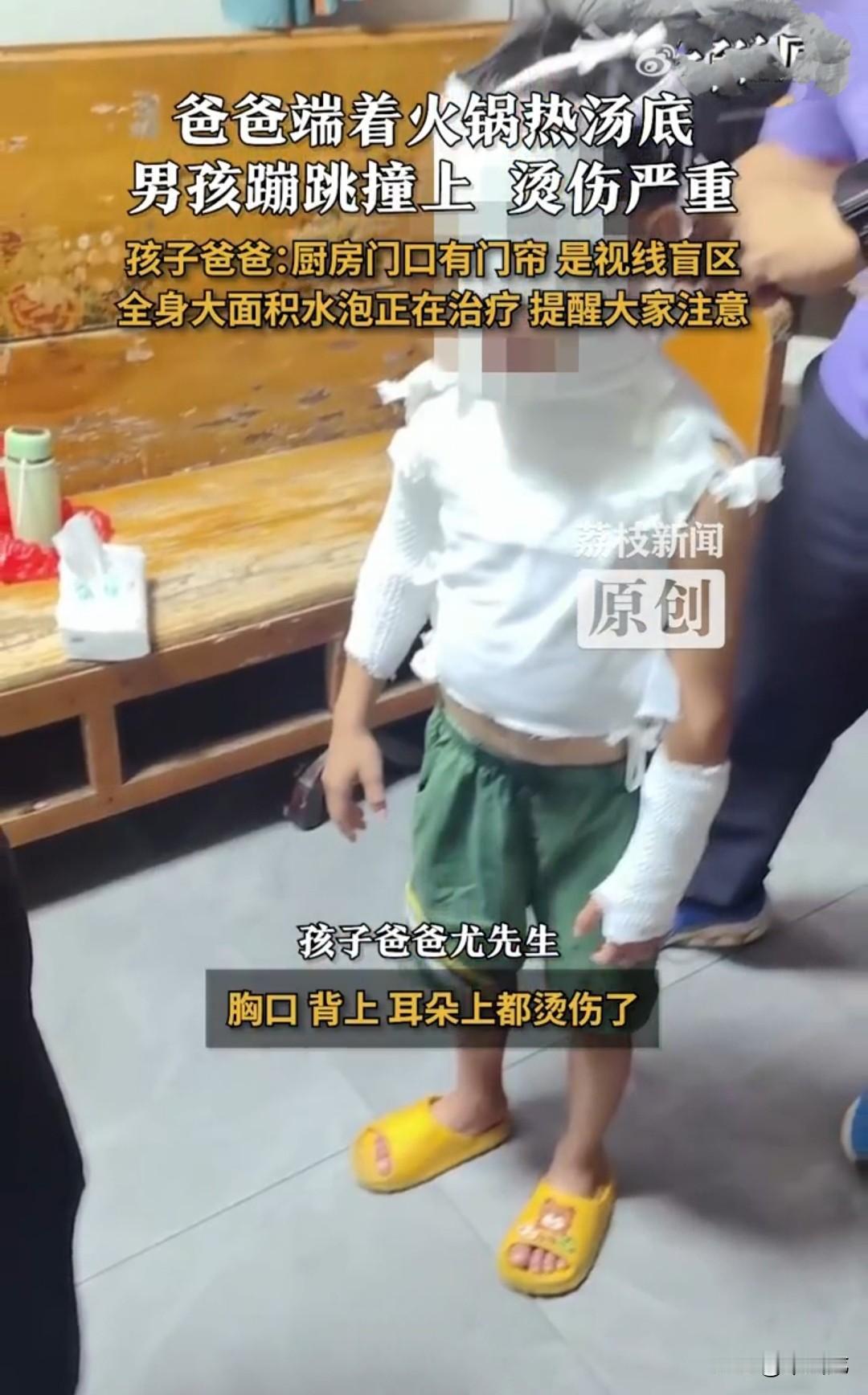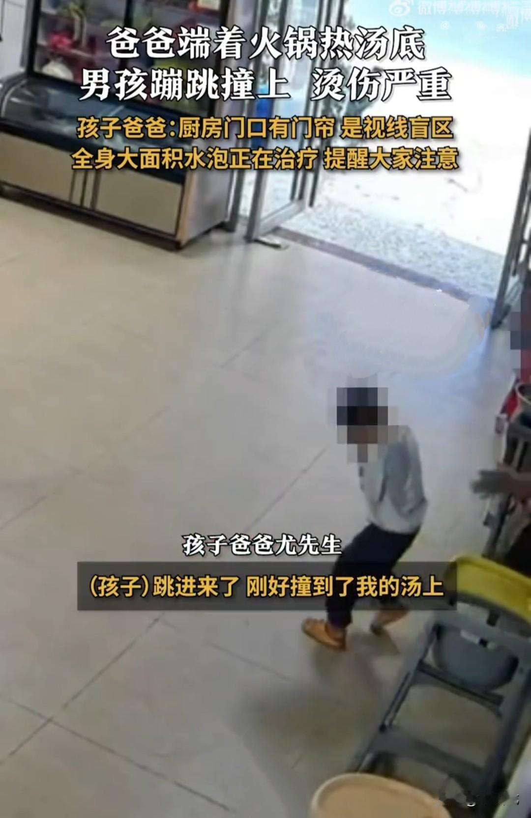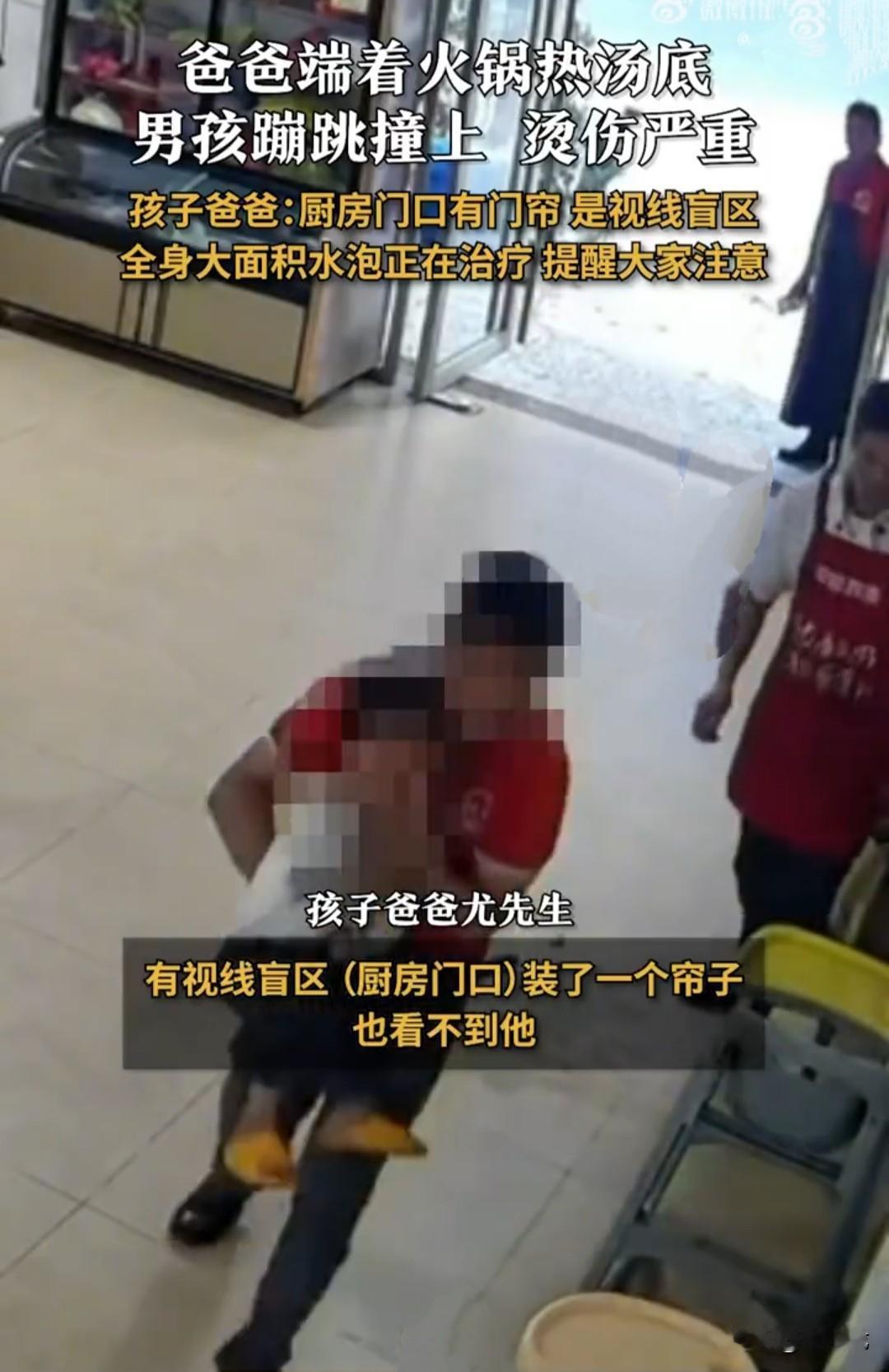 6岁儿子想吃火锅,老爸就在自家餐馆厨房弄汤底,汤底弄好后老爸抬着出来,走到厨房门口跟儿子狭路相撞,听到一声撕心裂肺地惨叫,滚烫的汤汁泼到儿子胸部和耳朵上,全身被烫出大面积水泡,目前还在治疗中。 据老爸介绍,汤底弄好后抬着出来时,儿子也蹦蹦跳跳地跑着进厨房,因为厨房有门帘,儿子个子小,出现了视觉盲区,双方都未能发现彼此。儿子不幸撞在了汤锅上,滚烫的汤汁溅出,浇到了儿子胸部、脖子和手臂上,造成严重烫伤。 出现这种意外,老爸既心痛又自责。在给儿子治疗的同时,也给公众提了一个醒,以后抬滚烫的东西,一定要百倍警惕,要时刻关注着四周的动向,最好高喊着预警。 像这种火锅餐饮店,服务员上菜时千万要小心,最要提防小孩子乱跑乱窜,不管撞上自家孩子还是别人家孩子,都会闯出难以弥补的大祸。 端着汤锅进这种有门帘的房间时,最好转过身来背着进,一来防止撞到人,二来不会将门帘弄脏。 幸好不是可怜的打工者碰上这种事,不然的话,辛辛苦苦赚的打工钱,还不够赔偿孩子医疗费,还有可能被炒鱿鱼。 (素材来源:荔枝新闻)
