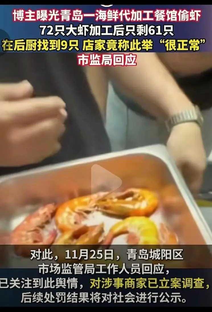 10年前的青岛大虾事件,还没消除影响,现在又出了大虾事件。 几名游客在青岛把72只大虾交给某饭店加工。蒸熟端出来只有61只。 数量足足少了七分之一。 也就是说,你给他们180元的货,他端出来的只有80多元。 剩下的,他们私自截留了。 关键是这位老板说,这在饭店都很正常。 这就让人很不明白了。 到底是青岛的饭店都是这样,还是老板胡说八道? 我们这儿也有买回海鲜到饭店加工的,只收加工费而不会缺少数量。 从2015年的青岛大虾事件后,坊间就流传,到青岛不吃虾。看来10年过去了,到青岛还是真的不能吃虾。 可是,到青岛不吃虾,又能吃什么呢?吃什么才不会被砍一刀? 对这种不良奸商,不是罚款了事了,除了罚款,还应该吊销其营业执照。否则,以后还会有这类奸商出现。