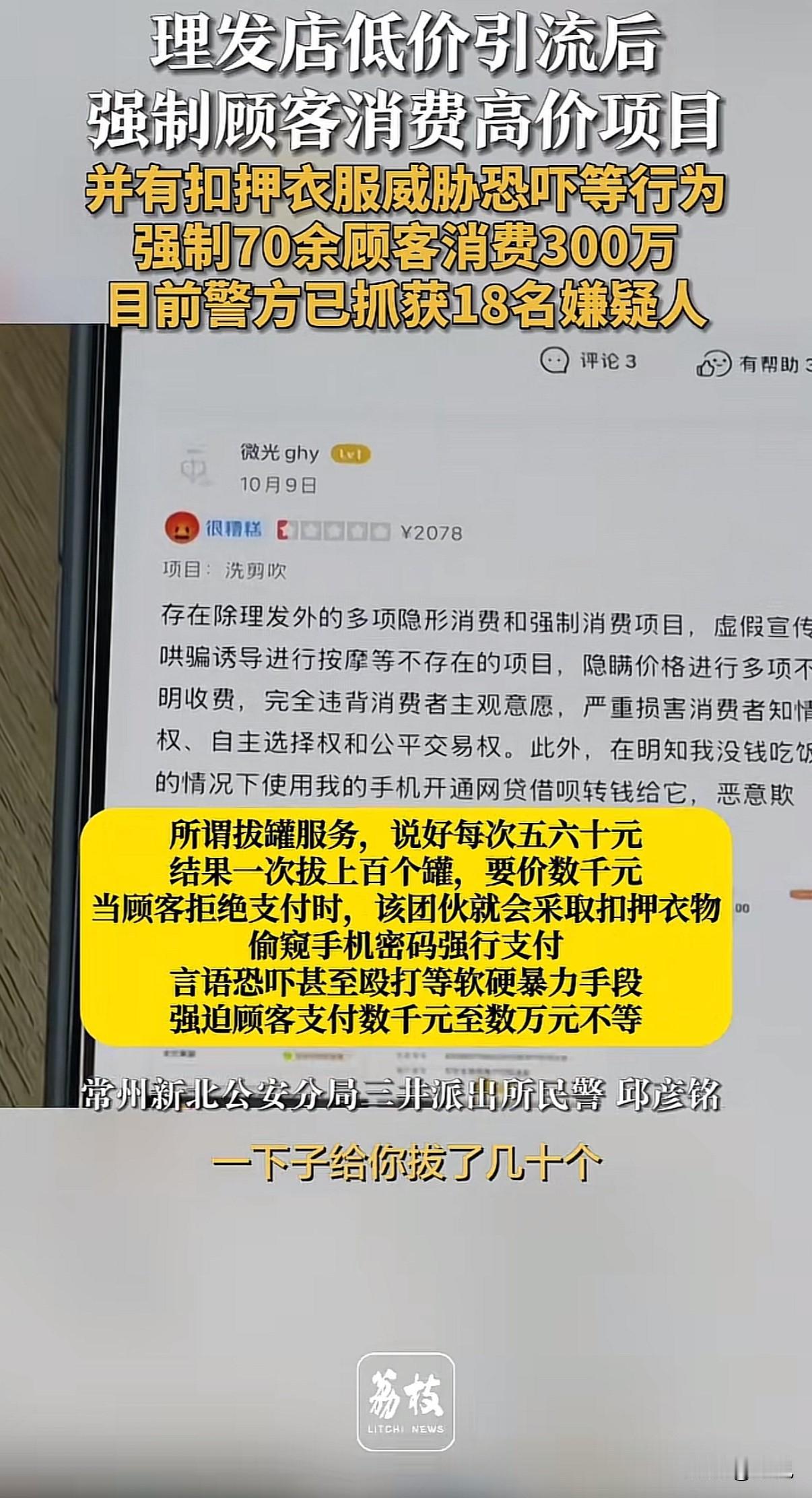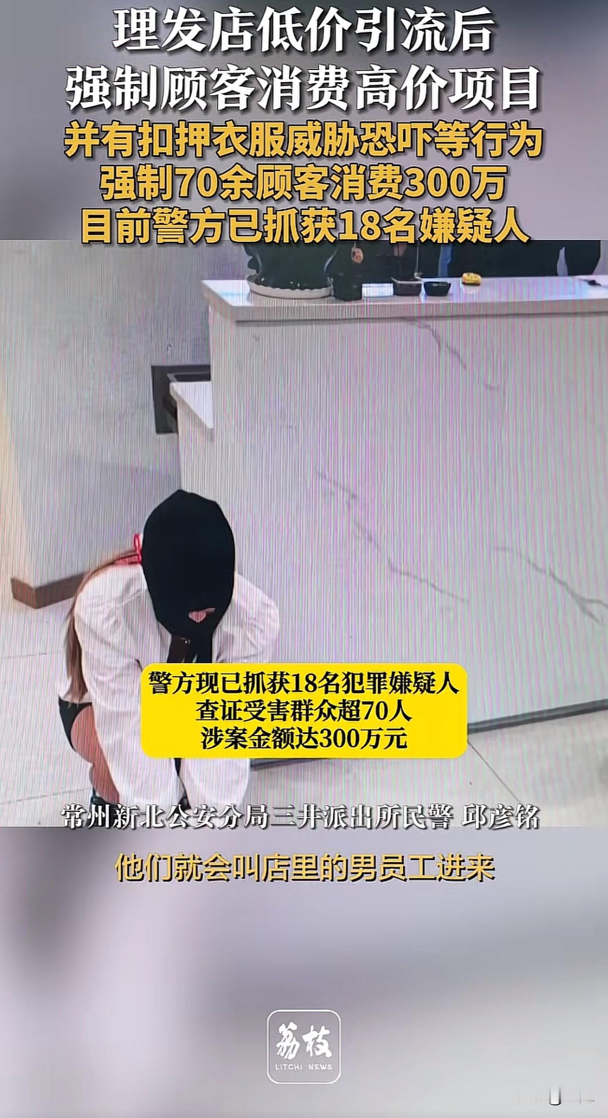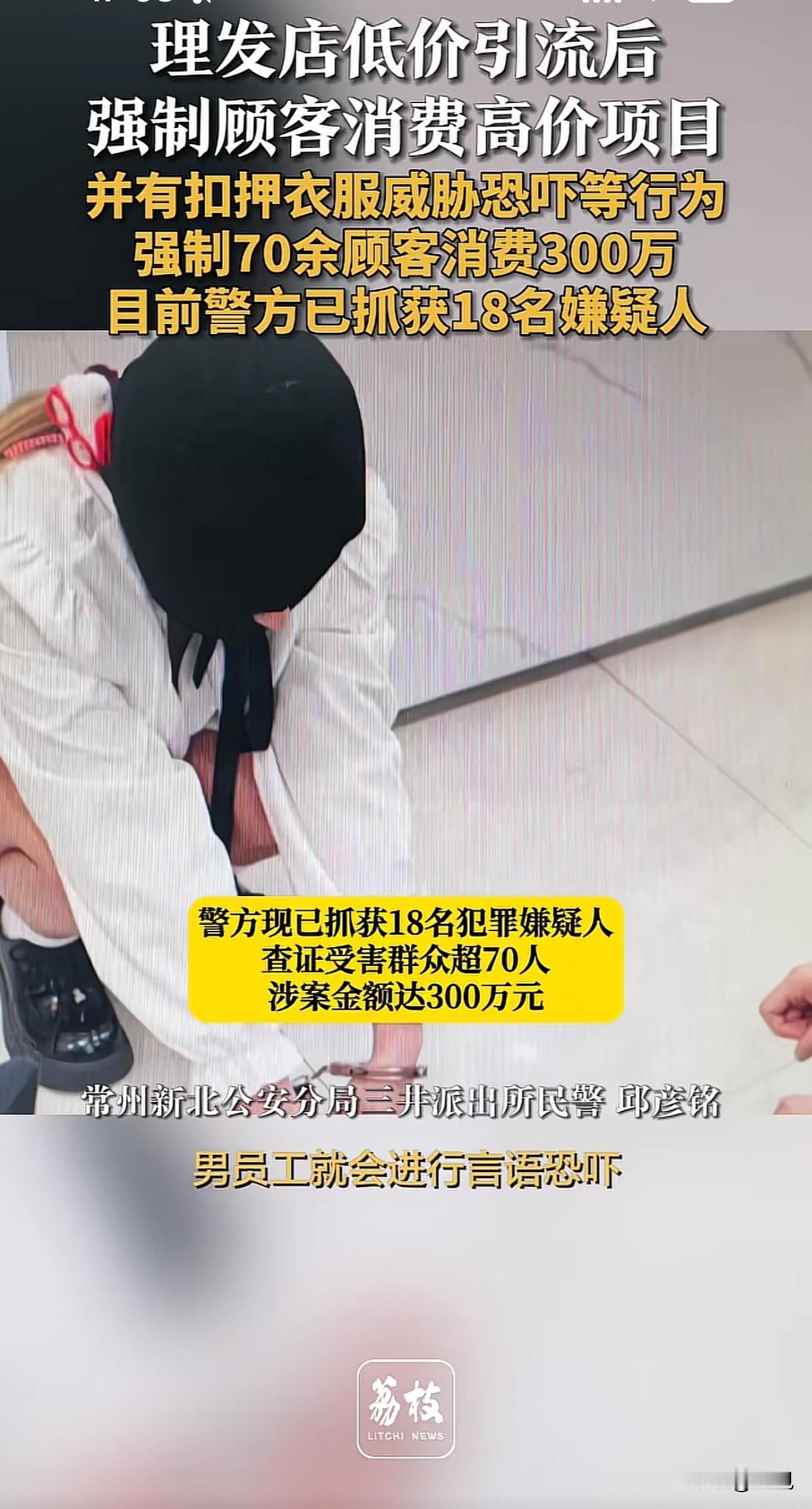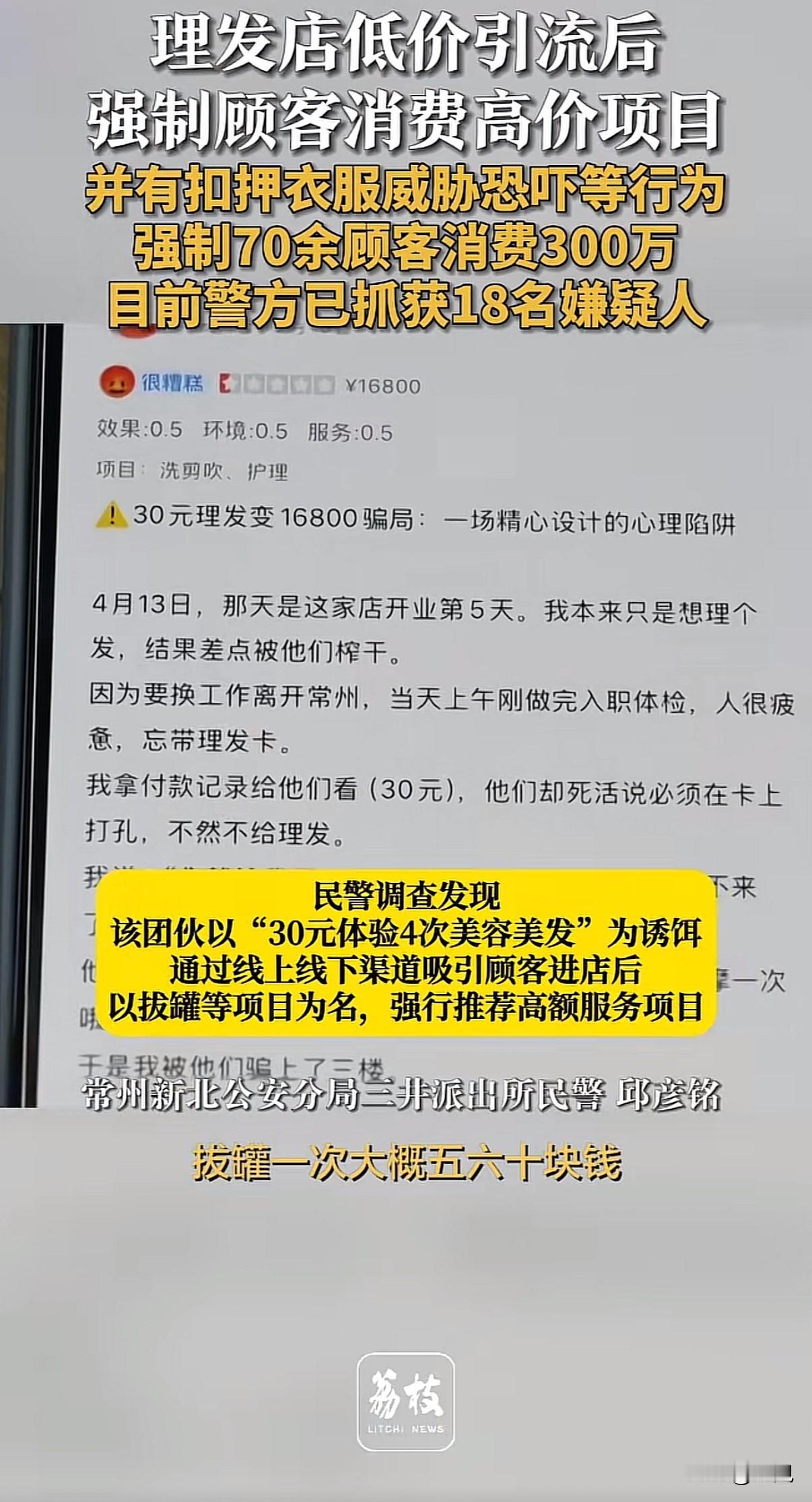 30元体验4次美发?常州一家理发店让70多人花了300万,有人出来时脸上还挂着泪。 这事就发生在常州中杰美发店。他们用“30元体验4次”的优惠卡吸引顾客上门,等客人躺到美容床上,事情就完全变样了。 一位大学生回忆,店员边给她梳头边说:“你头发问题很严重,不做护理以后会掉光。”她还没反应过来,已经被带到里间做头皮检测。 检测结果让她心惊肉跳。“你看,毛囊全堵了,现在不做修复,过两年准秃头。”店员语气严肃。 她犹豫时,店员已经打开一瓶护理液:“我们先做一次试试,原价588,给你体验价288。” 做完护理,账单让她傻眼了。“不是288吗?” 店员指着价目表:“288是一支的价格,你用了六支,加上服务费,总共1988。” 她想理论,三个男店员围过来。其中一个拿起她的手机:“密码多少?自己输还是我帮你?” 最后她被迫转走两个月的生活费。走出店门时,腿还在发抖。 拔罐项目更是离谱。说好60元一次,结果一次给顾客拔了上百个罐。 “你这湿气太重了,不排出来要得大病的。”美容师边拔罐边吓唬一位老人。 拔完罐结账,店员拿出计算器:“一个罐子50元,你用了120个,共6000元。” 老人惊得站起来:“不是说好60吗?” 店员冷笑:“60是一个罐子的价钱,谁跟你说全背60了?” 老人的外套被扣在储物柜,手机被店员“保管”着。最后他不得不交出银行卡,刷走了四个月养老金。 店里有个规矩:专挑好说话的客人下手。学生、年轻女孩、老年人是主要目标。这些人往往脸皮薄,不敢激烈反抗。 有个姑娘被逼到墙角,店员偷看到她输入支付密码,直接拿过手机操作转账。转完还“贴心”地说:“我们这是为你好,美丽是需要投资的。” 更可怕的是,有顾客反映,做护理时被偷偷拍照。“不付钱就把你这些丑照发到网上。”店员这样威胁。 周边商铺的员工说,经常看到有人红着眼睛从理发店出来。“有个女孩边走边哭,妆都花了。” 这家店开了不到半年,却让那么多人心甘情愿掏出几千几万?真相是,没有一笔交易是心甘情愿的。 警方调查发现,他们有一套完整的话术本。从如何吸引顾客进店,到怎样层层加码推销,再到最后威胁手段,每个环节都设计好了。 现在18个人被抓了,店也关了。但留给我们的思考很多:为什么这样的店能存在这么久?为什么那么多受害者不敢第一时间报警? 或许,正是因为抓住了人们“破财消灾”的心理,这帮人才如此肆无忌惮。 下次遇到“优惠得离谱”的服务,真要多个心眼了。天上不会掉馅饼,但地上确实有陷阱。